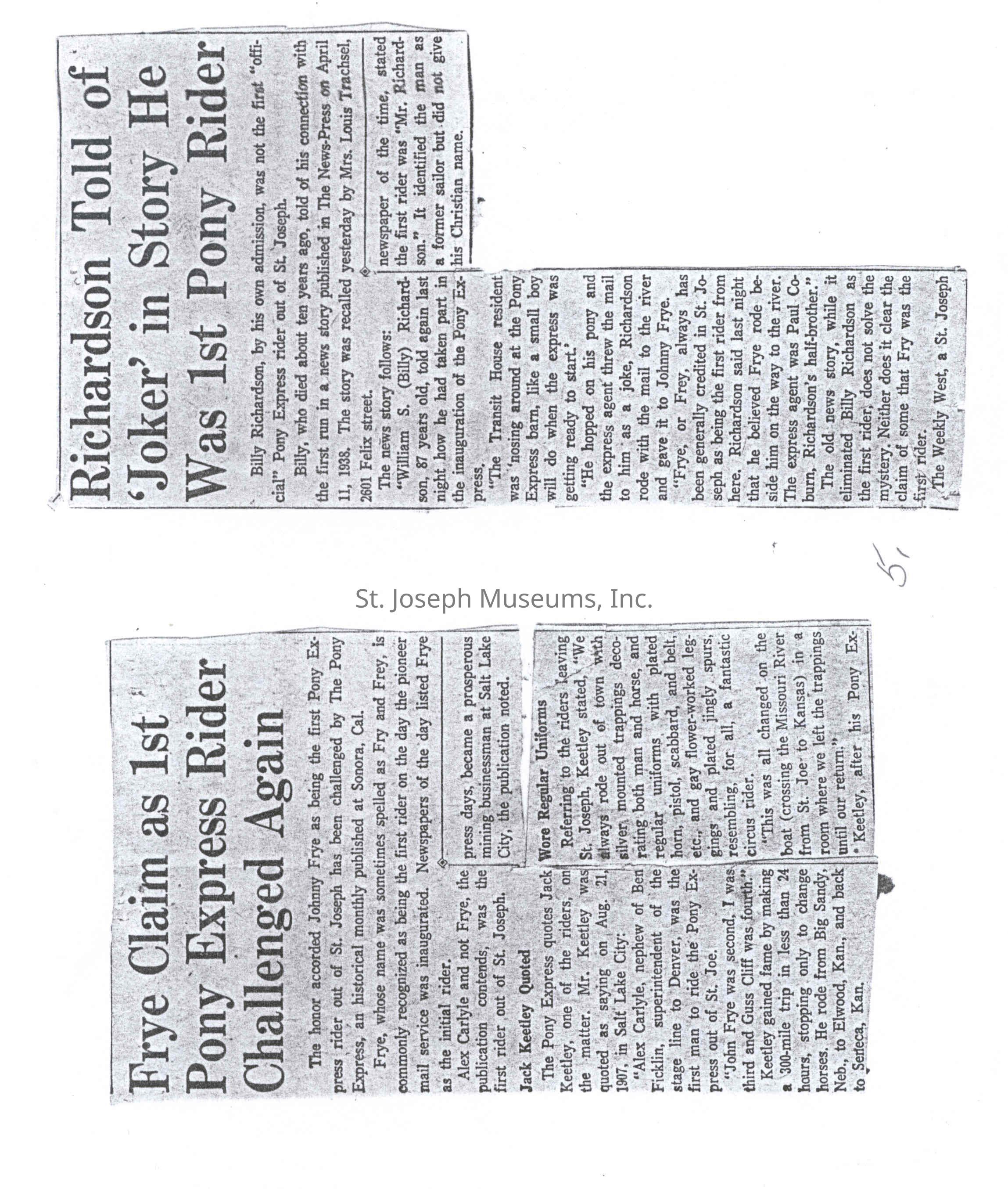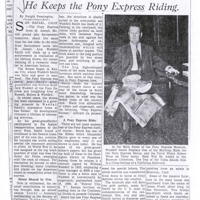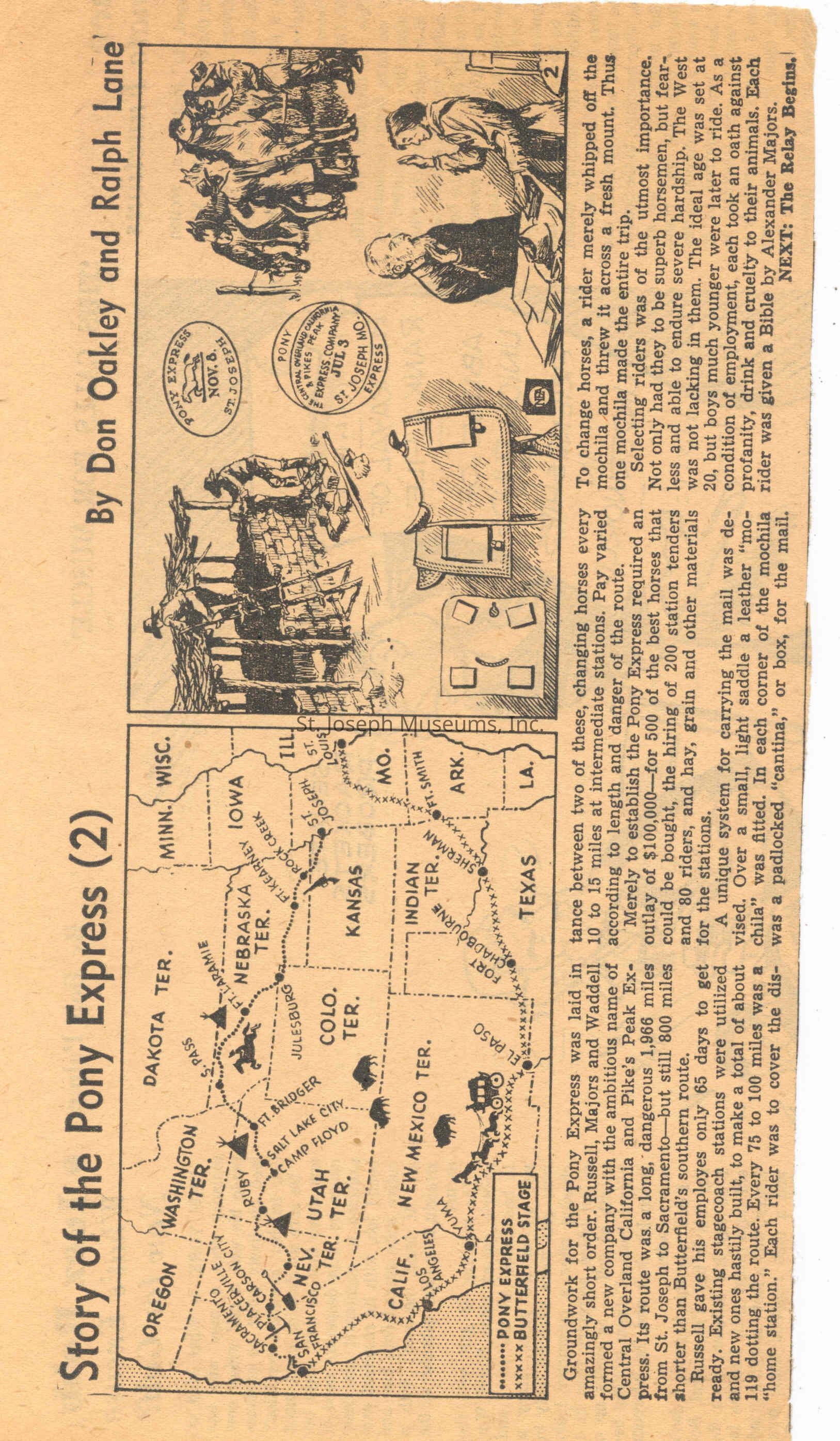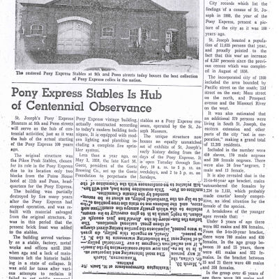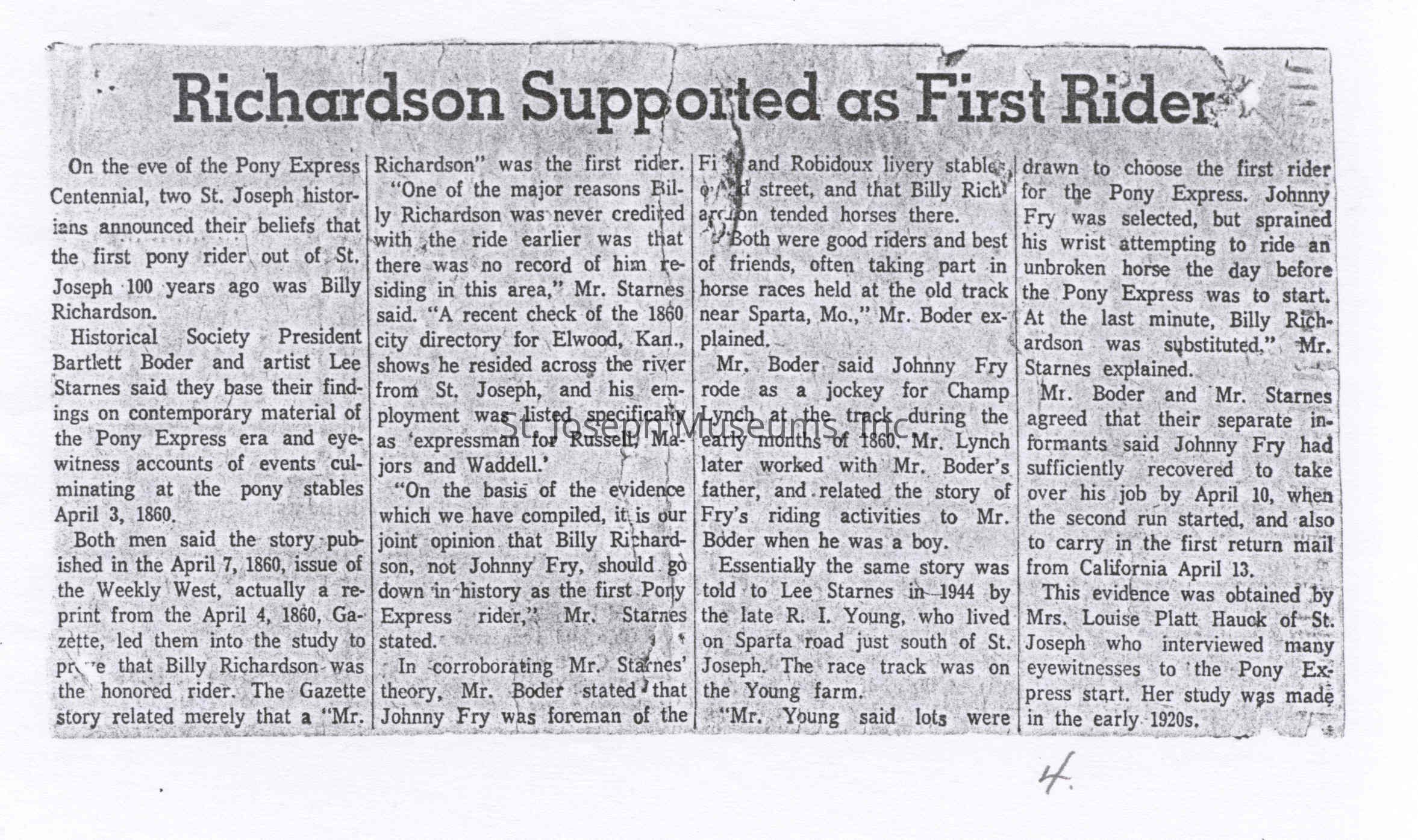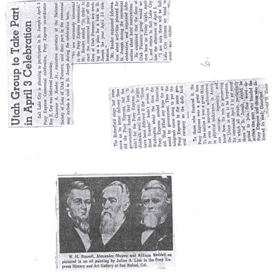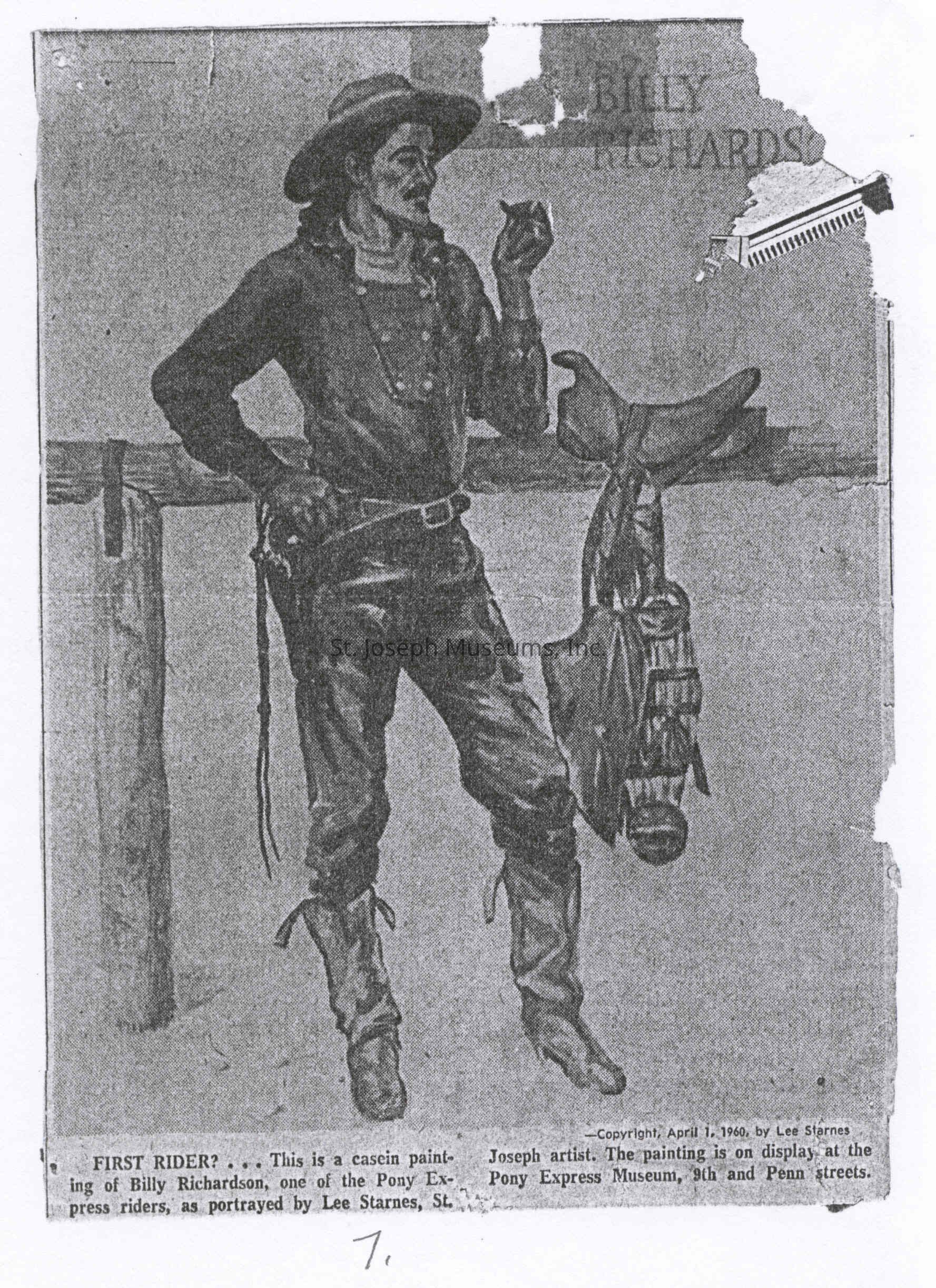 Files contain correspondence with Pony Rider descendants, Pony Express rider biographies, newspaper clippings related to the Pony Express, and miscellaneous records, photos, and documents collected from major private and University libraries among other sources. NOTE ABOUT ORIGIN OF LIBRARIES FILE. Prior to the opening of the renovated Pony Express Museum in 1993, St. Joseph Museum staff did extensive research on the Pony Express. All of the libraries in this folder were visited and copies of all material related to the Pony Express were made. This was done from 1991 to 1993. Information from this research was used in the new exhibits of the Pony Express Museum and in preparation of the book On the Winds of Destiny. In 2015, the file from the Pony Express Museum was added. Jackie Lewin 7/27/15 CD containing scans of actual documents found in Pony Express Research Files located in file cabinets in Document Storage II area.