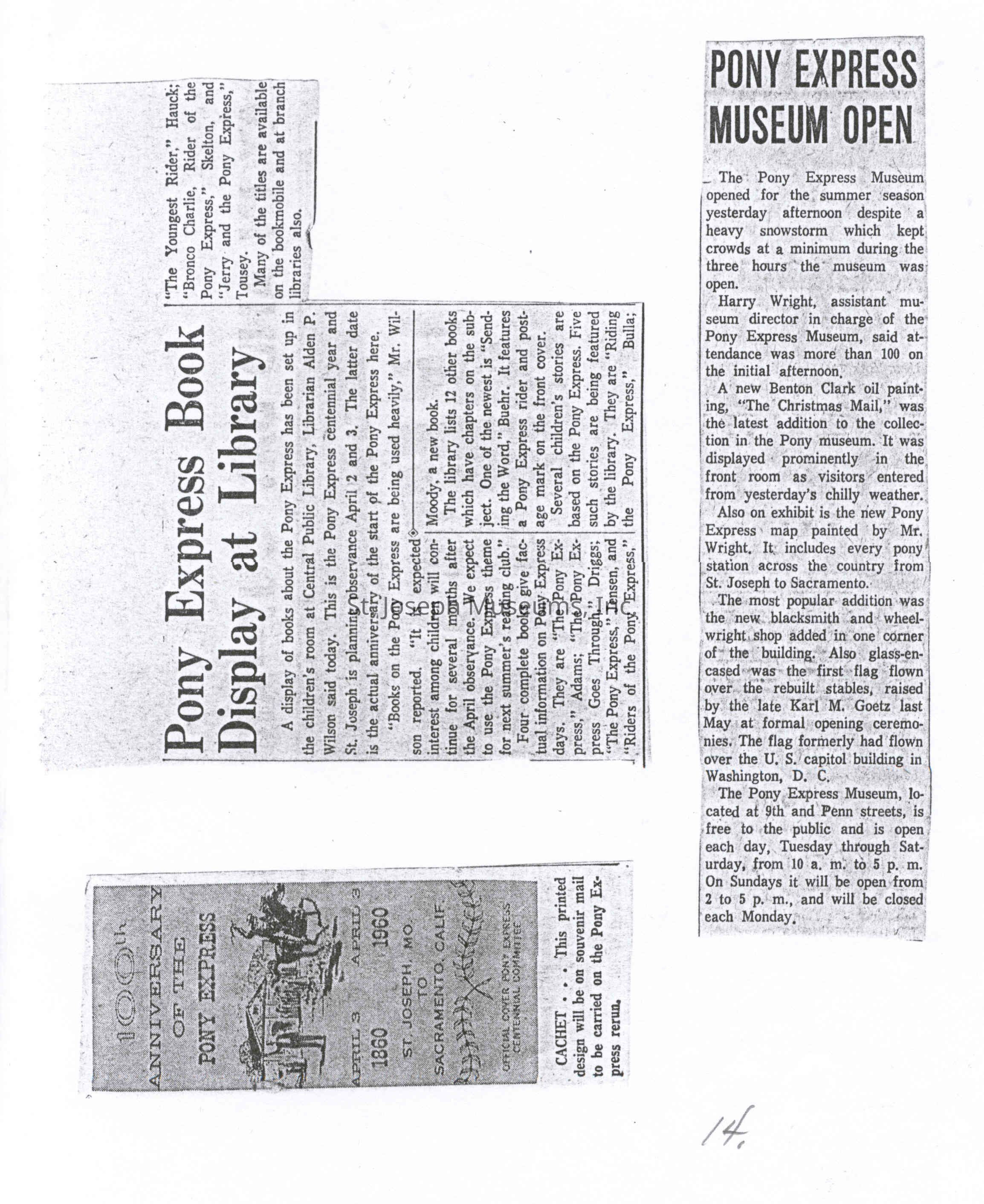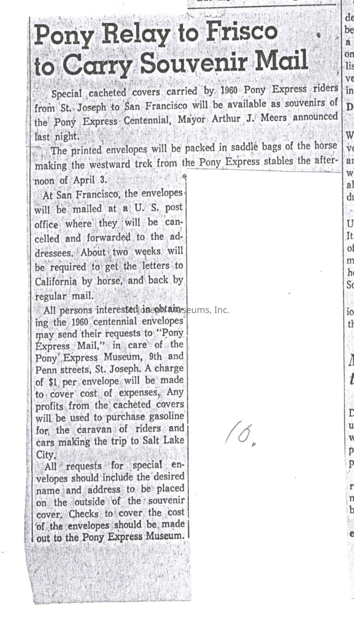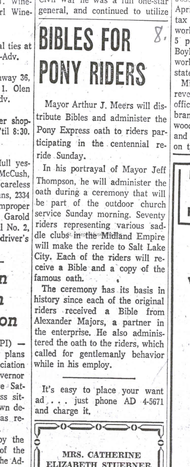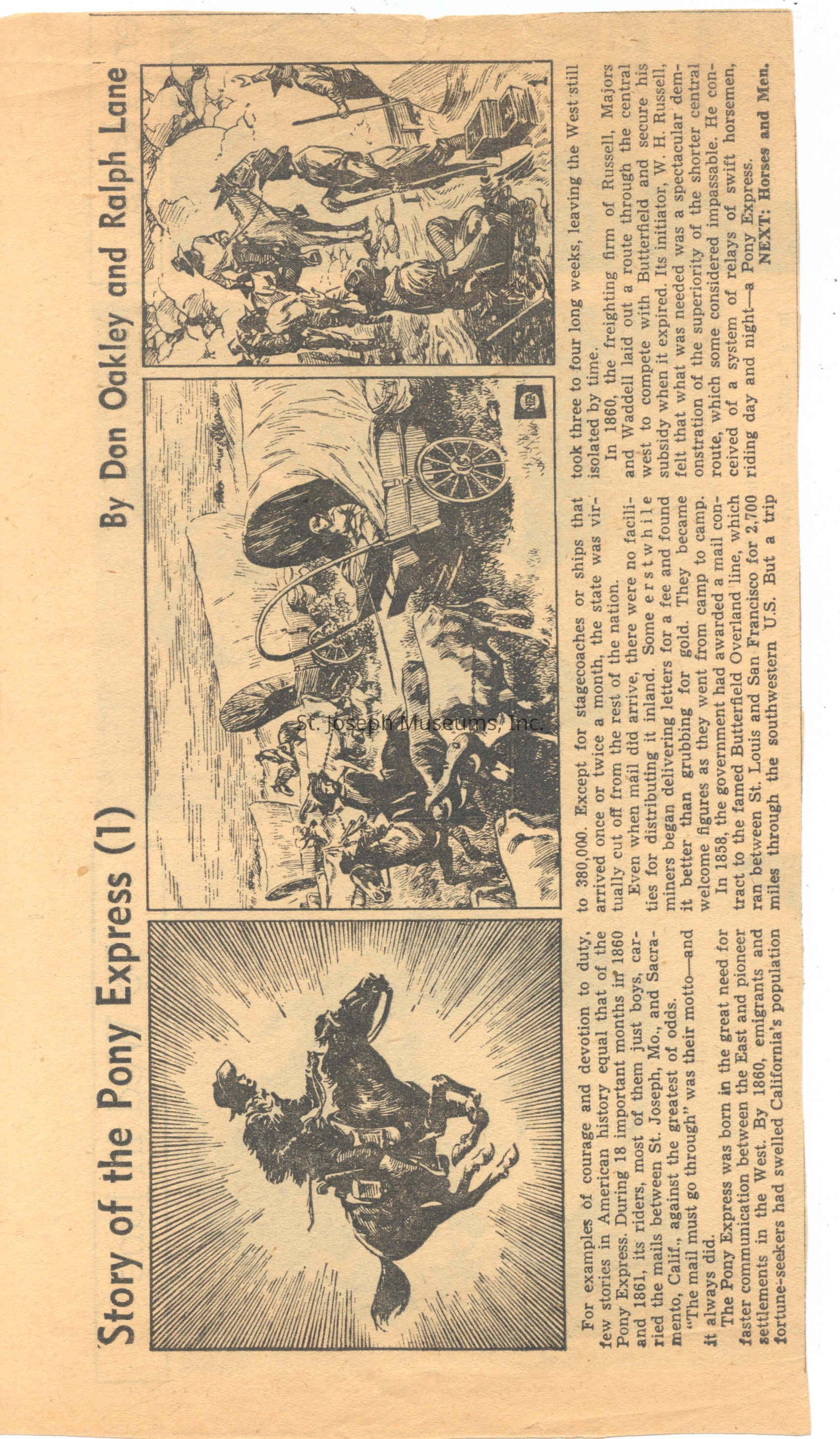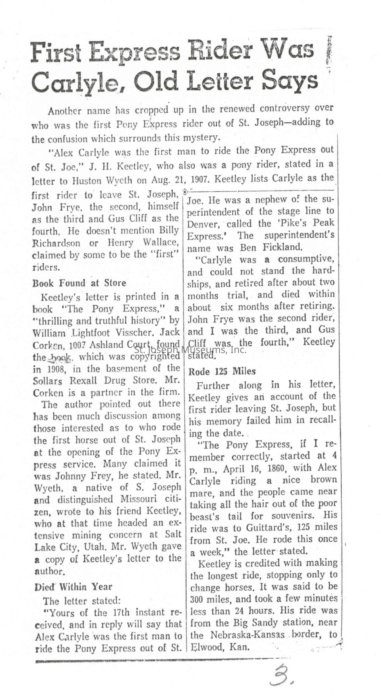 Files contain correspondence with Pony Rider descendants, Pony Express rider biographies, newspaper clippings related to the Pony Express, and miscellaneous records, photos, and documents collected from major private and University libraries among other sources. NOTE ABOUT ORIGIN OF LIBRARIES FILE. Prior to the opening of the renovated Pony Express Museum in 1993, St. Joseph Museum staff did extensive research on the Pony Express. All of the libraries in this folder were visited and copies of all material related to the Pony Express were made. This was done from 1991 to 1993. Information from this research was used in the new exhibits of the Pony Express Museum and in preparation of the book On the Winds of Destiny. In 2015, the file from the Pony Express Museum was added. Jackie Lewin 7/27/15 CD containing scans of actual documents found in Pony Express Research Files located in file cabinets in Document Storage II area.