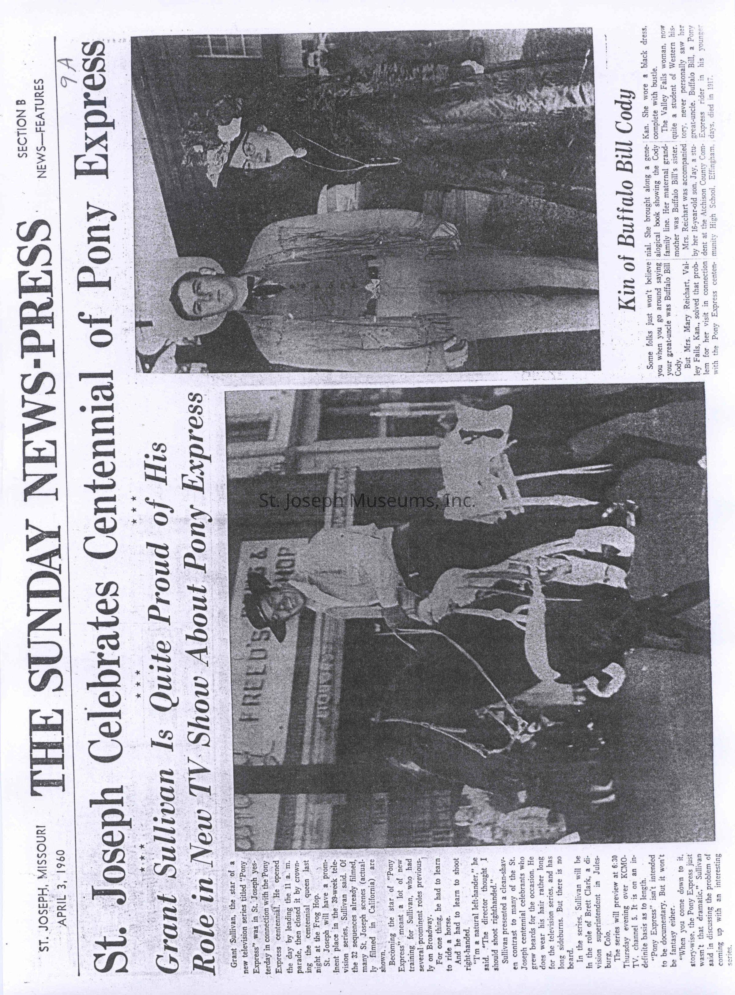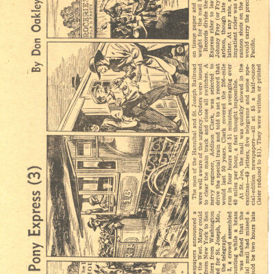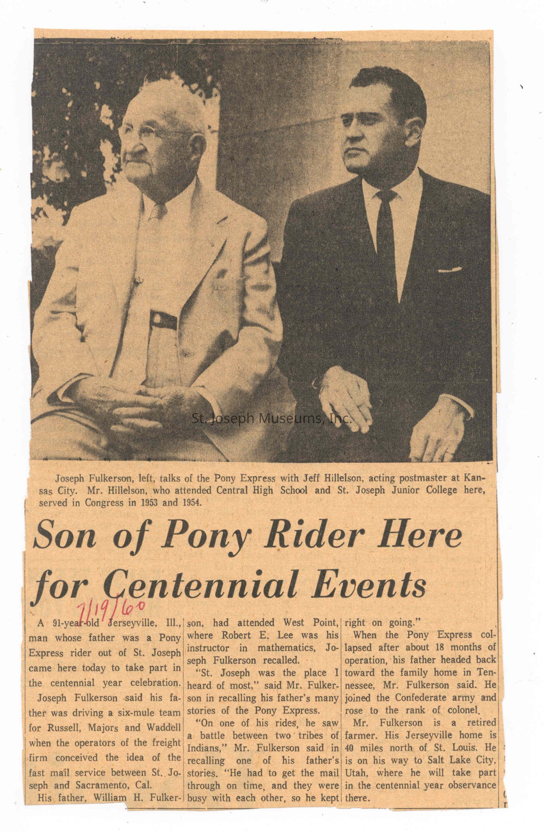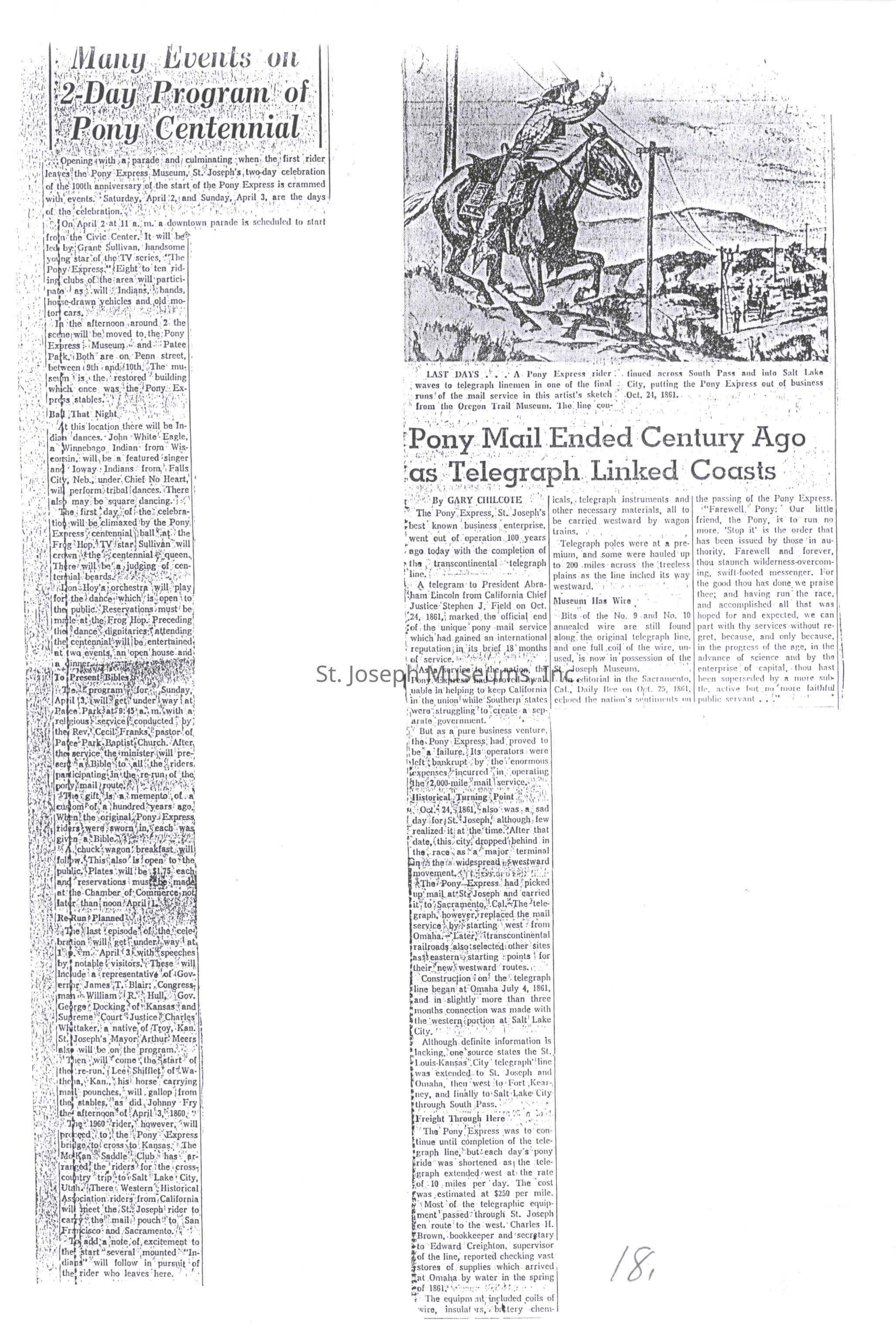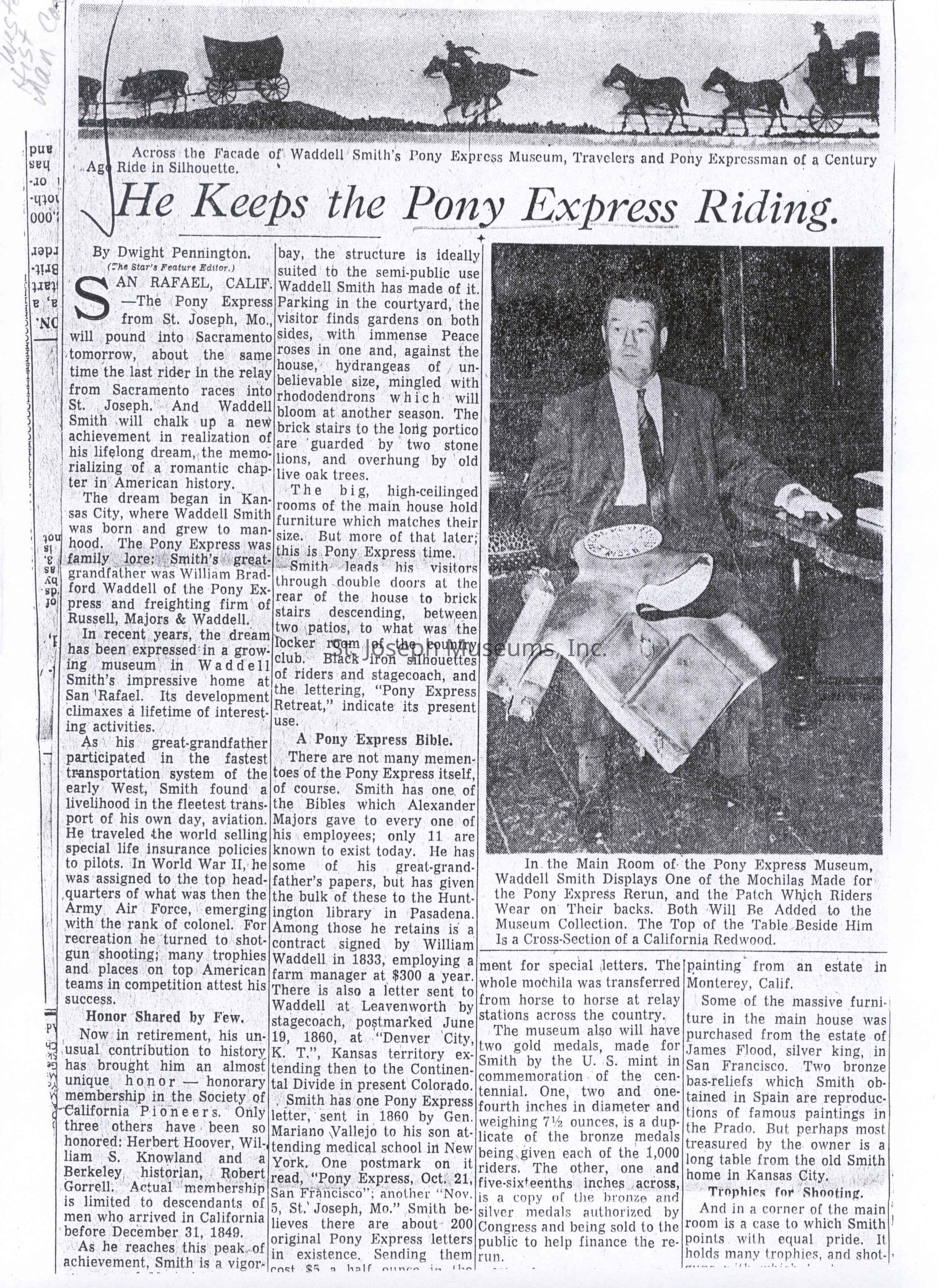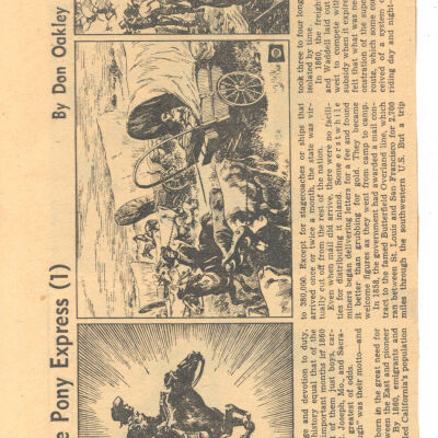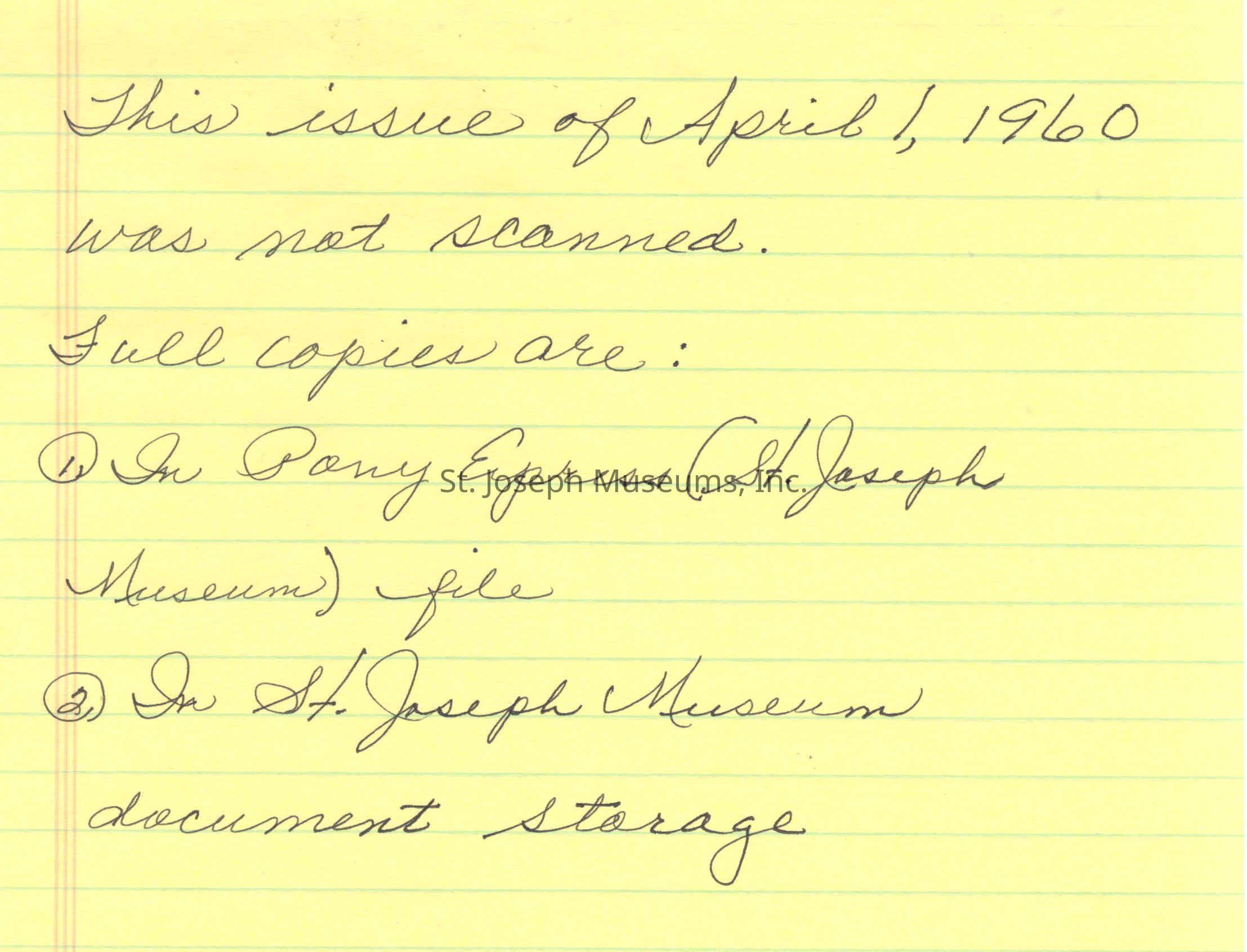 Files contain correspondence with Pony Rider descendants, Pony Express rider biographies, newspaper clippings related to the Pony Express, and miscellaneous records, photos, and documents collected from major private and University libraries among other sources. NOTE ABOUT ORIGIN OF LIBRARIES FILE. Prior to the opening of the renovated Pony Express Museum in 1993, St. Joseph Museum staff did extensive research on the Pony Express. All of the libraries in this folder were visited and copies of all material related to the Pony Express were made. This was done from 1991 to 1993. Information from this research was used in the new exhibits of the Pony Express Museum and in preparation of the book On the Winds of Destiny. In 2015, the file from the Pony Express Museum was added. Jackie Lewin 7/27/15 CD containing scans of actual documents found in Pony Express Research Files located in file cabinets in Document Storage II area.