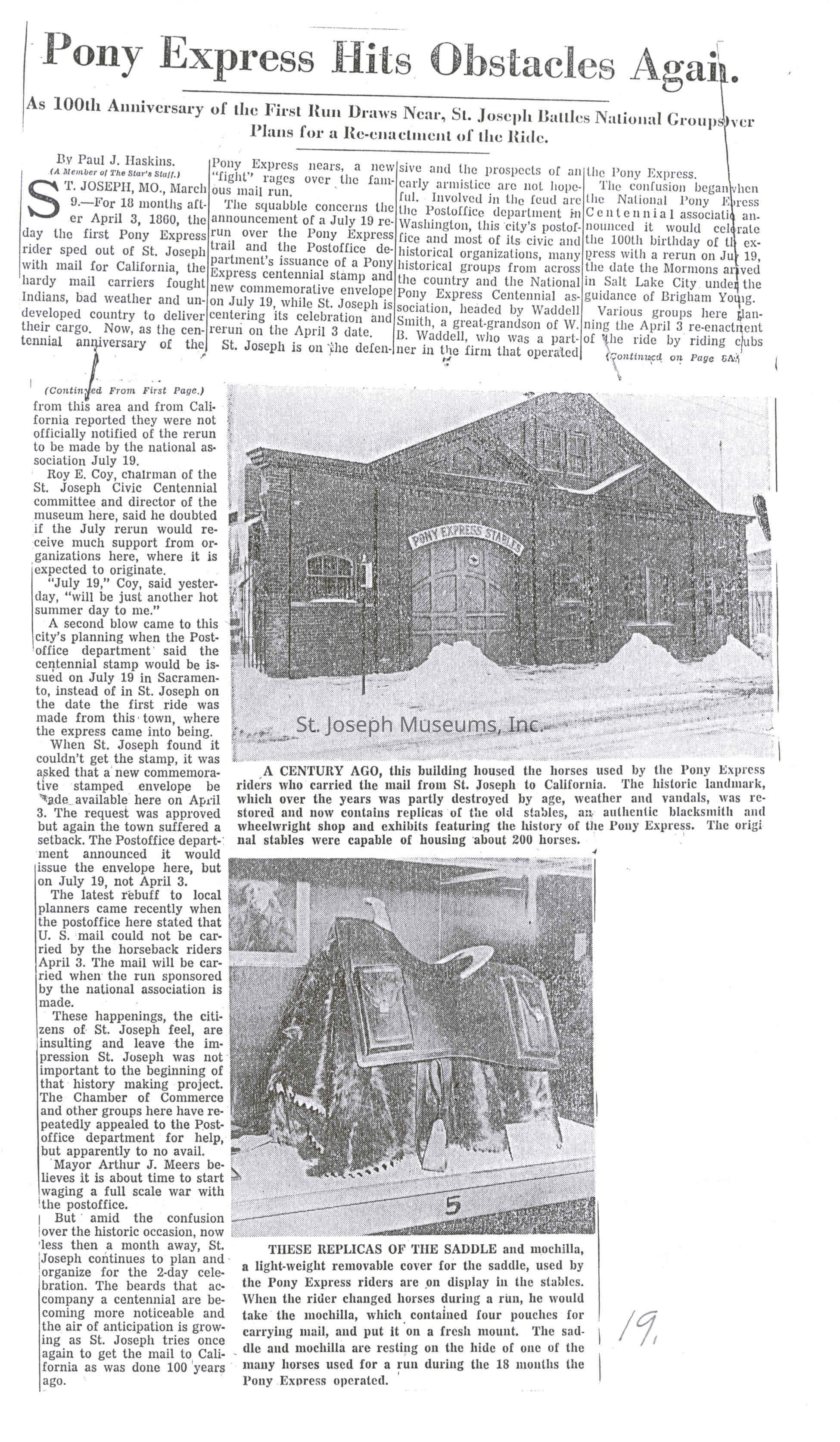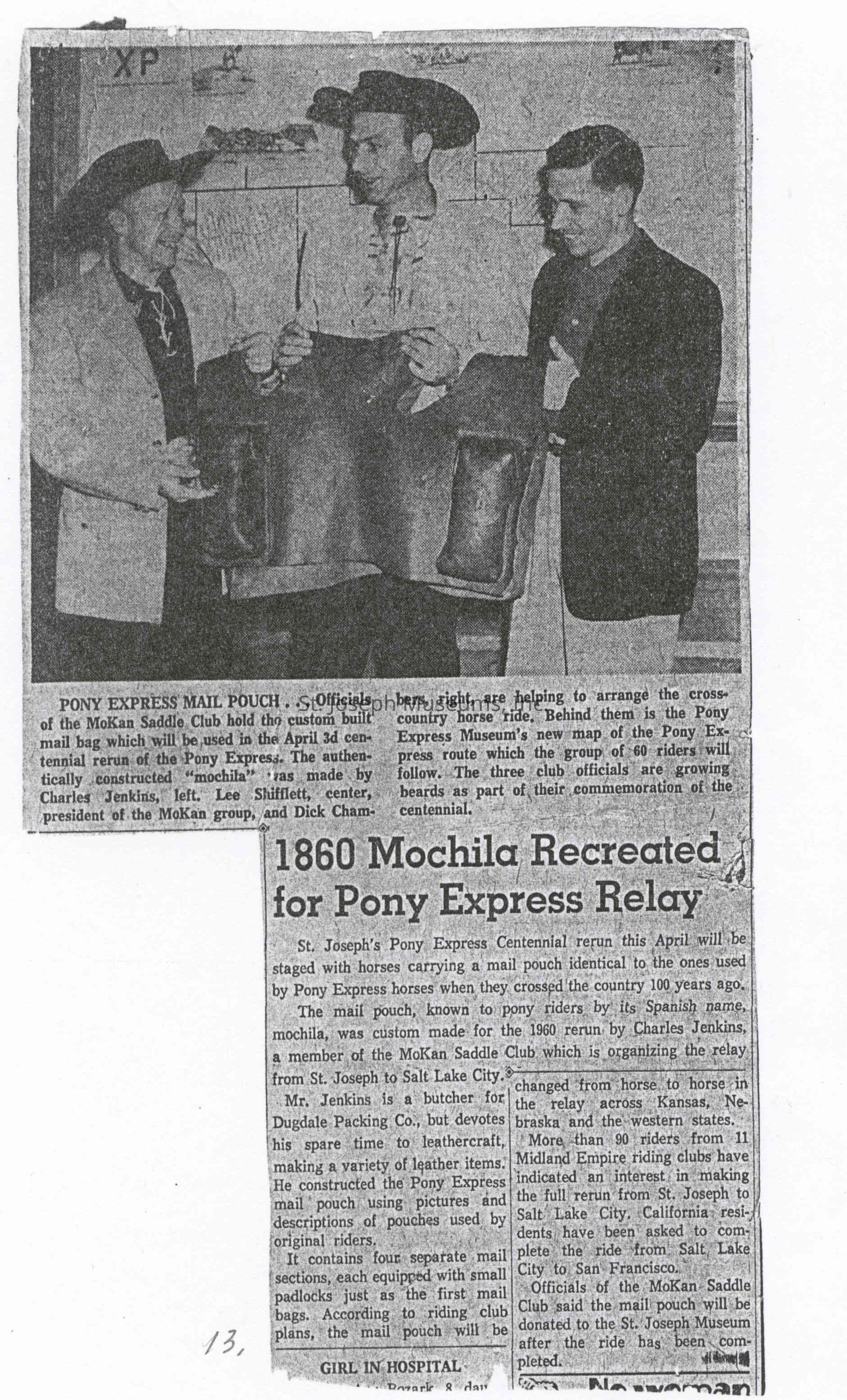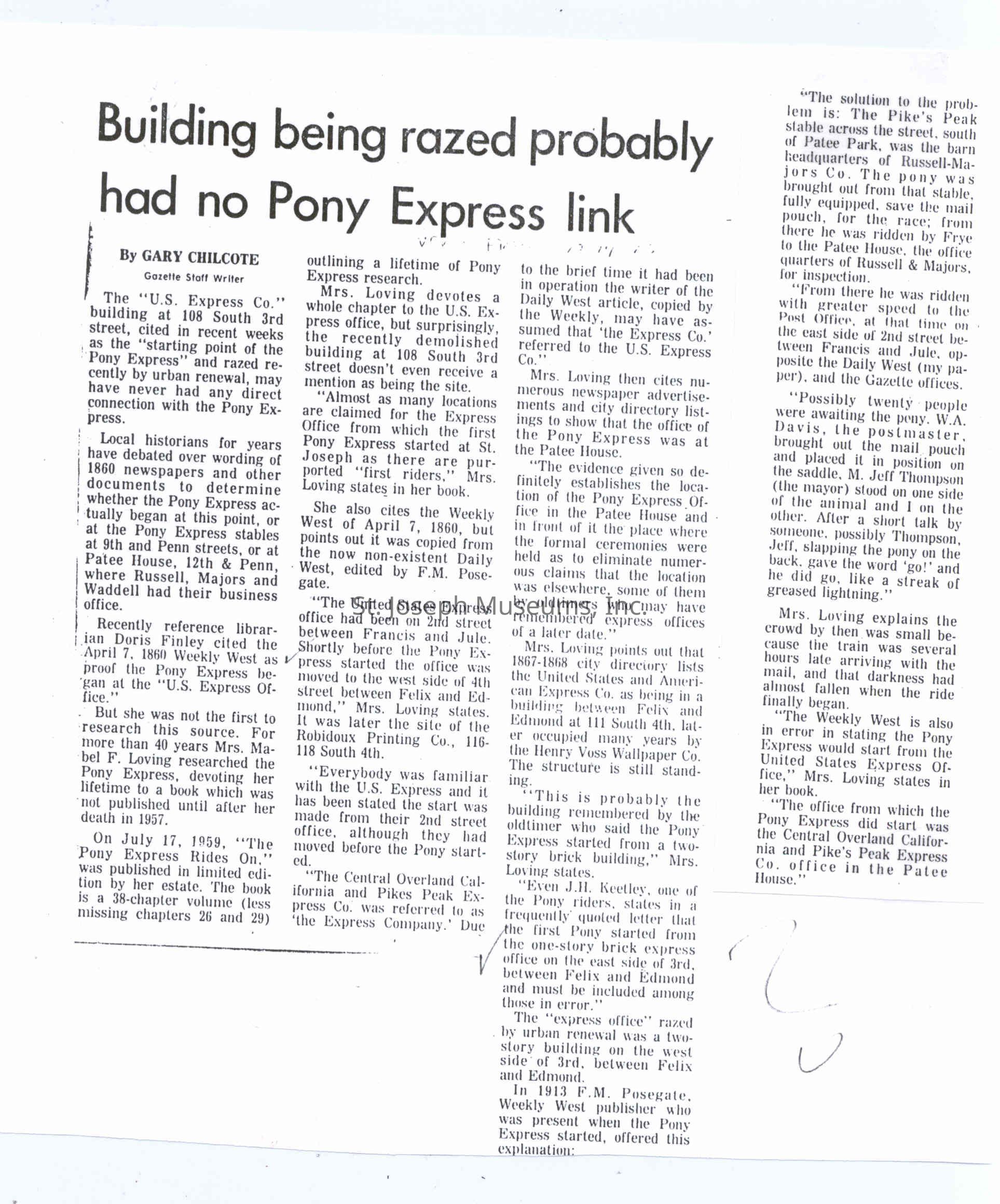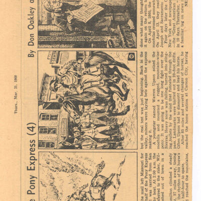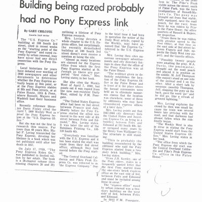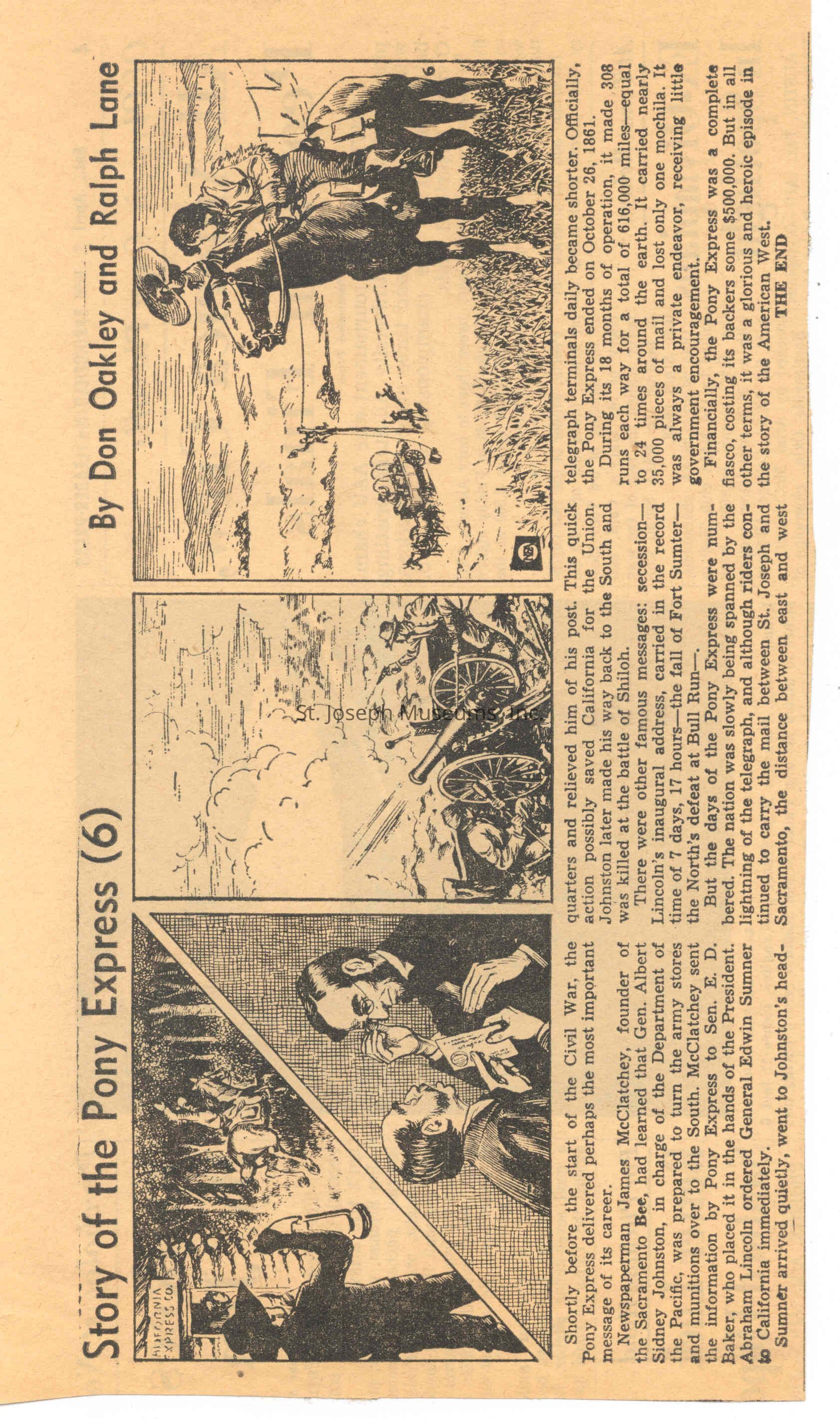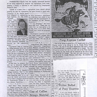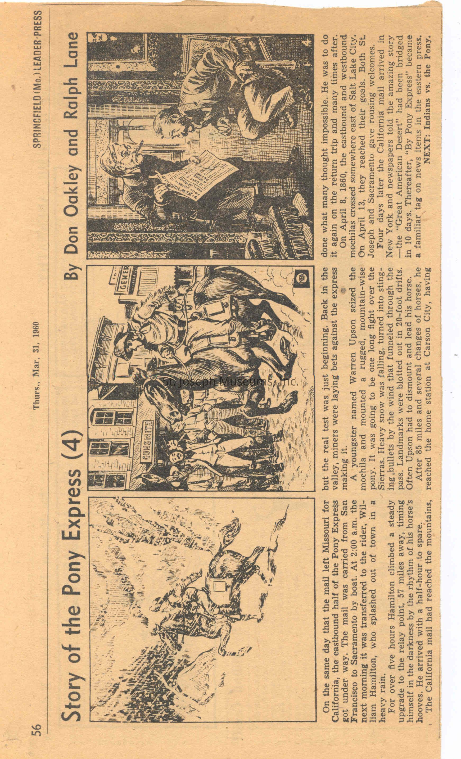Files contain correspondence with Pony Rider descendants, Pony Express rider biographies, newspaper clippings related to the Pony Express, and miscellaneous records, photos, and documents collected from major private and University libraries among other sources. NOTE ABOUT ORIGIN OF LIBRARIES FILE. Prior to the opening of the renovated Pony Express Museum in 1993, St. Joseph Museum staff did extensive research on the Pony Express. All of the libraries in this folder were visited and copies of all material related to the Pony Express were made. This was done from 1991 to 1993. Information from this research was used in the new exhibits of the Pony Express Museum and in preparation of the book On the Winds of Destiny. In 2015, the file from the Pony Express Museum was added. Jackie Lewin 7/27/15 CD containing scans of actual documents found in Pony Express Research Files located in file cabinets in Document Storage II area.