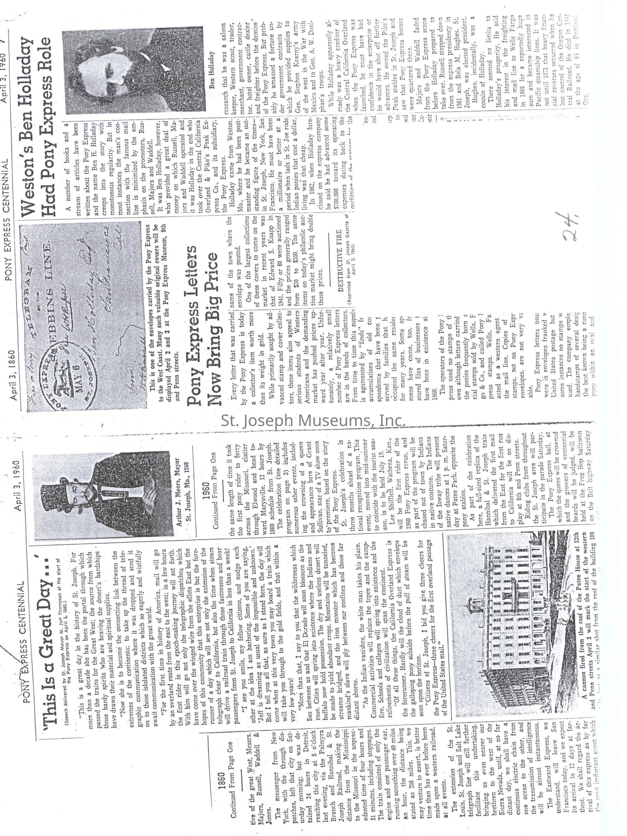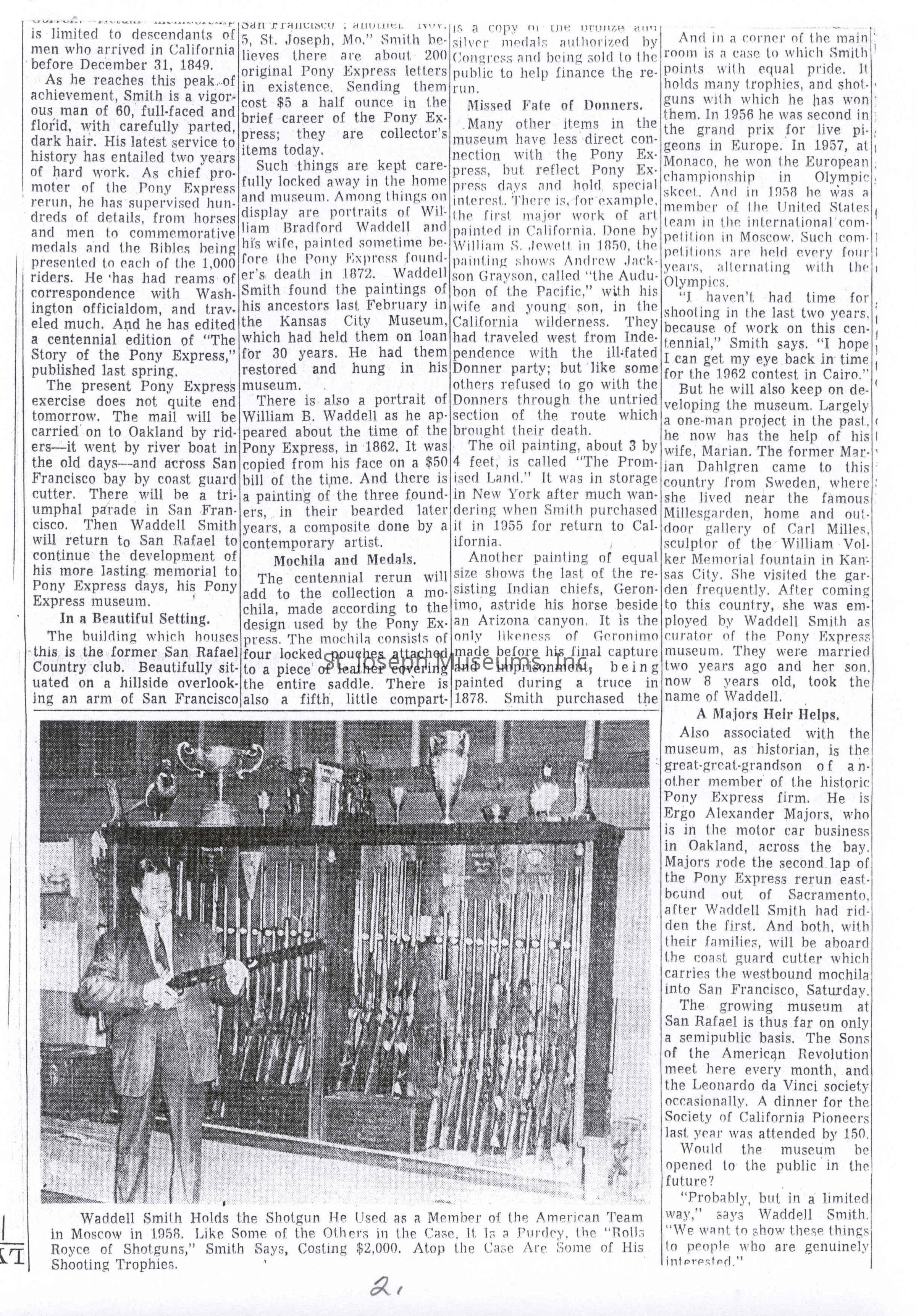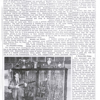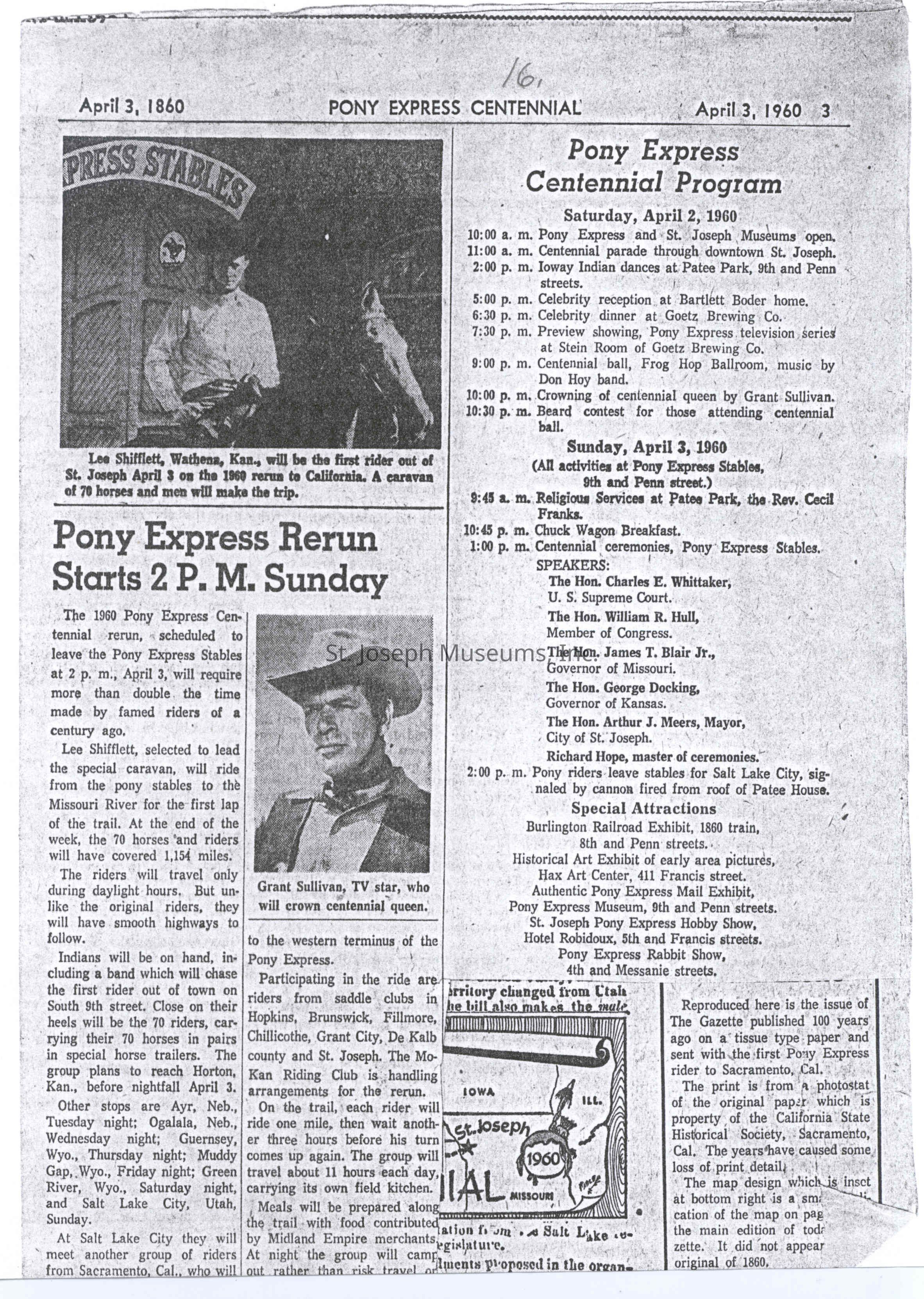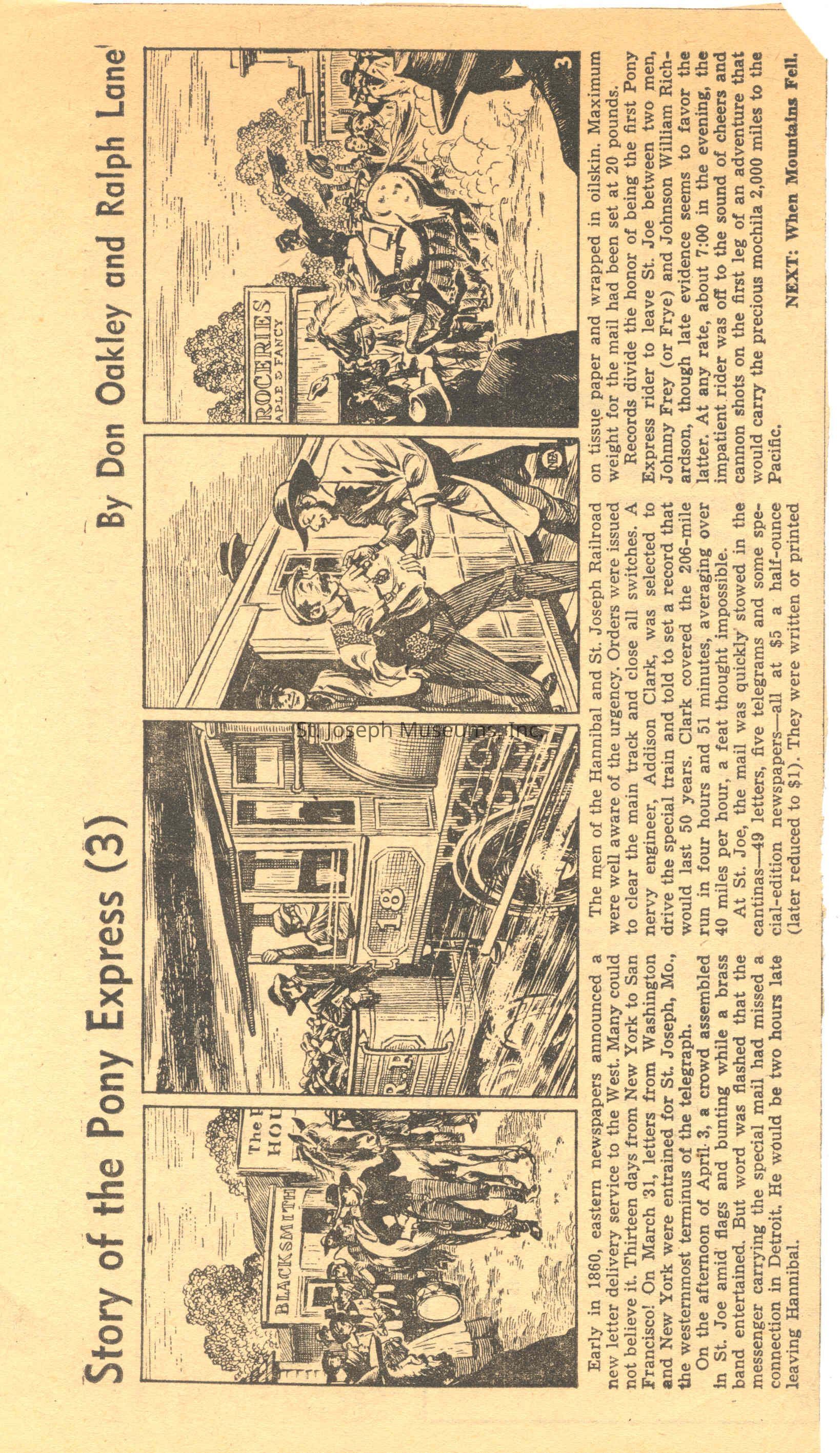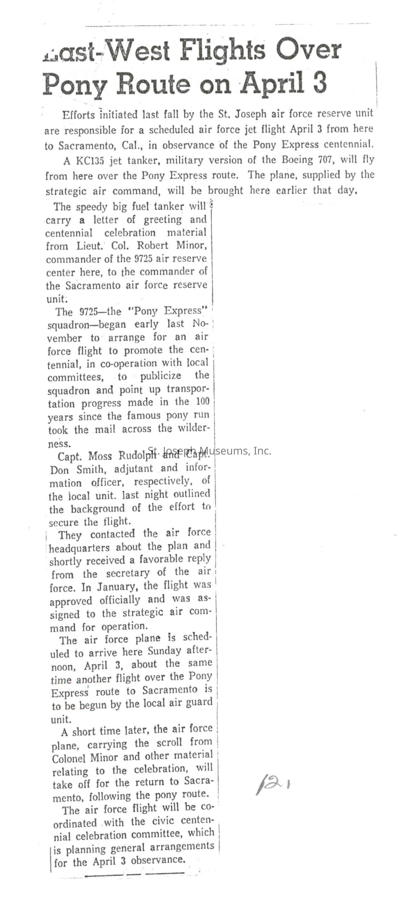 Files contain correspondence with Pony Rider descendants, Pony Express rider biographies, newspaper clippings related to the Pony Express, and miscellaneous records, photos, and documents collected from major private and University libraries among other sources. NOTE ABOUT ORIGIN OF LIBRARIES FILE. Prior to the opening of the renovated Pony Express Museum in 1993, St. Joseph Museum staff did extensive research on the Pony Express. All of the libraries in this folder were visited and copies of all material related to the Pony Express were made. This was done from 1991 to 1993. Information from this research was used in the new exhibits of the Pony Express Museum and in preparation of the book On the Winds of Destiny. In 2015, the file from the Pony Express Museum was added. Jackie Lewin 7/27/15 CD containing scans of actual documents found in Pony Express Research Files located in file cabinets in Document Storage II area.