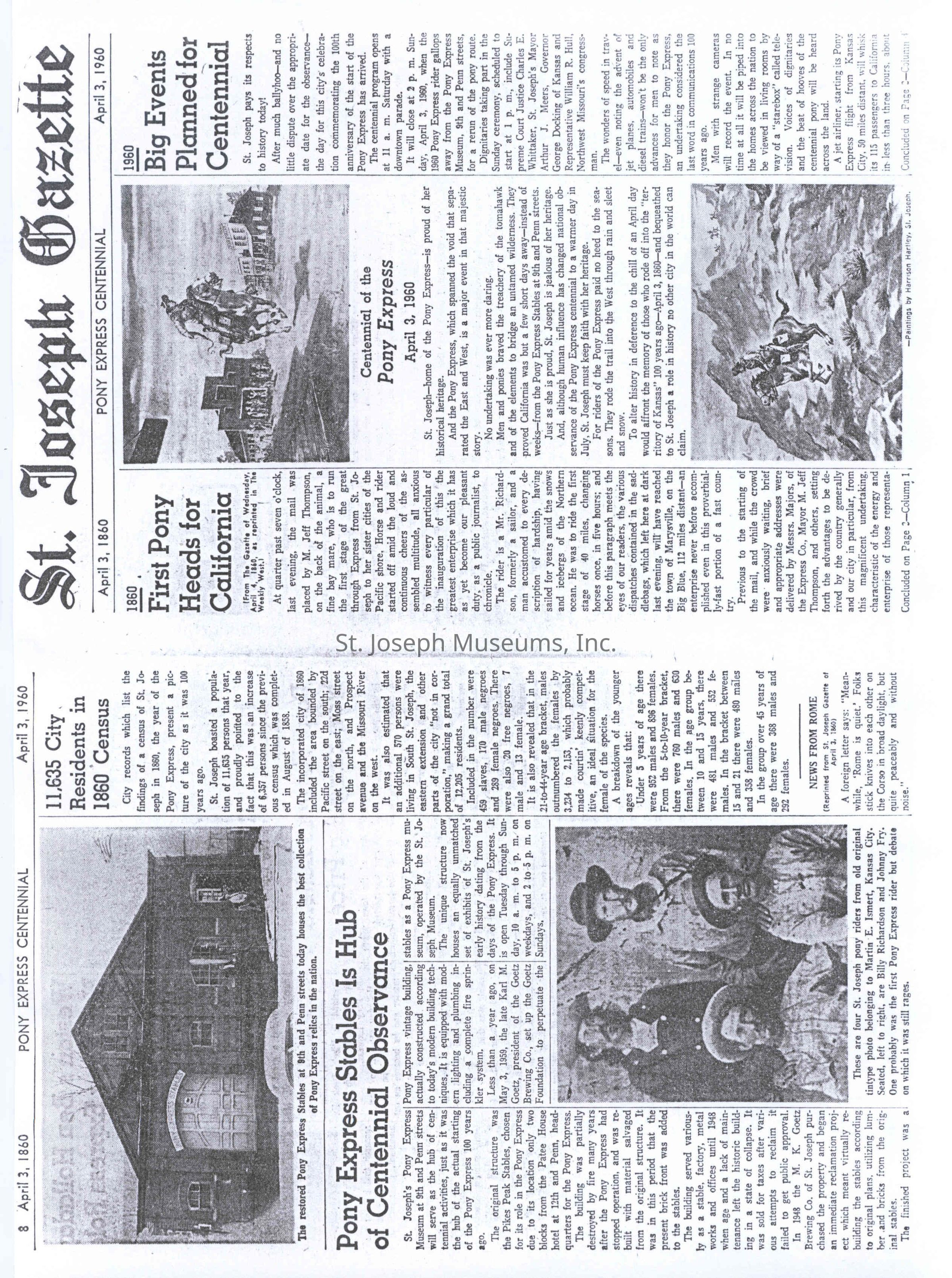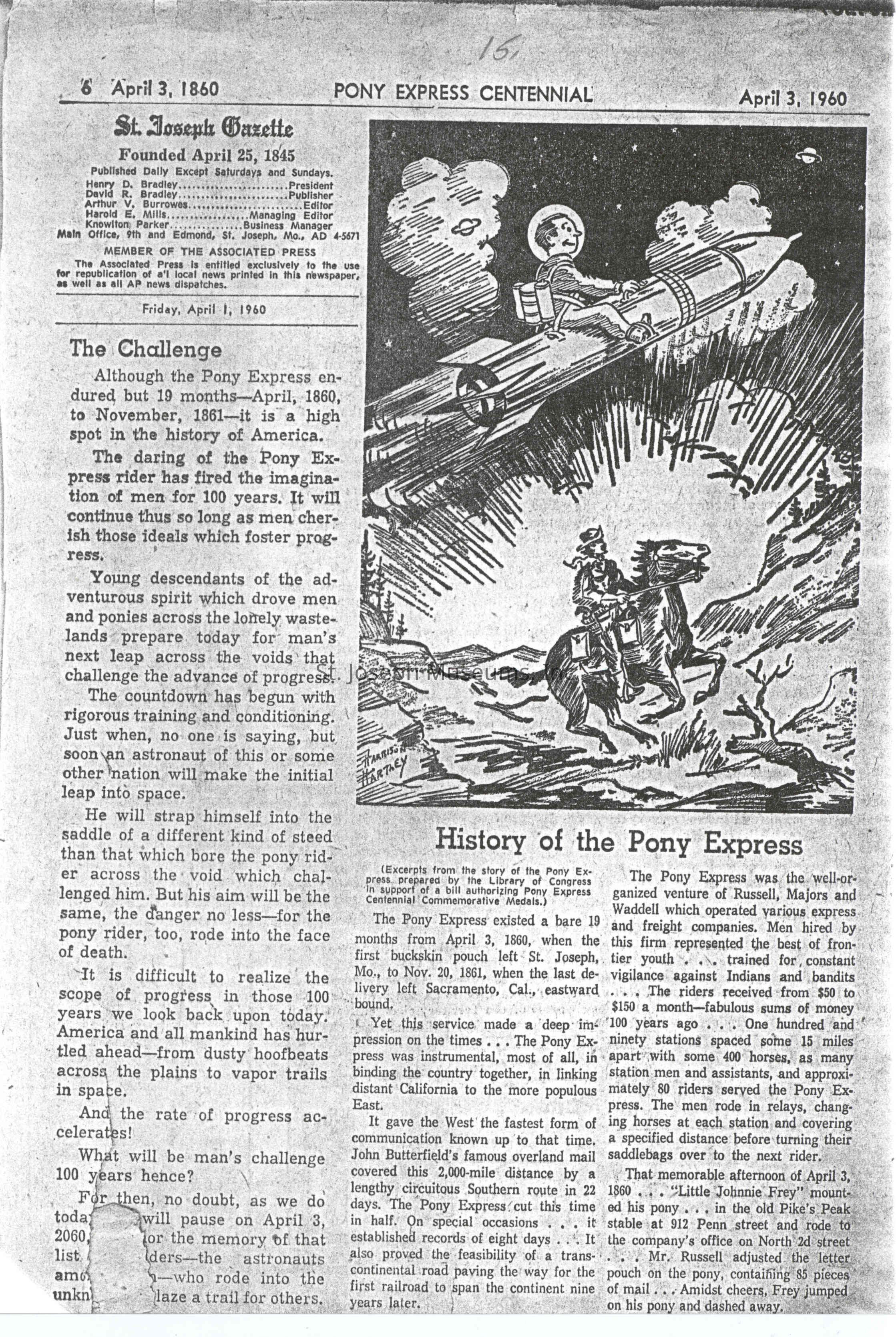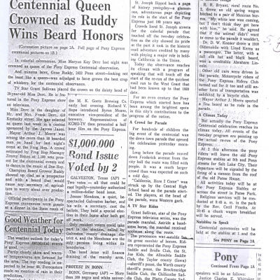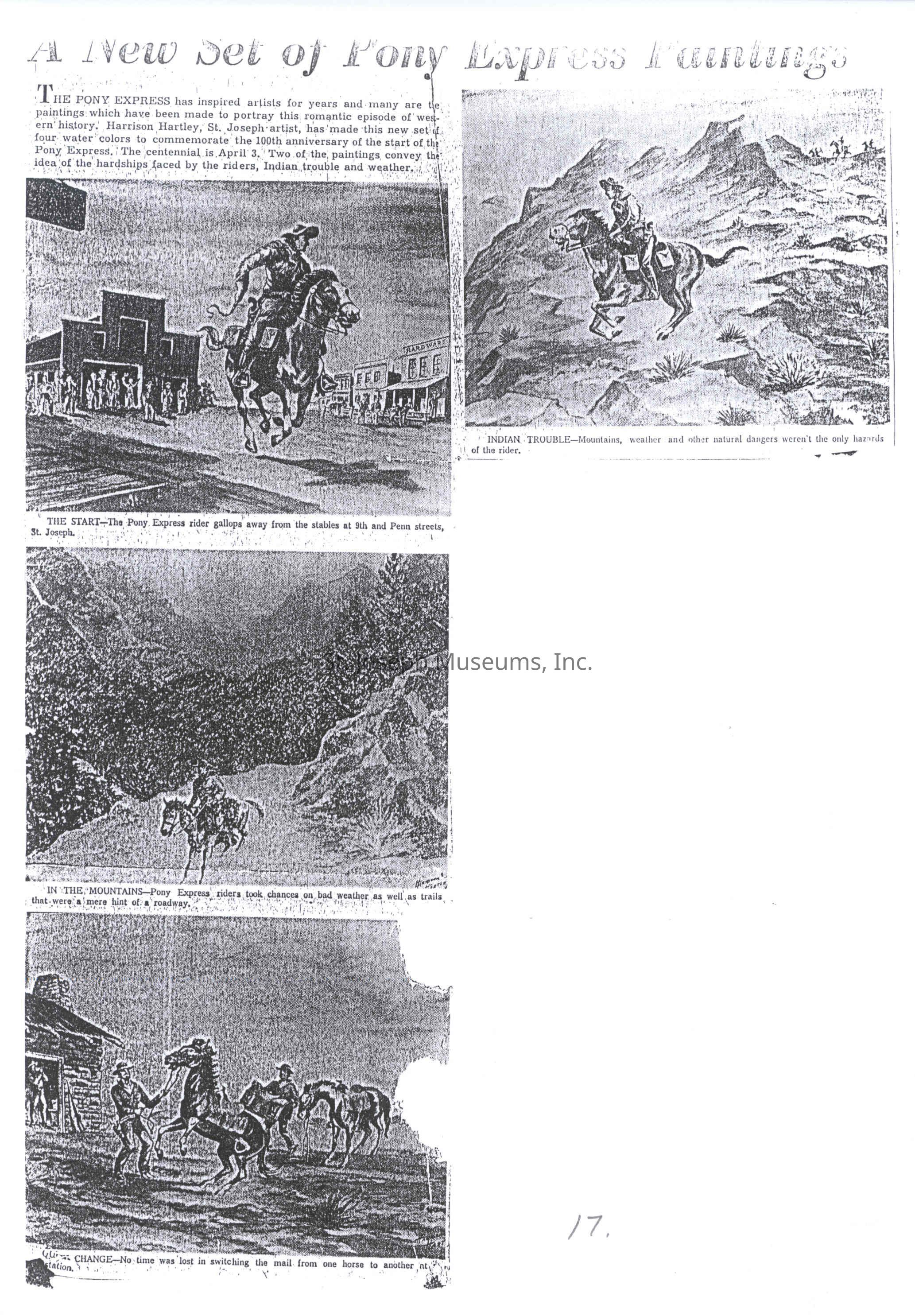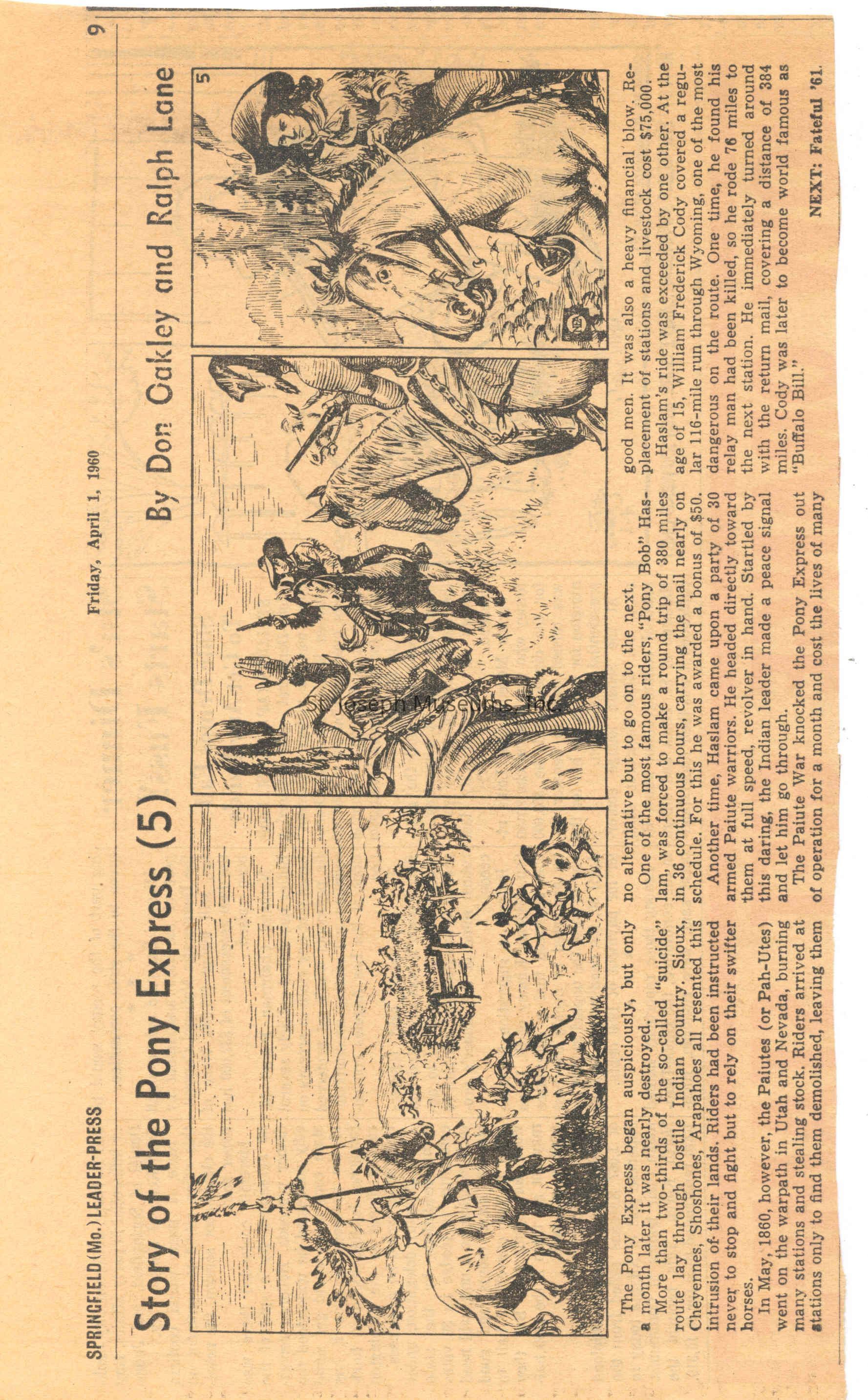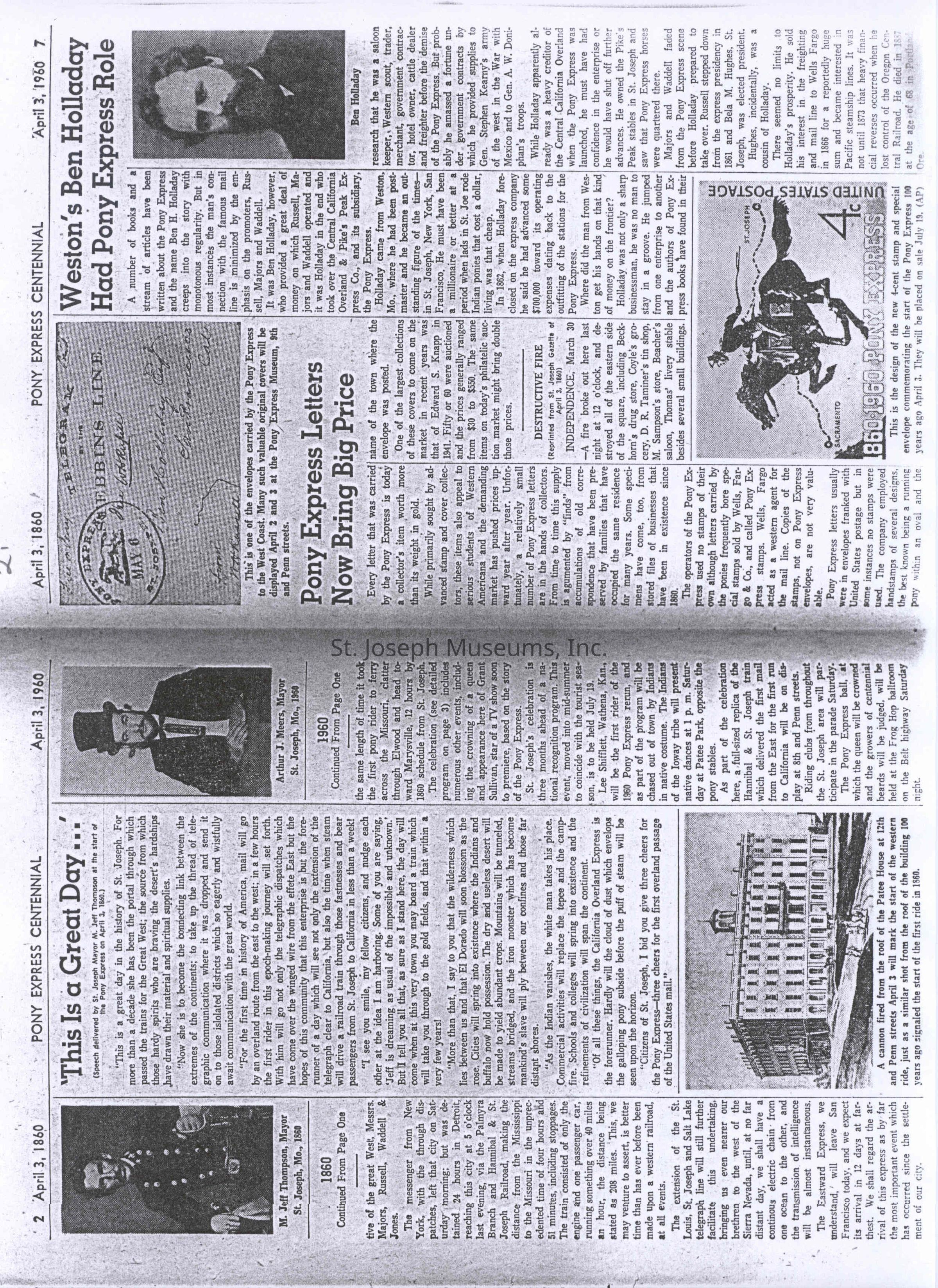 Files contain correspondence with Pony Rider descendants, Pony Express rider biographies, newspaper clippings related to the Pony Express, and miscellaneous records, photos, and documents collected from major private and University libraries among other sources. NOTE ABOUT ORIGIN OF LIBRARIES FILE. Prior to the opening of the renovated Pony Express Museum in 1993, St. Joseph Museum staff did extensive research on the Pony Express. All of the libraries in this folder were visited and copies of all material related to the Pony Express were made. This was done from 1991 to 1993. Information from this research was used in the new exhibits of the Pony Express Museum and in preparation of the book On the Winds of Destiny. In 2015, the file from the Pony Express Museum was added. Jackie Lewin 7/27/15 CD containing scans of actual documents found in Pony Express Research Files located in file cabinets in Document Storage II area.
