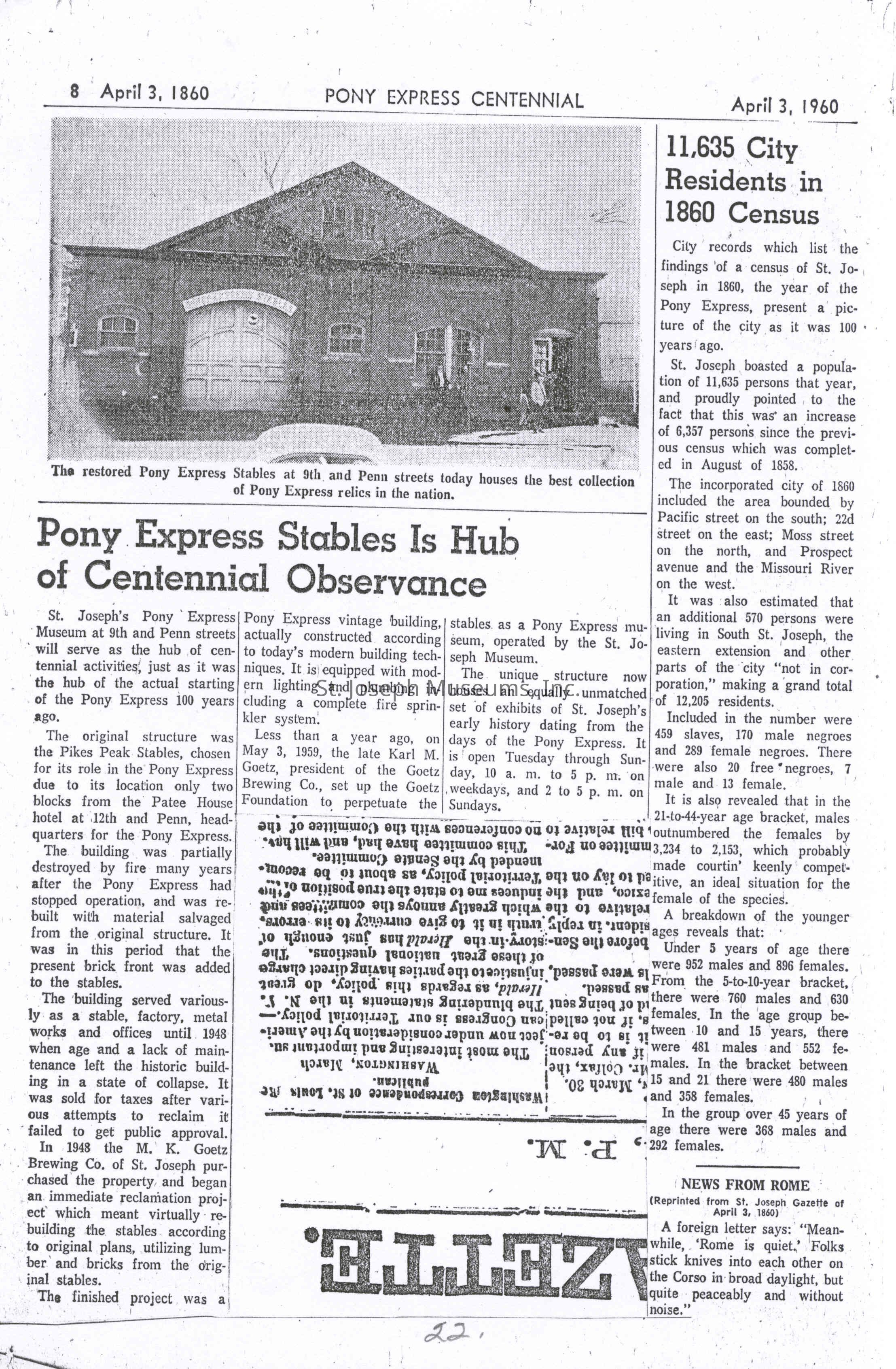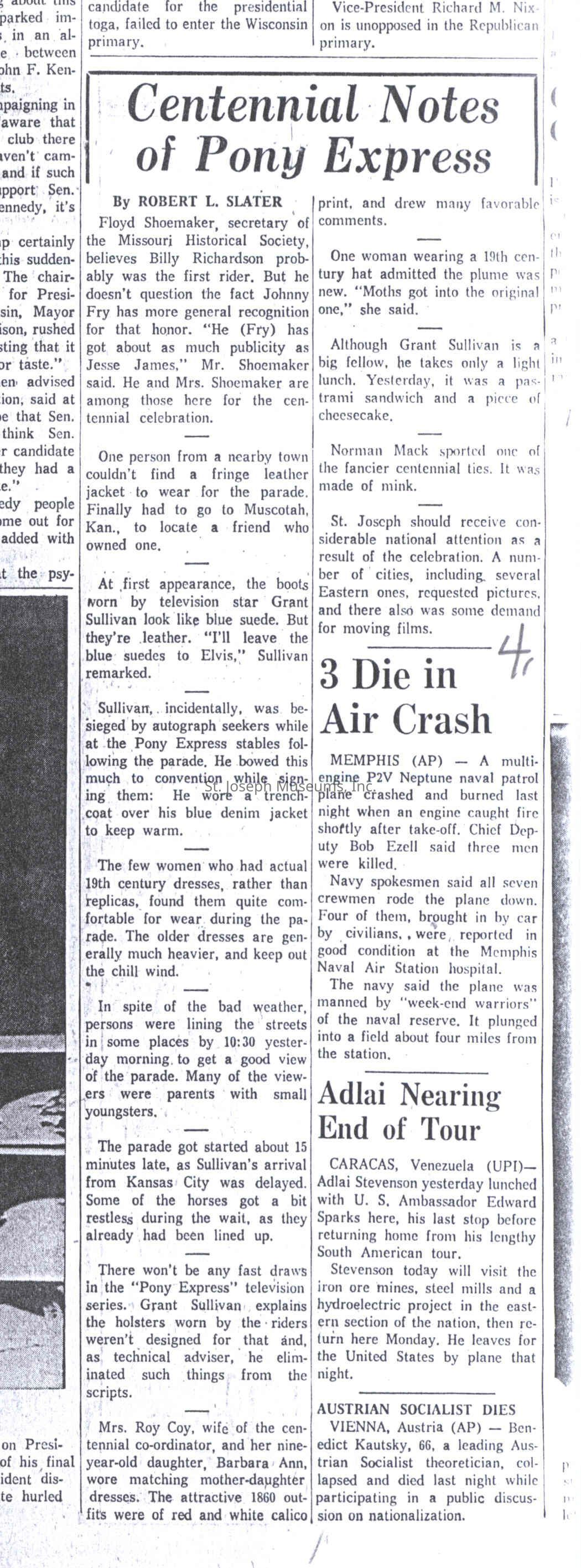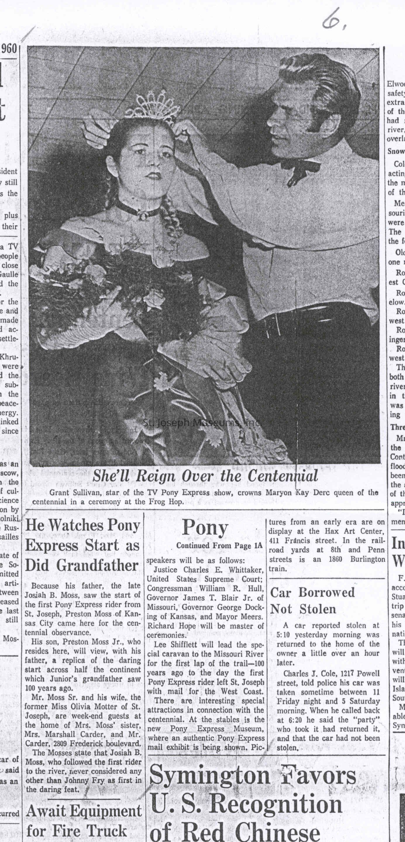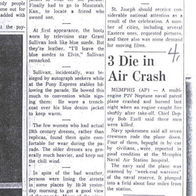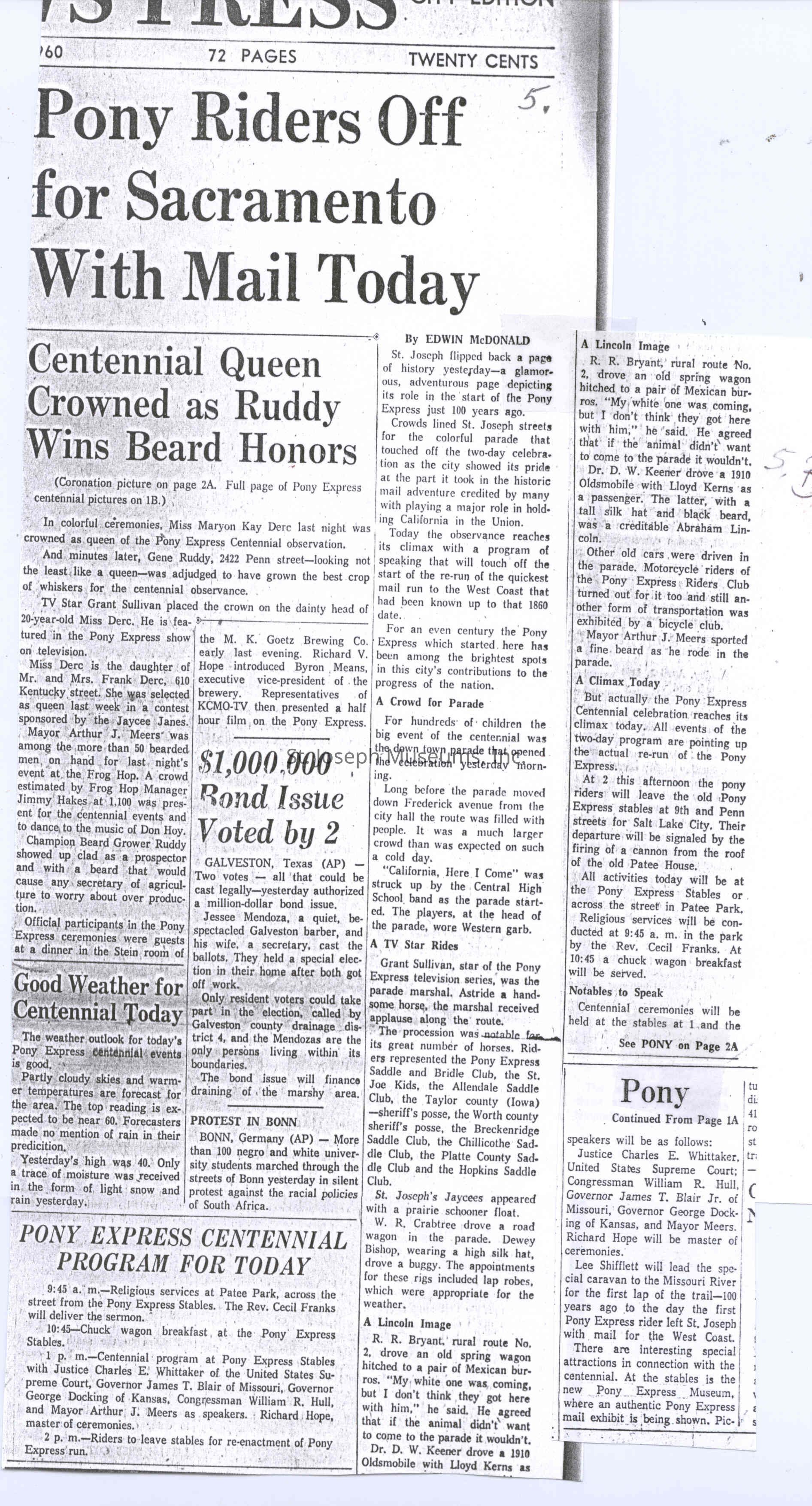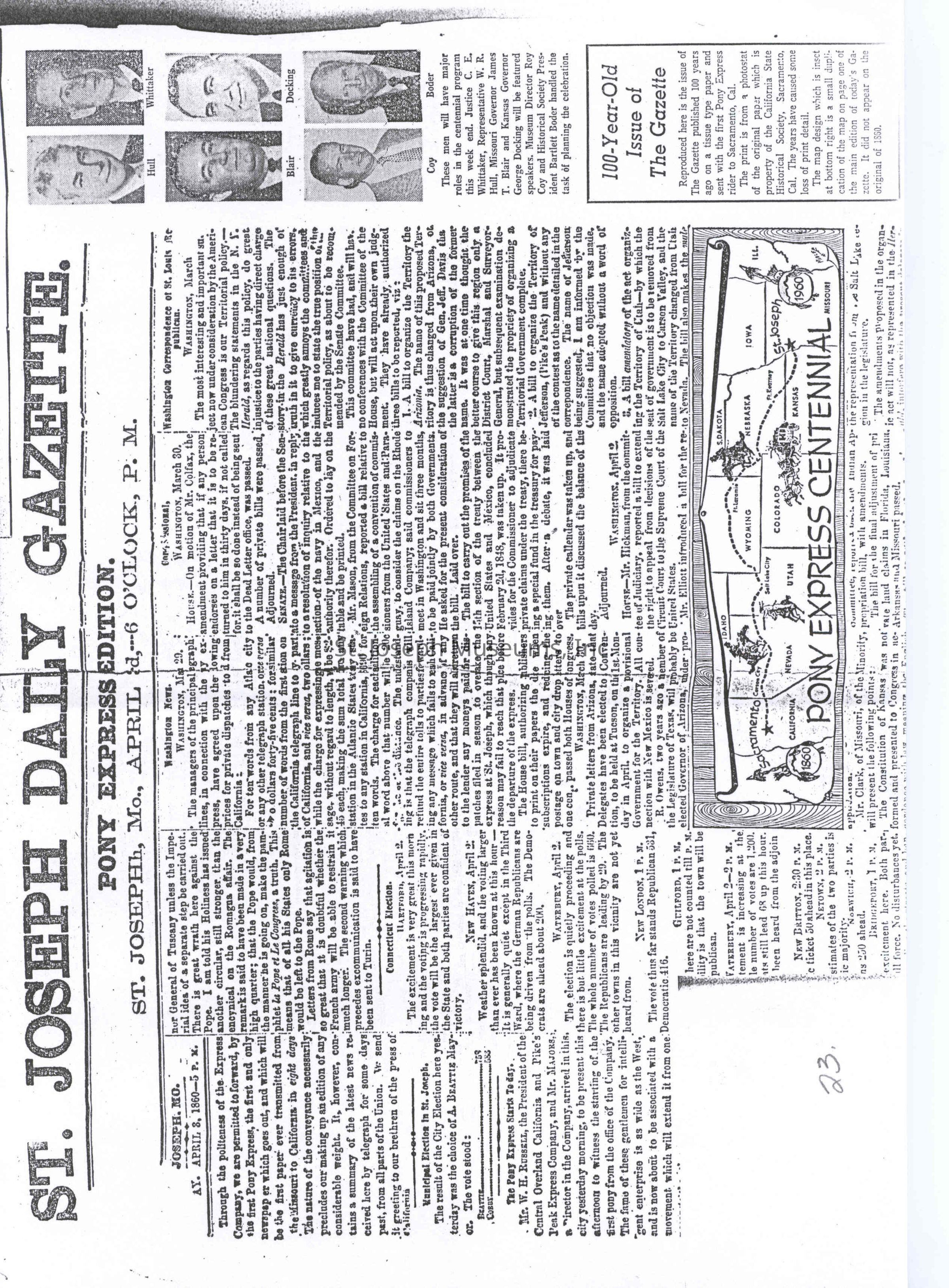 Files contain correspondence with Pony Rider descendants, Pony Express rider biographies, newspaper clippings related to the Pony Express, and miscellaneous records, photos, and documents collected from major private and University libraries among other sources. NOTE ABOUT ORIGIN OF LIBRARIES FILE. Prior to the opening of the renovated Pony Express Museum in 1993, St. Joseph Museum staff did extensive research on the Pony Express. All of the libraries in this folder were visited and copies of all material related to the Pony Express were made. This was done from 1991 to 1993. Information from this research was used in the new exhibits of the Pony Express Museum and in preparation of the book On the Winds of Destiny. In 2015, the file from the Pony Express Museum was added. Jackie Lewin 7/27/15 CD containing scans of actual documents found in Pony Express Research Files located in file cabinets in Document Storage II area.