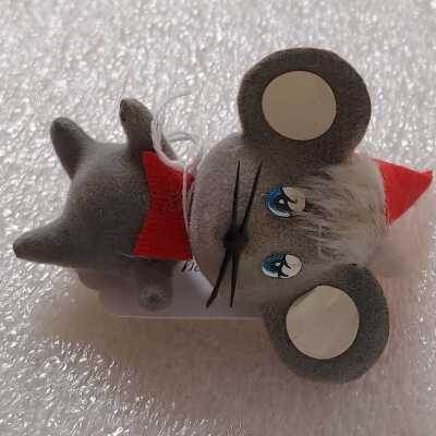 Grey flocked mouse with a red pointy hat and a red bowtie. Mouse has black whiskers and blue eyes.