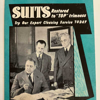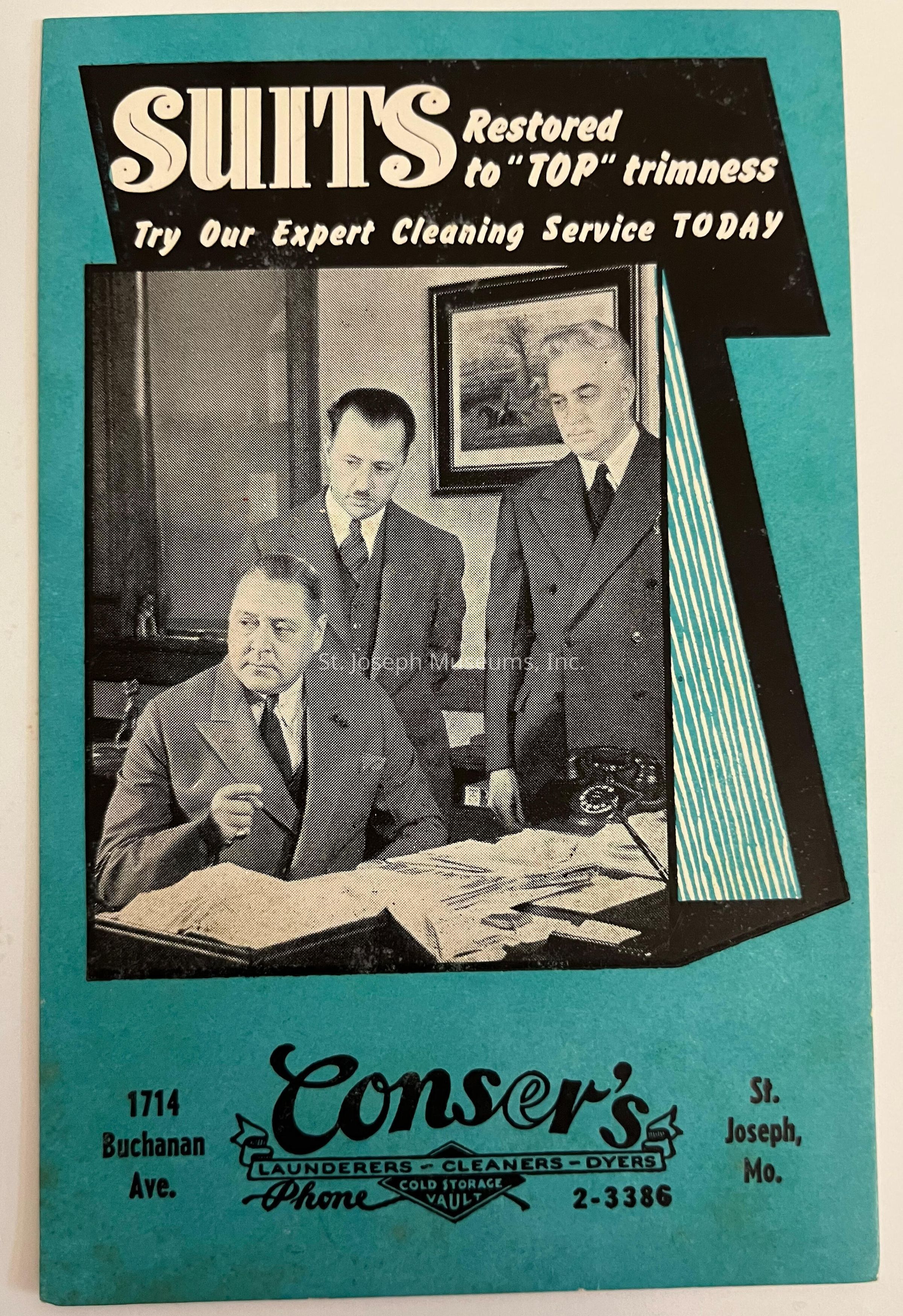 Conser Laundry Advertising Trade Card, undated. Conser Launderers-Cleaners-Dryers. 1714 Buchanan, St. Joseph, Mo. 2-3386. Turquois card with photo of three men in office with papers on desk. c. 1911.Collection