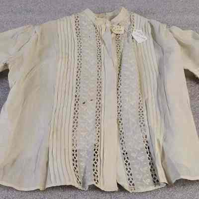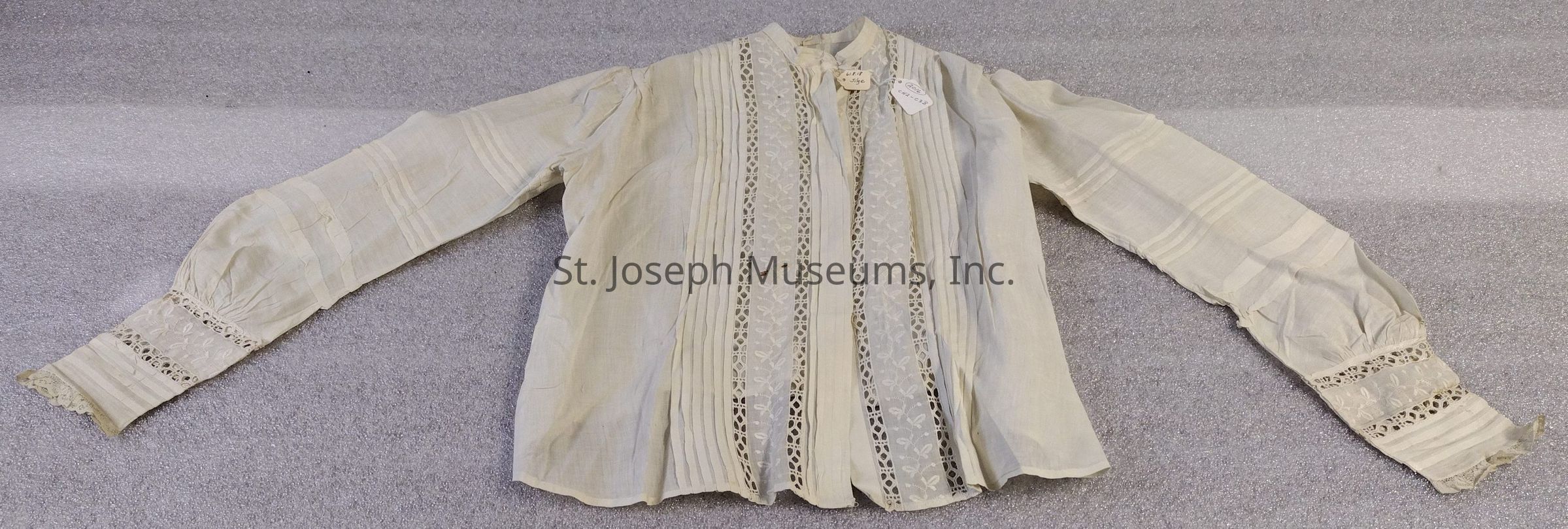 The image depicts a white blouse featuring delicate lace detailing on the bodice and cuffs and a buttoned front with pleats. The long sleeves have horizontal pleats