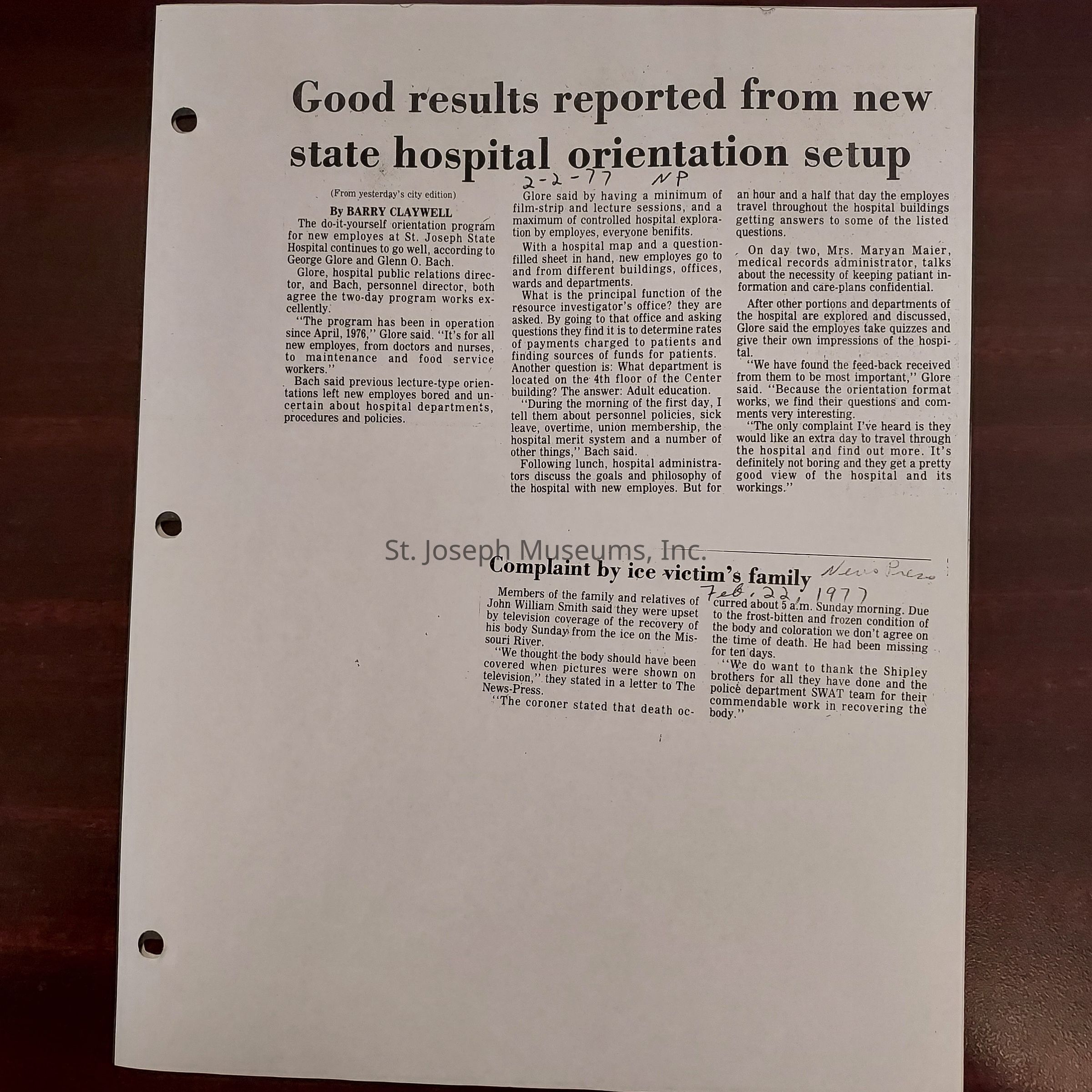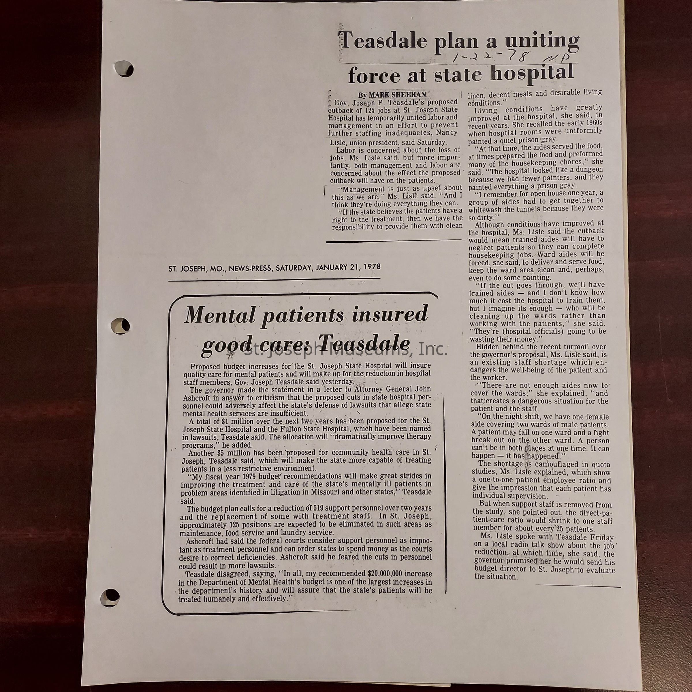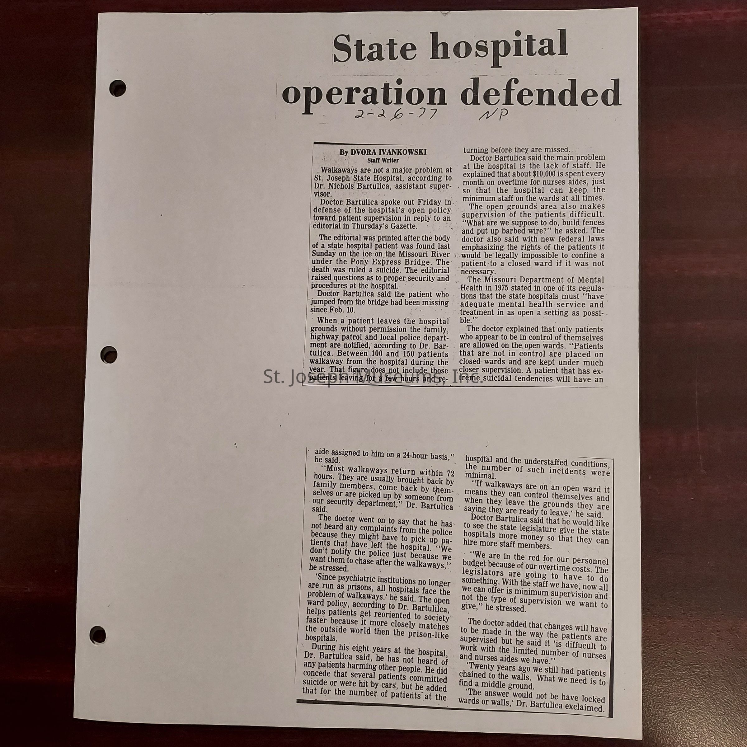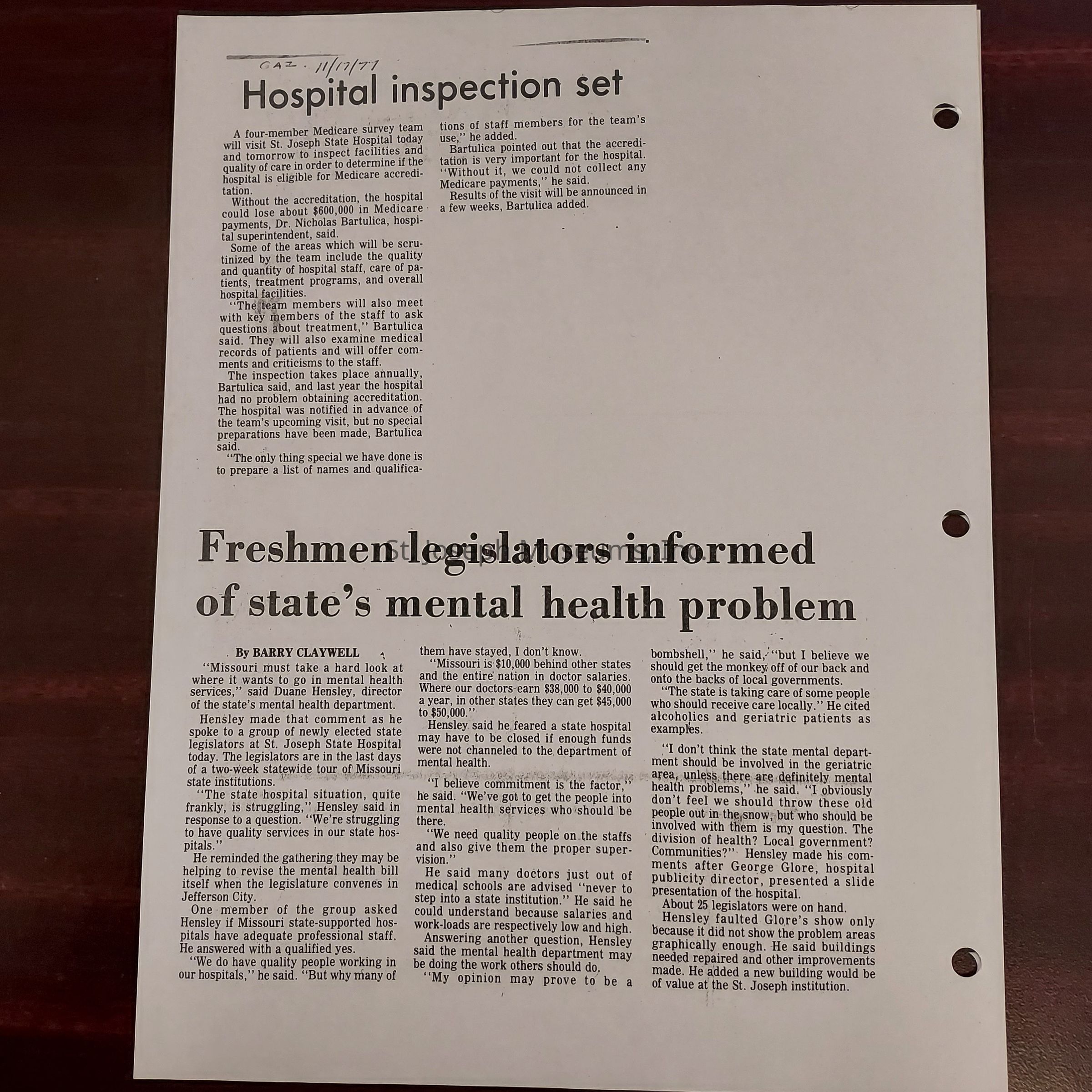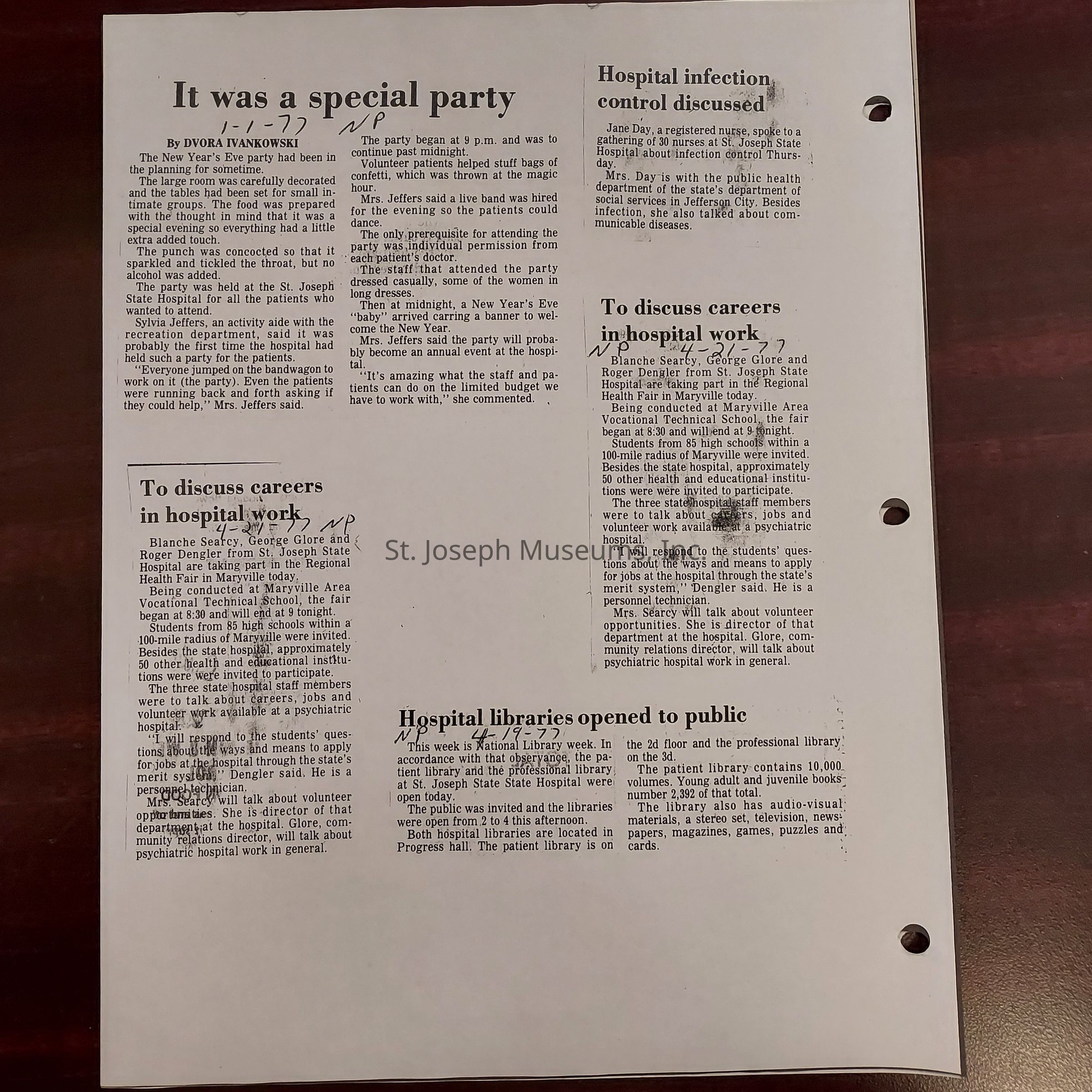 Newspaper clippings concerning the State Hospital in 1977.Entry/Object ID
