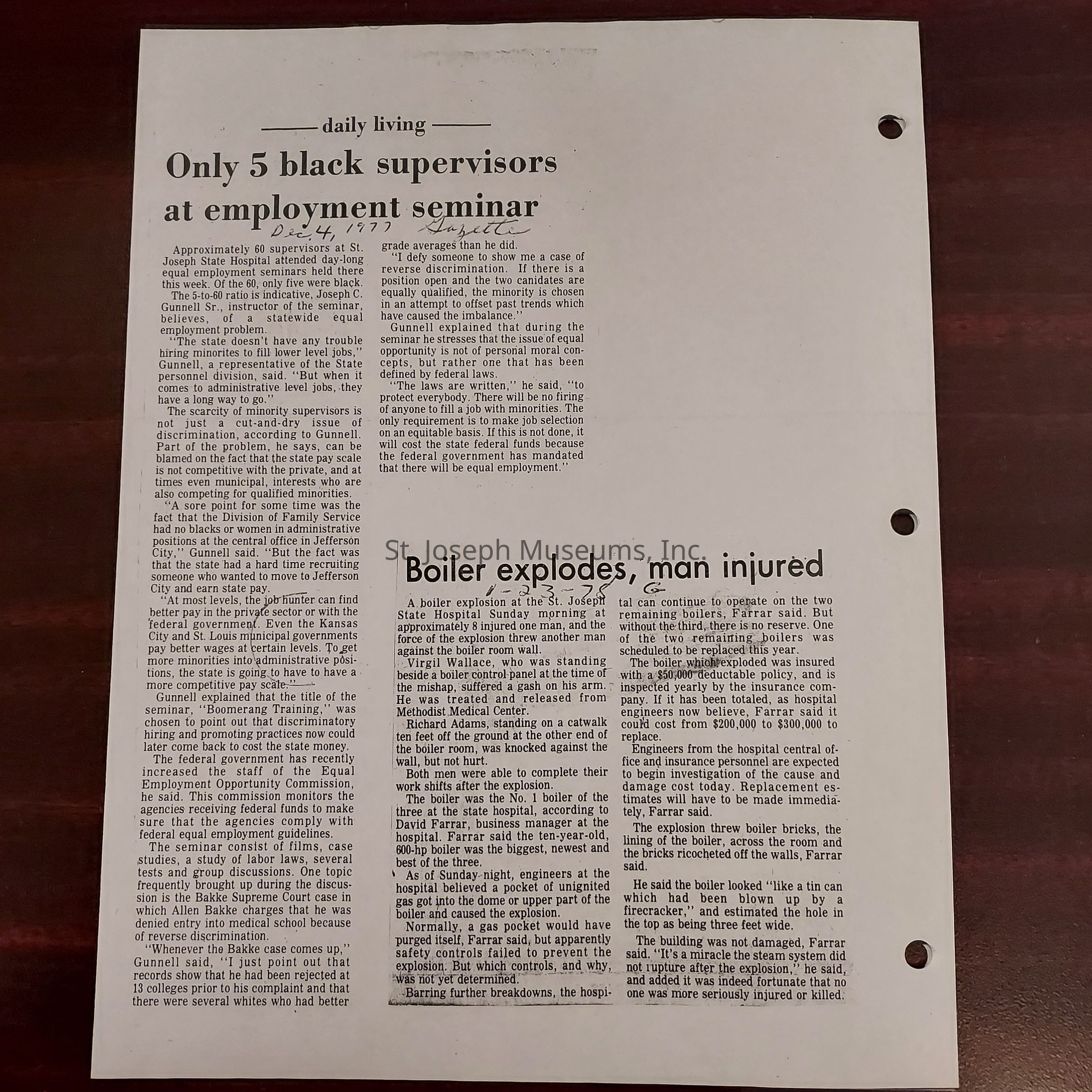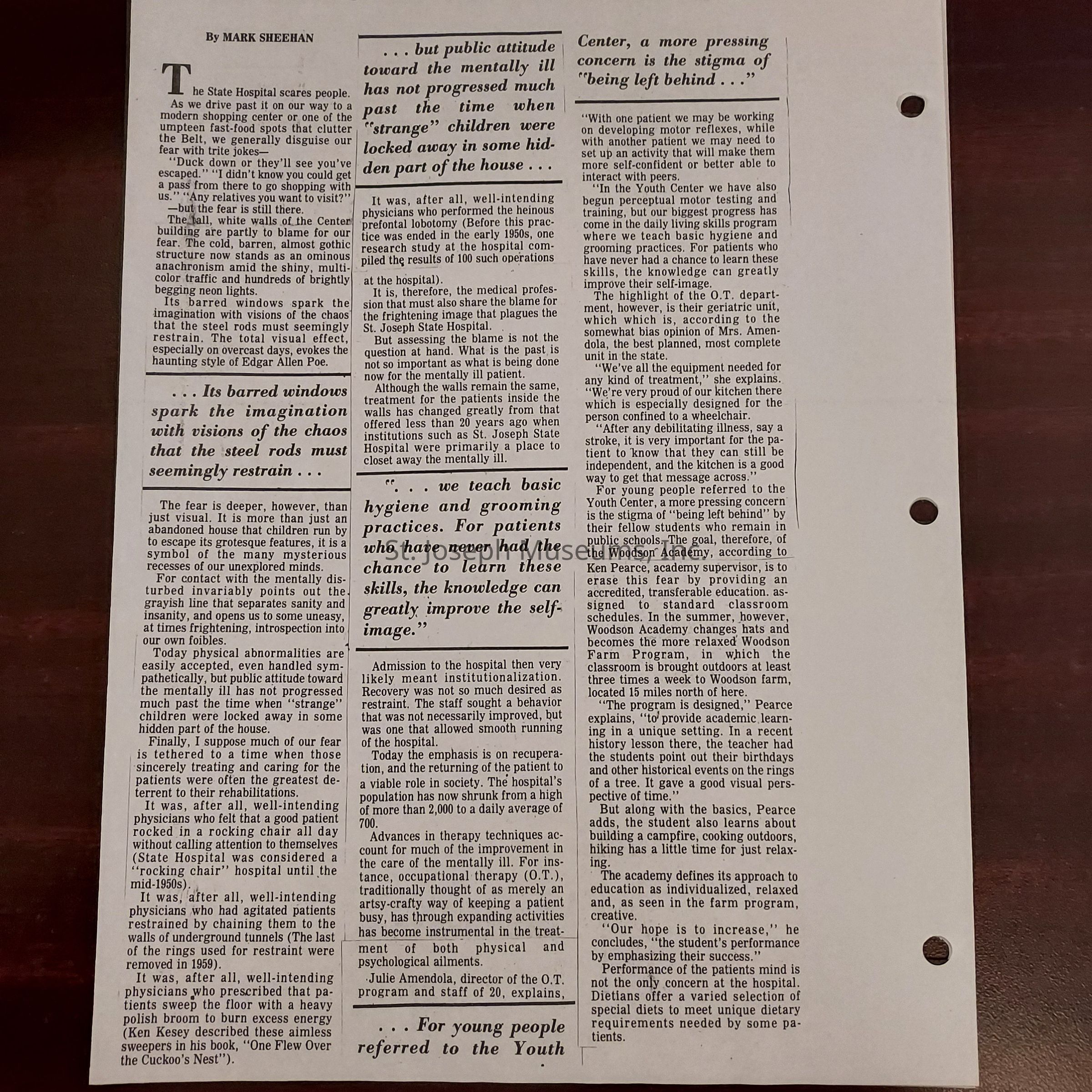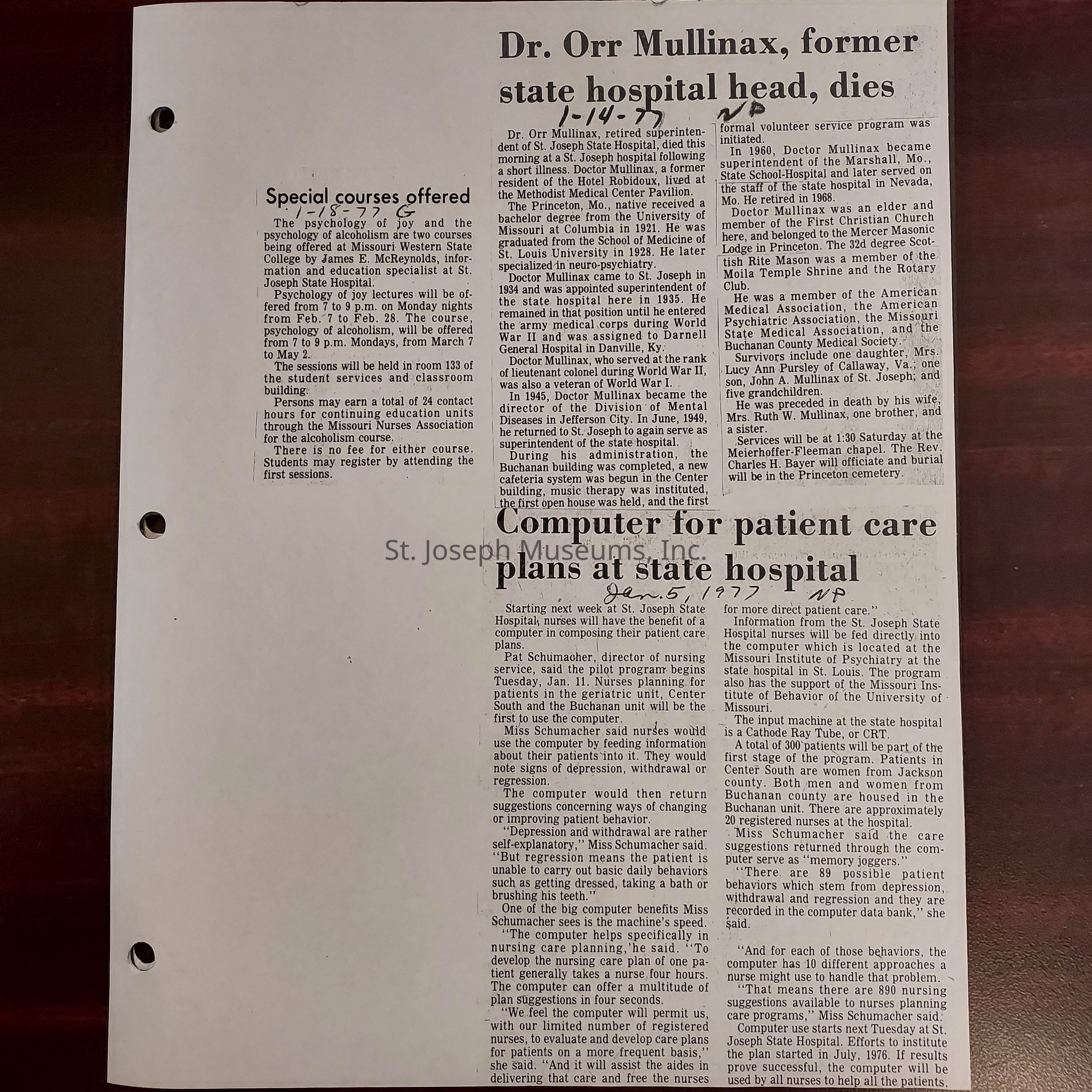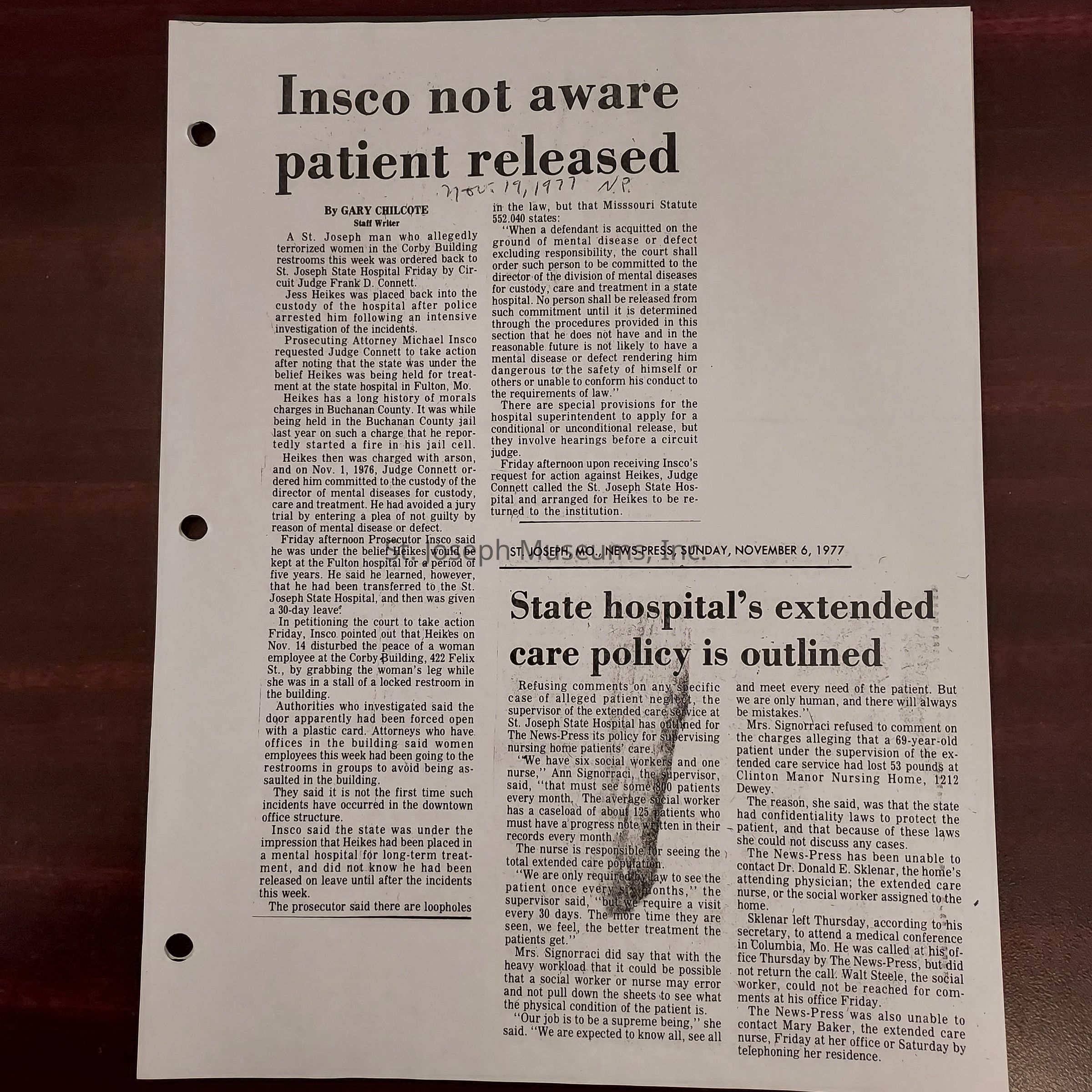 Newspaper clippings concerning the State Hospital in 1977.Entry/Object ID