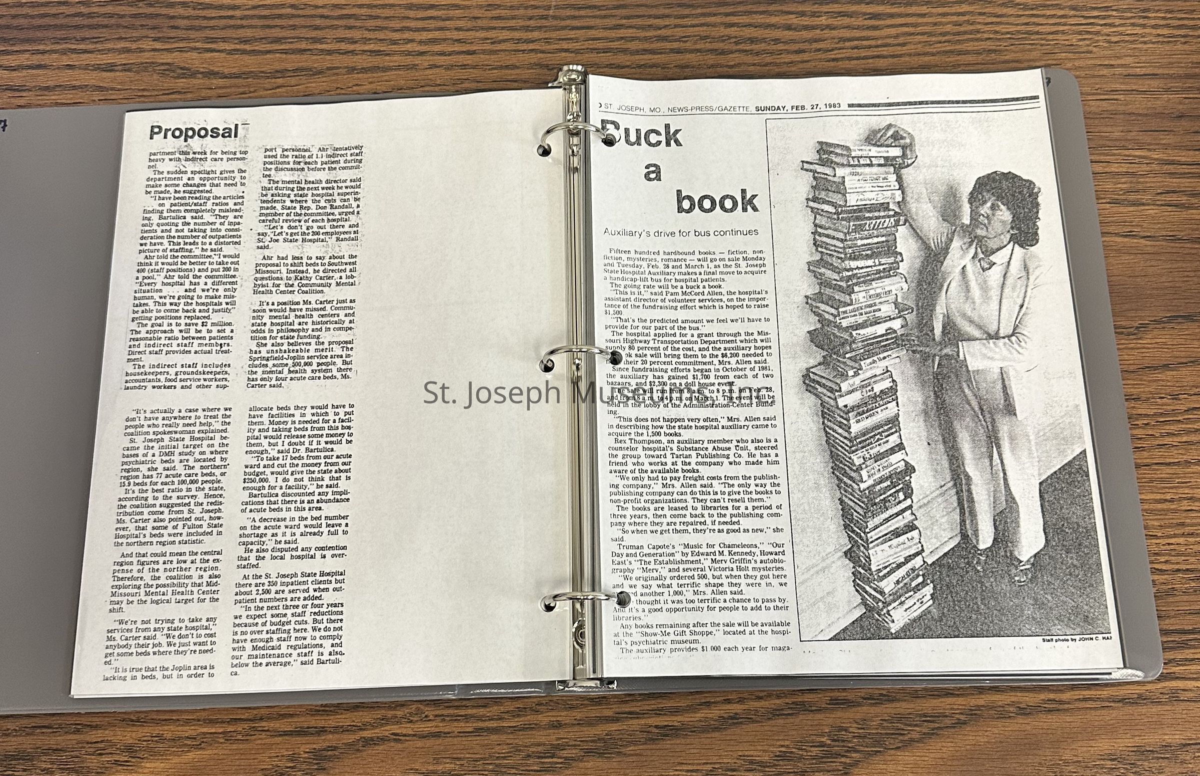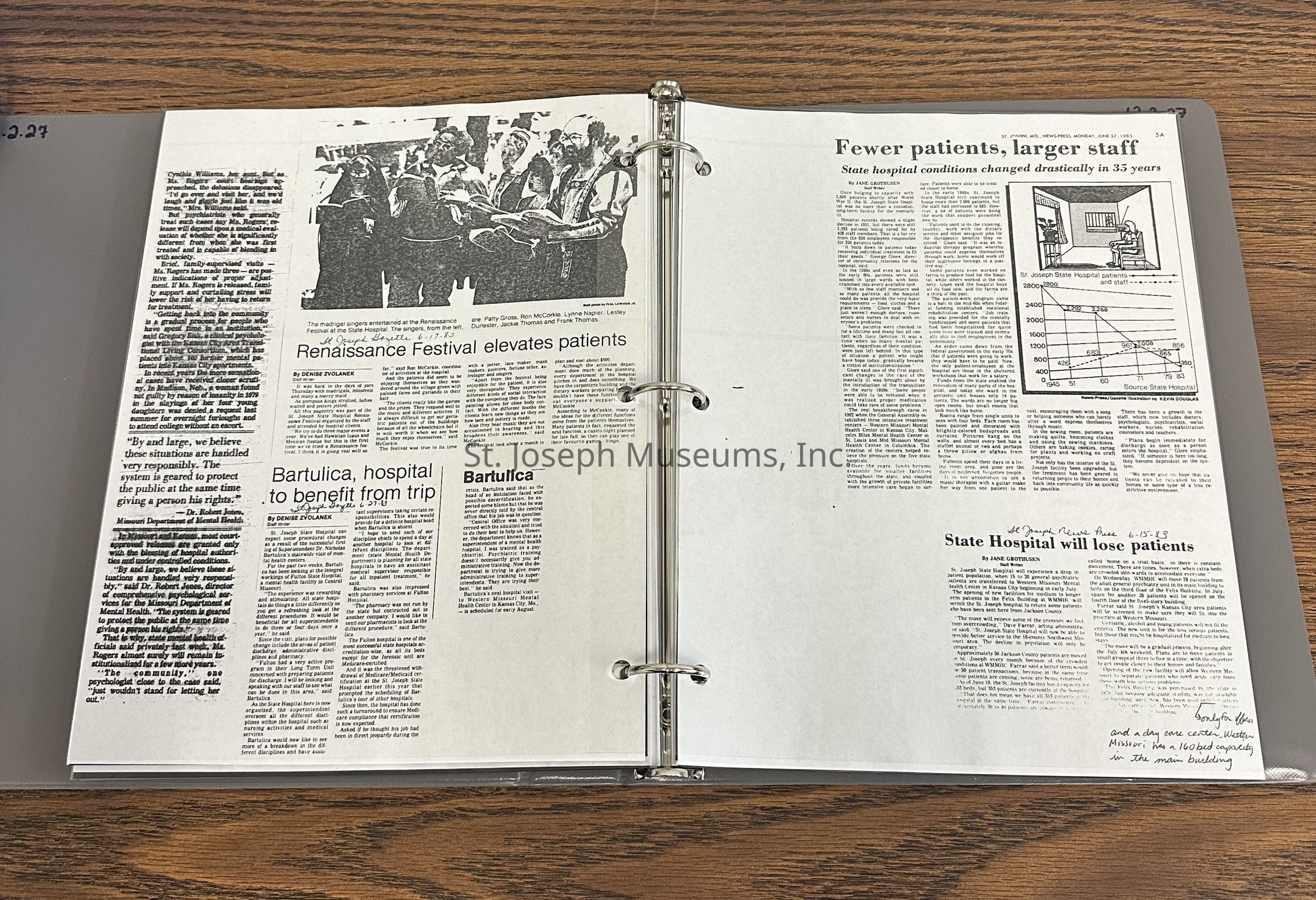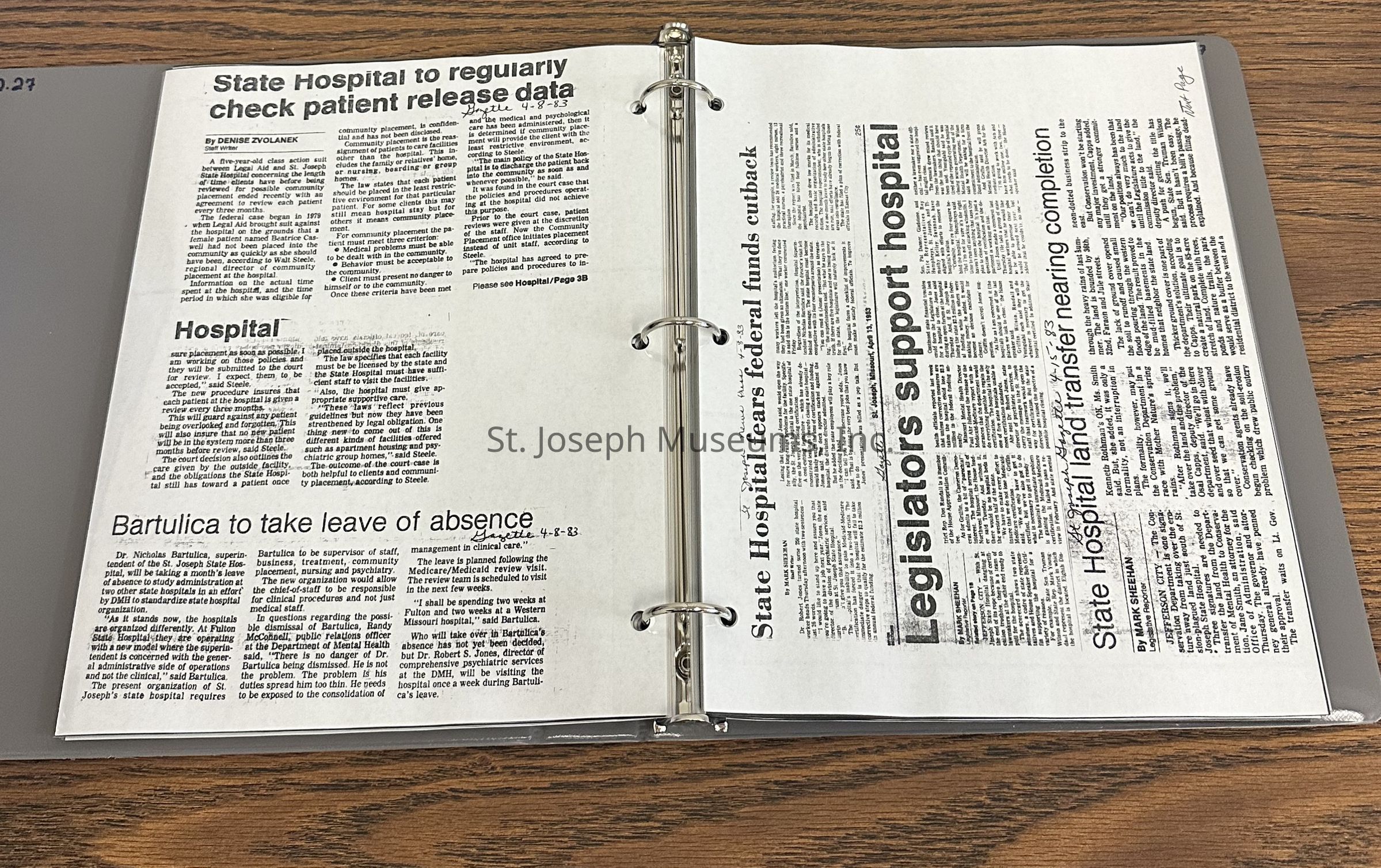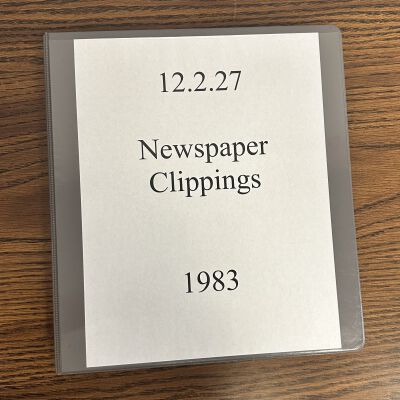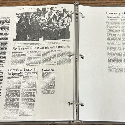 Newspaper clippings concerning the State Hospital in 1983. Topics include: problems at the hospital noted in the press, auxiliary book drive, renovations, Dr. Bartulica takes a leave of absence, library open house, George Glore switches job titles, staff hold a Renaissance festival for patients, declining patient population, field trips cut, museum, volunteers honored, forensic patient population grows.