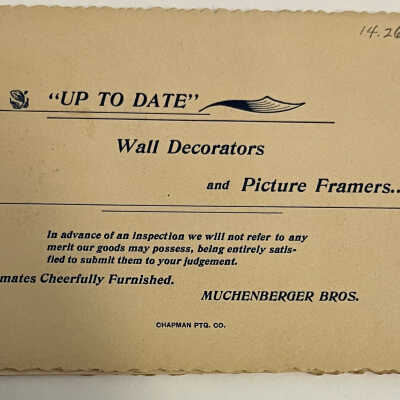 Muchenberger Bros Art & Artists Advertising Trade Card, undated. Up to Date Wall Decorators and Picture Framers. 817 Frederick Avenue. c. 1898