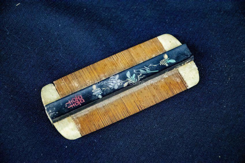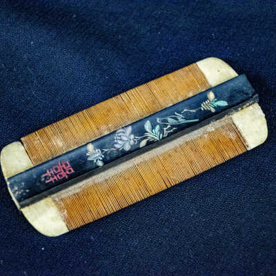COMB/DOUBLE EDGED/TEETH OF PLANT MATERIAL/BLACK TRIM WITH FORAL BIRDS & WRITING CARVED IN IT