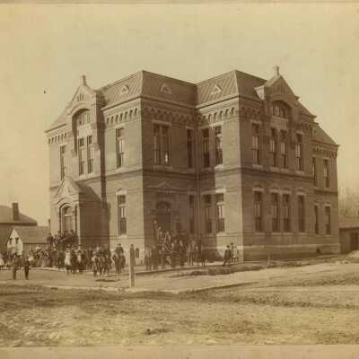 07.33.801 Exterior View, 2-story brick, tall school with triangular "arch" at roof line on both sides visible. tall windows, arched decorative border at top above windows, steep metal roof, many students and teachers in front, everyone is wearing a hat, dirt streets. 8 x 10", mounted, c. 1890