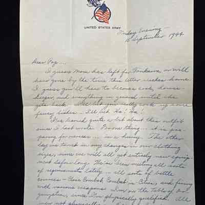 This letter is one page, front and back, written in blue ink on United States Army stationery which features a red and blue inked emblem centered on the page with an eagle in flight carrying a U.S. flag. The letter was sent in a plain envelope. The page is folded in half and then in thirds.
