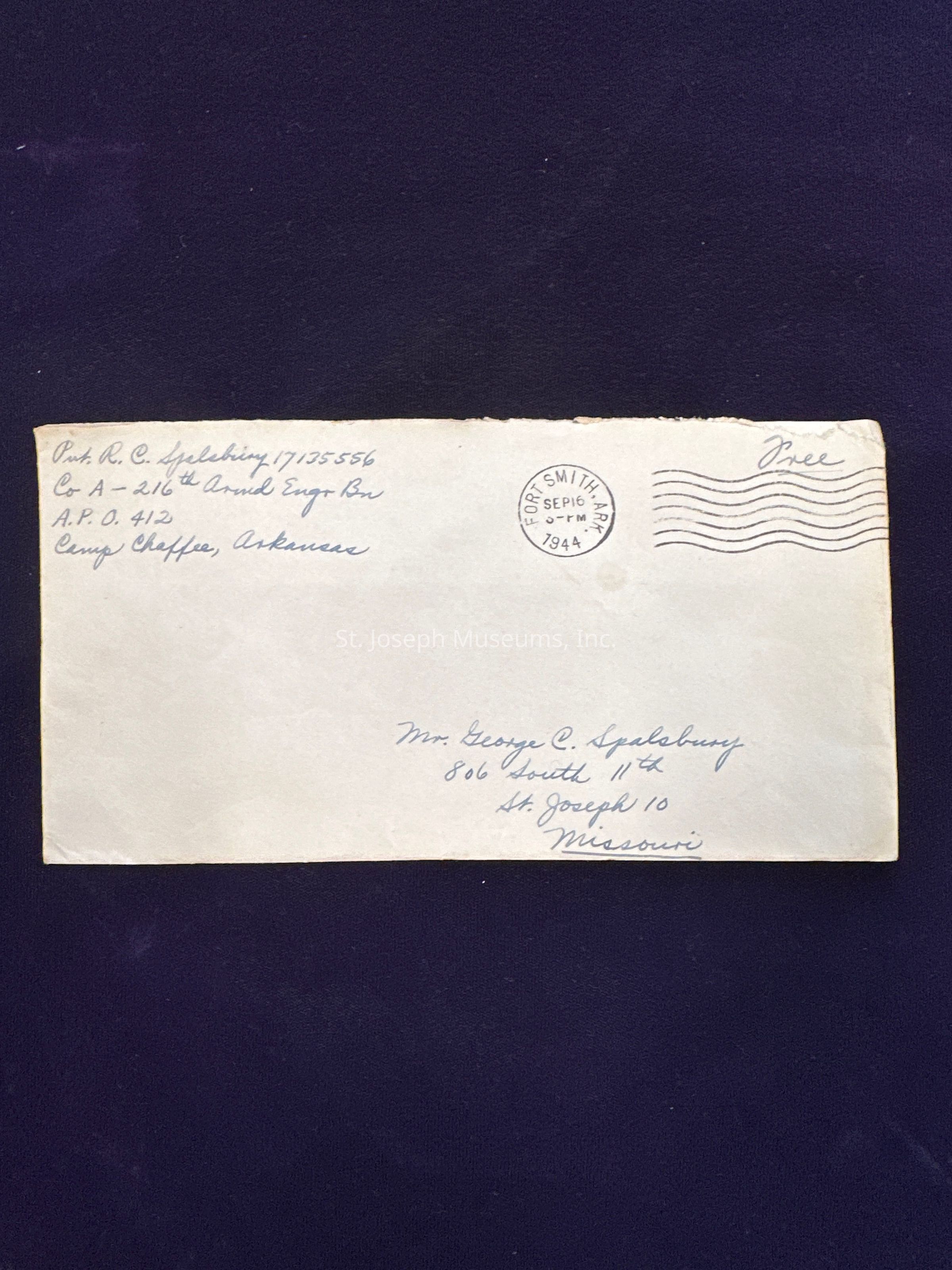 Letter Home from Pvt. R. C. Spalsbury, 17135556, Co A - 216th Armd Engr Bn, A.P.O. 412, Camp Chaffee, Arkansas to his father (only while his mother was visiting his grandmother in Oklahoma) Mr. George C. Spalsbury, 806 South 11th, St. Joseph (10), Missouri. Post marked SEP 16, 1944, 3 PM, Fort Smith, Ark., free postageDescription