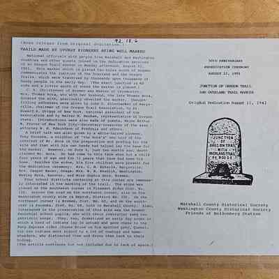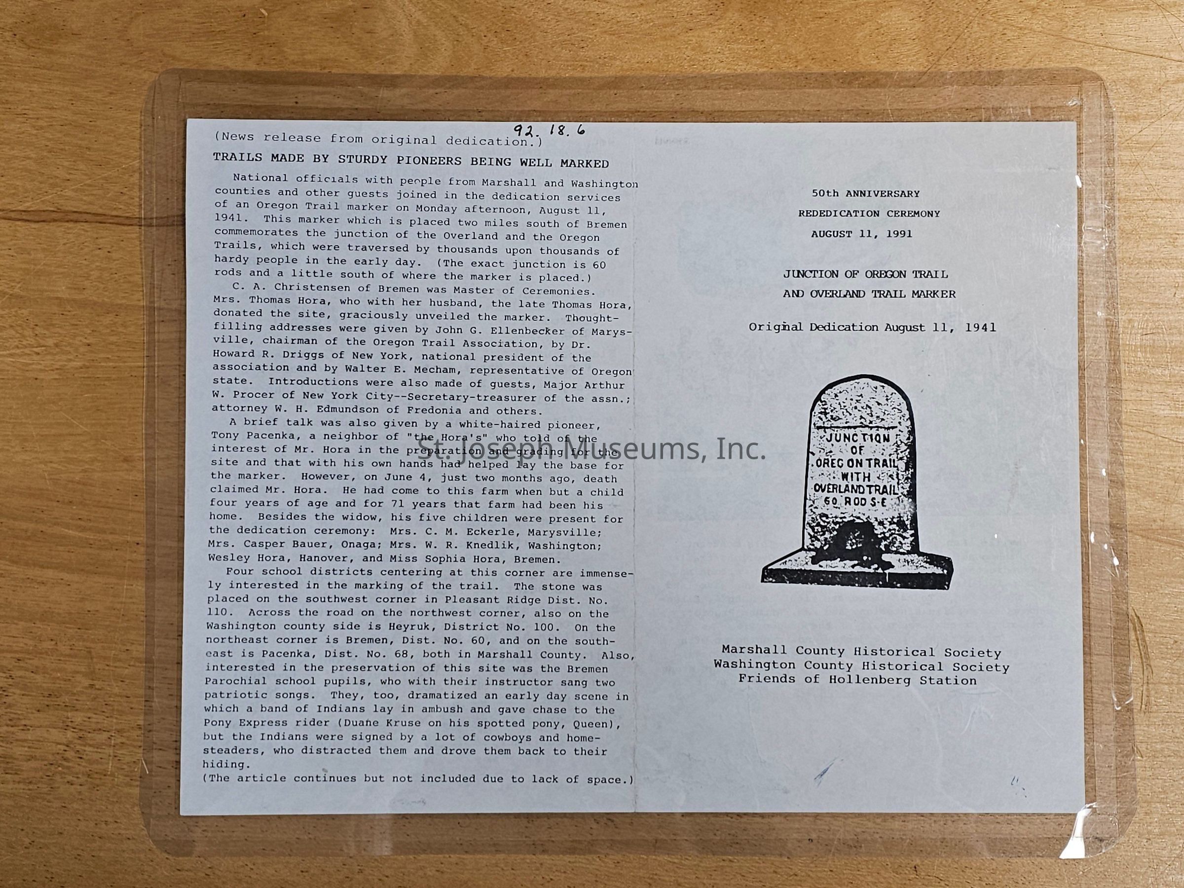 Program for the 50th anniversary/rededication ceremony for an Oregon Trail marker. Original dedication was August 11, 1941. Ceremony held by Marshall County Historical Society, Washington County Historical Society, and Friends of Hollenberg Station. Held 5pm on August 11, 1991