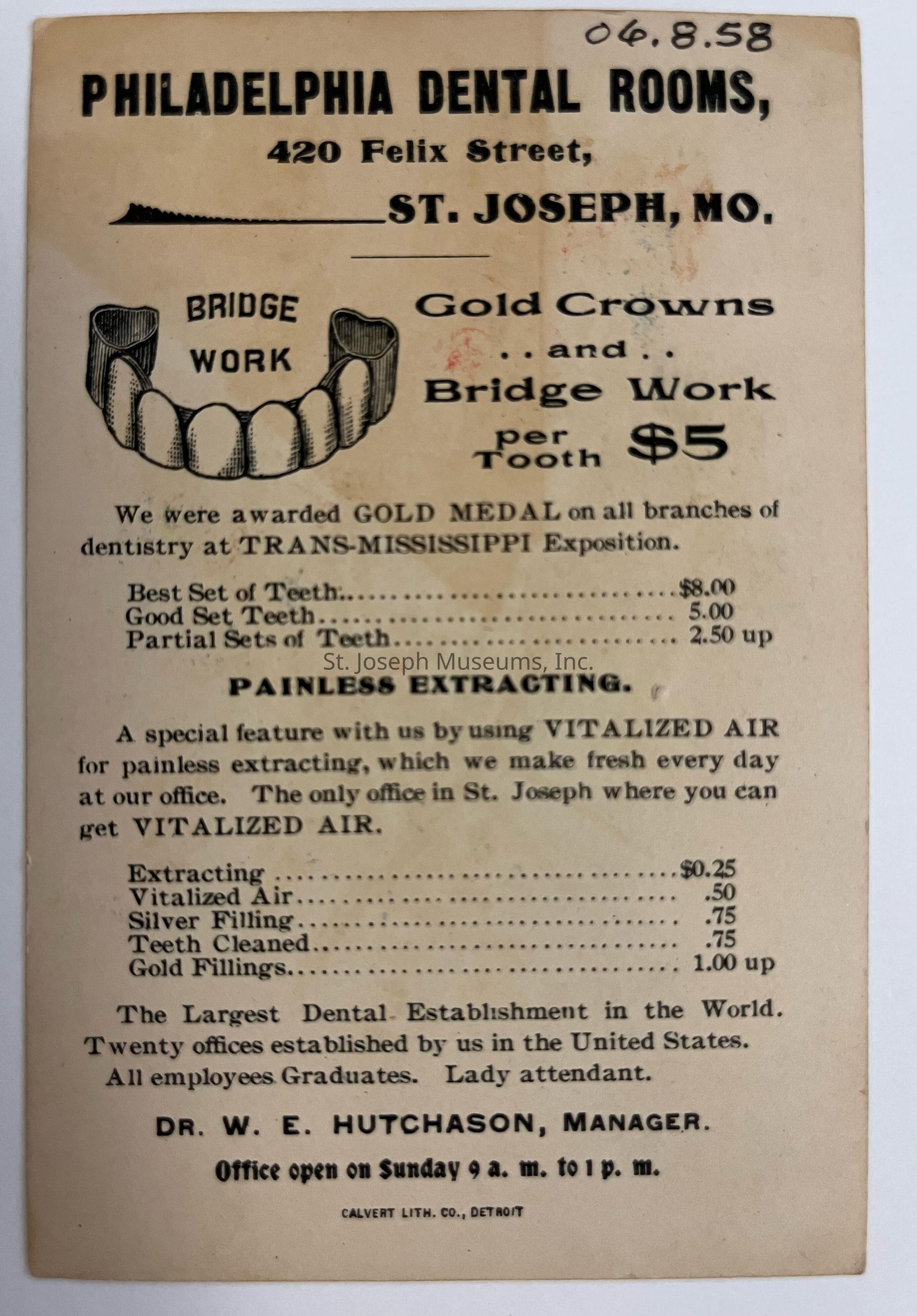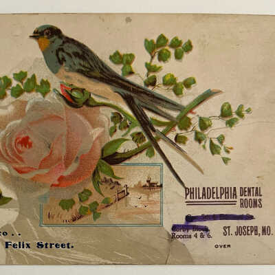 Philadelphia Dental Rooms, 420 Felix, Advertising Trade Card, undated. Dr. W. E. Hutchason, Manager. Color illustration of blue bird and rose on front. c. 1900