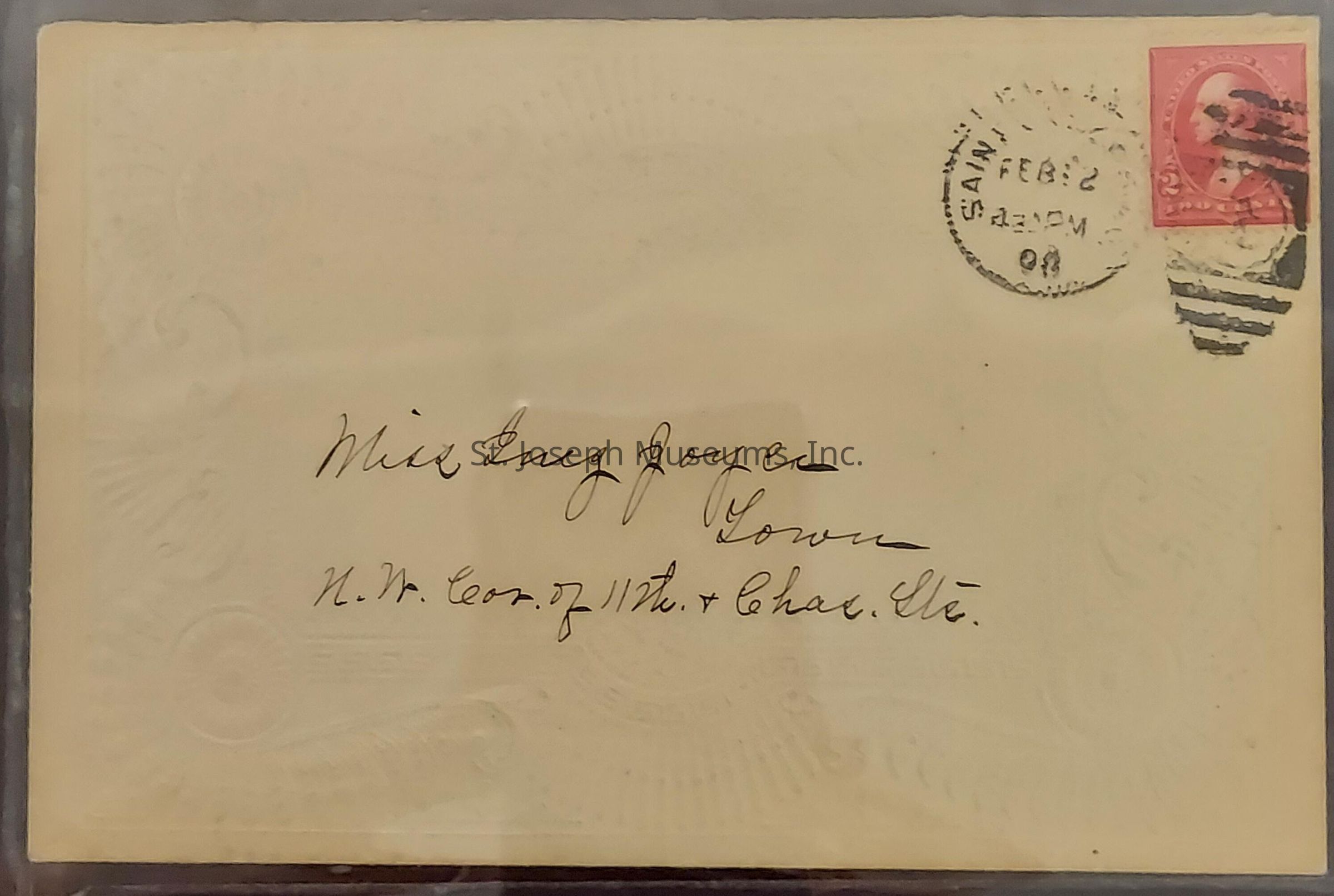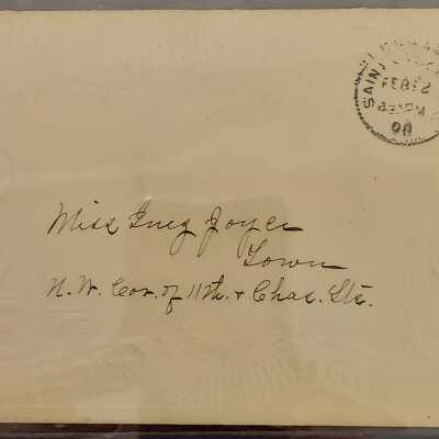 Card To Miss Inez Joyce. This card is addressed to Inez Joyce at the Northwest corner of 11th and Charles. This location is across from the Wyeth-Tootle Mansion. Dated 1898. Includes 2-cent stamp.