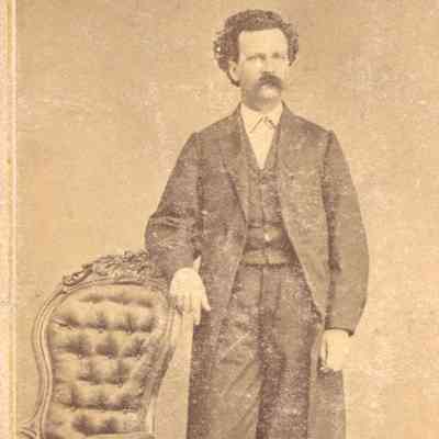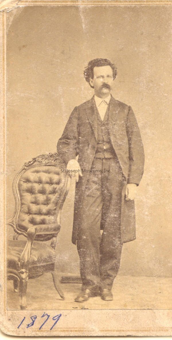 Robidoux Male, Unidentified, Photo, 1879. Sepia photo of man standing with his arm resting on chair. "Robidoux" handwritten on back. Photographer: Ulman & Rippel - 51 Edmond - St. Joseph, MO.