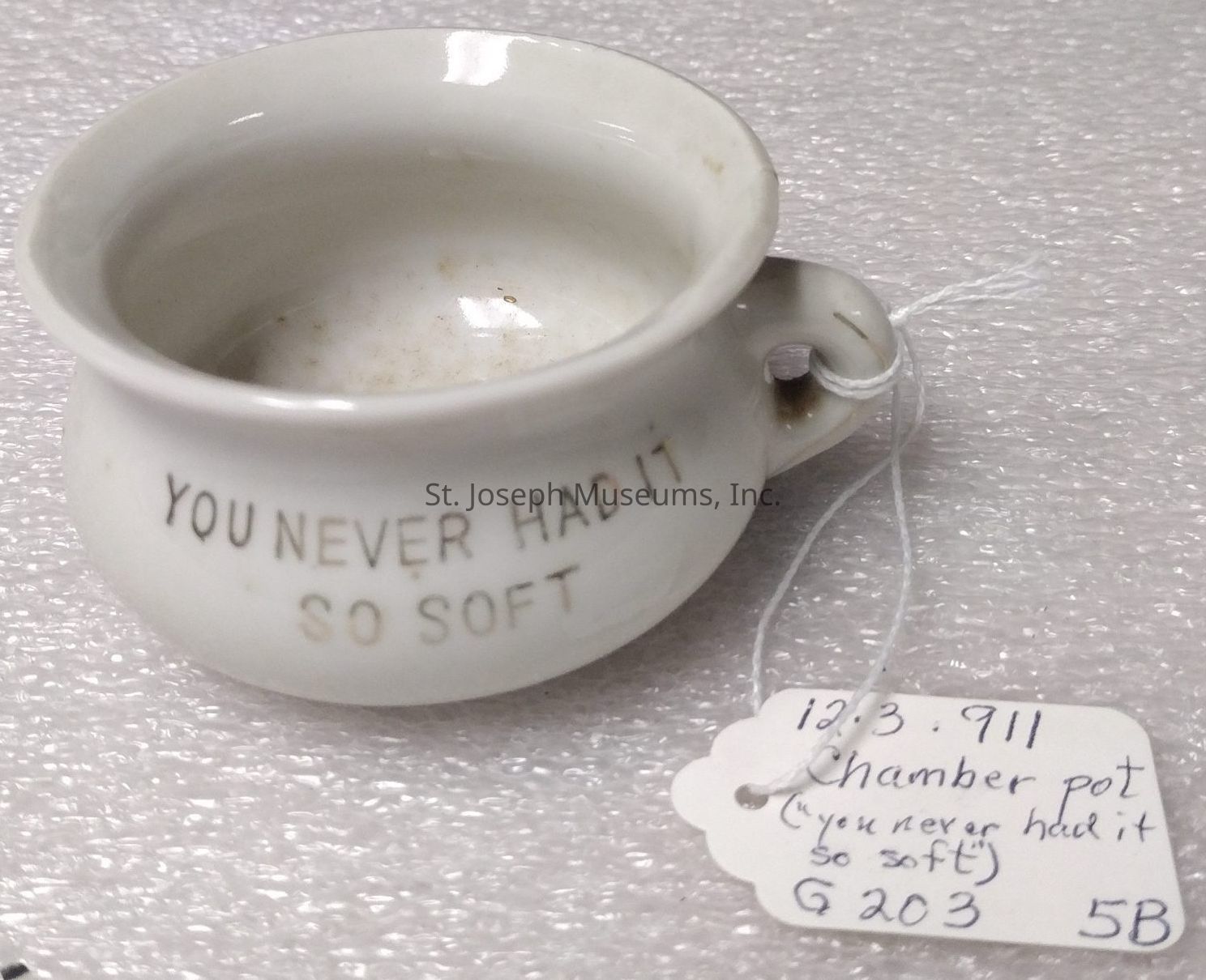 Porcelain miniature chamber pot, "You Never Had It So Soft". "Sonoco Japan" on bottom.