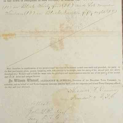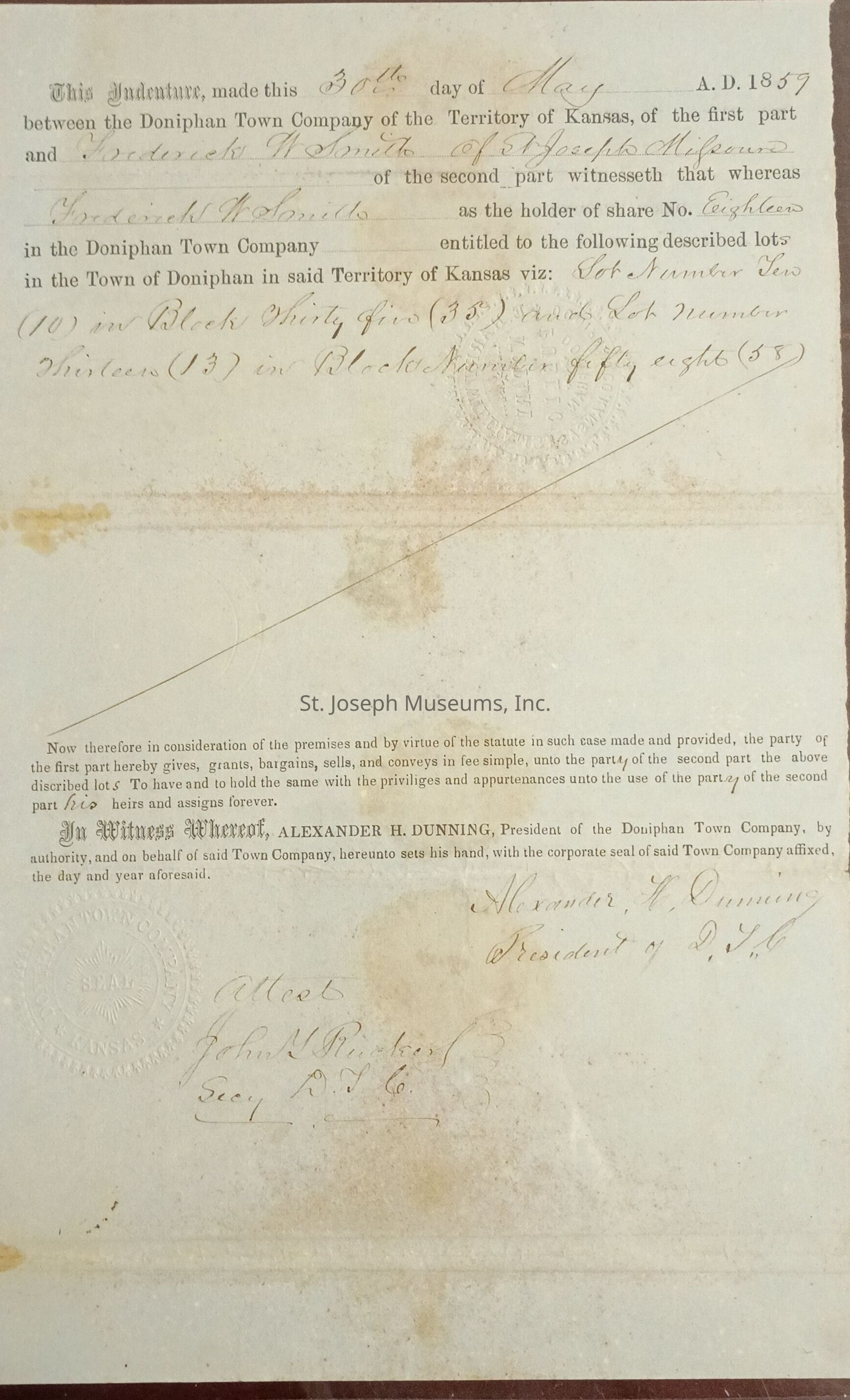 Deed Doniphan Town Co. of The Territory of Kansas to Frederick W. Smith who was the holder of share No. 18 is entitled to the following described lots: lot 10 in block 35 and lot 13 in block 58 in the Town of Doniphan in Territory of Kansas. Dated May 30, 1859, recorded July 5, 1859.Lexicon