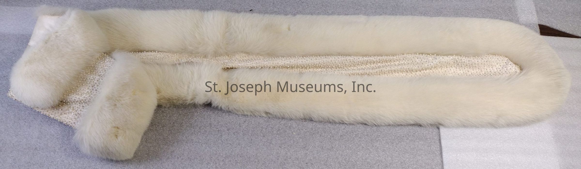 B-Stole/white/fully covered with pearls/fur at edge/one end folded and sewn into a muff/satin or nylon/85" long