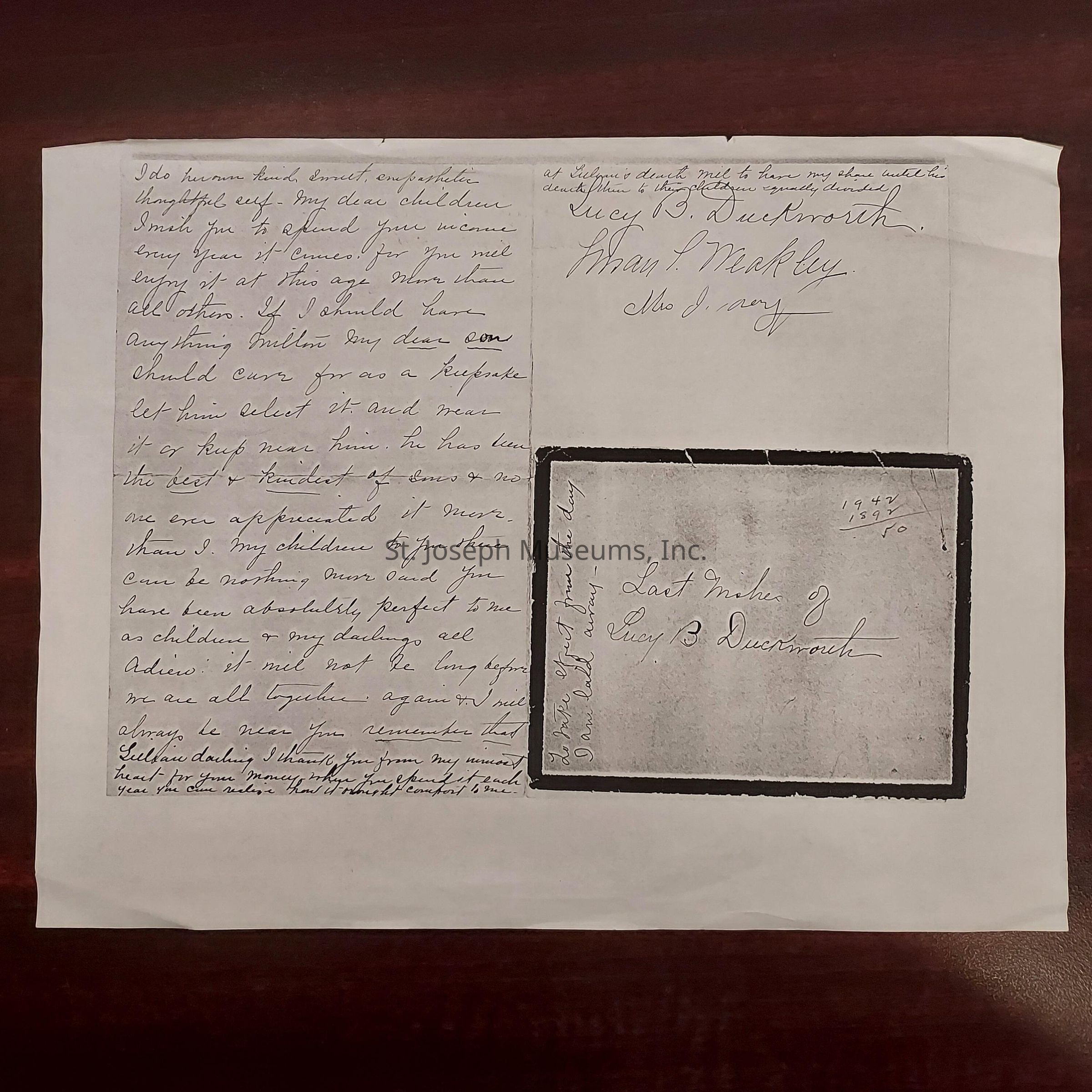 Last Wishes of Lucy B. Duckworth hand-written on the back of a marriage announcement of Lillian B. Duckworth to Milton Tootle, February 1, 1898. Envelope included.
