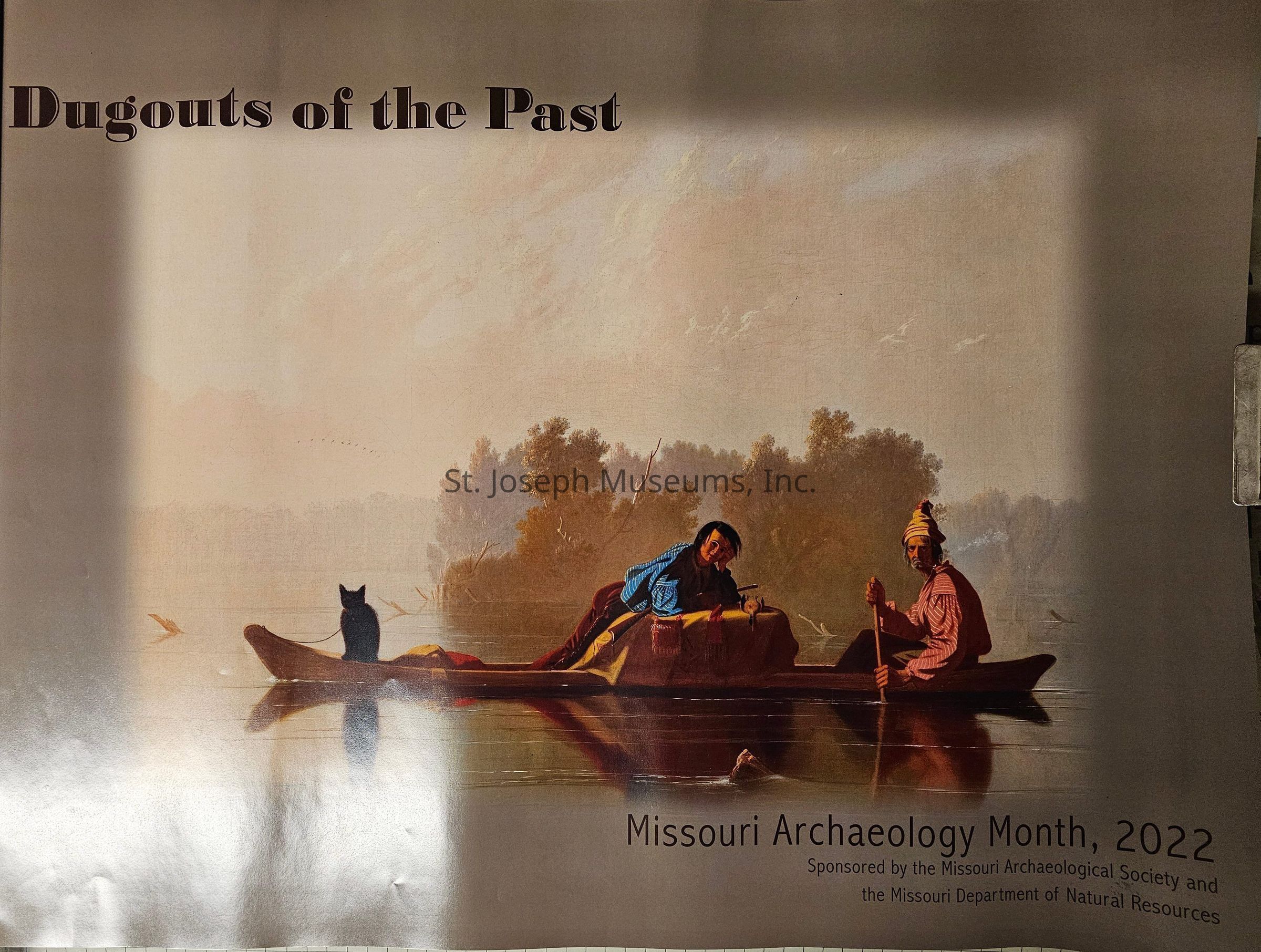 Poster published by the Missouri Archaeological Society for Missouri Archaeology Month 2022. Poster is focused on Dugouts of the Past. On one side there is information about different dugout canoes that have been excavated in Missouri along with adzes. The reverse is an image of indigenous people in a canoe.