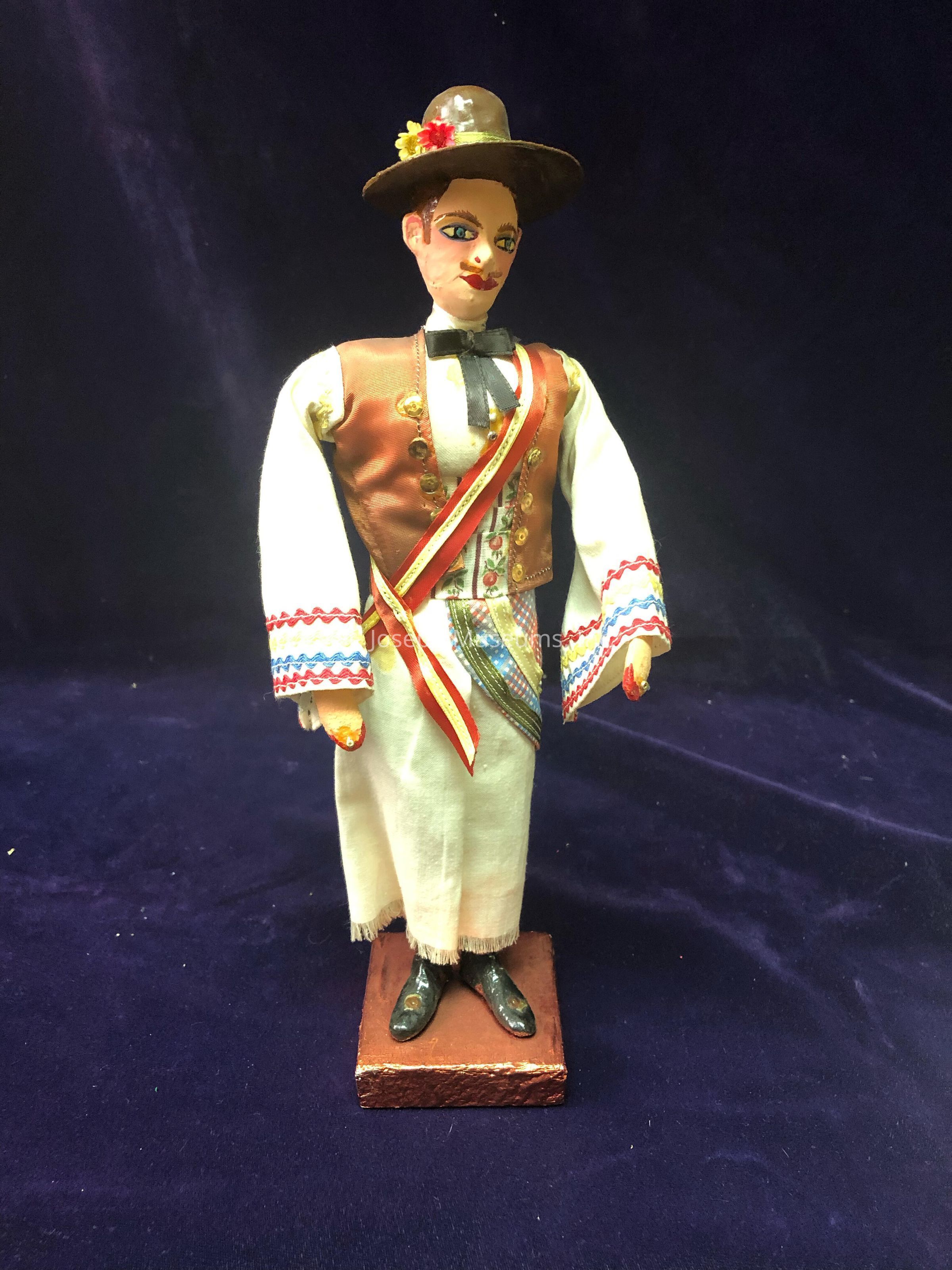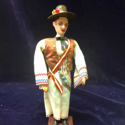 Doll is dressed in white cloth with red, yellow, and blue trimming with a brown vest and hat.Use