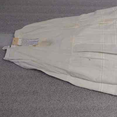 The image depicts a double petticoat made of white cotton fabric, showcasing an embroidered design with lace detailing towards the bottom. The lace panels include patterns of small eyelets.