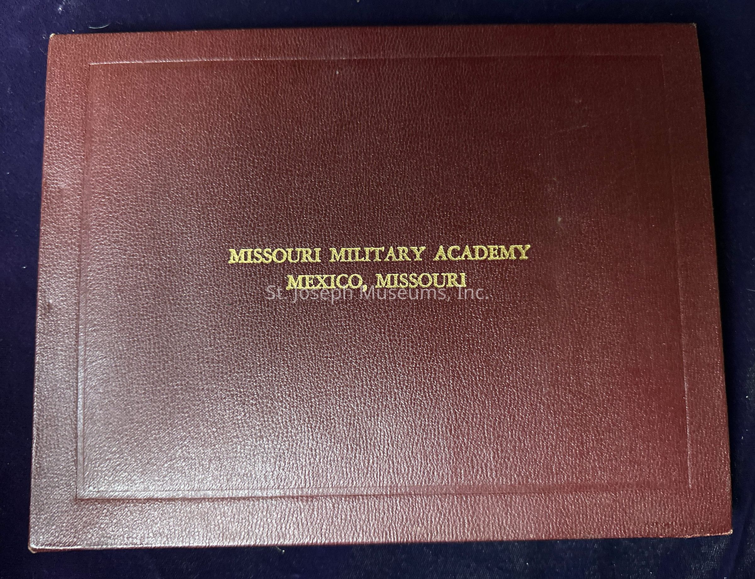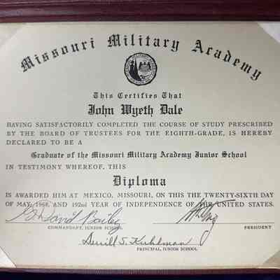 Leather bound Mexico, Missouri Military Academy diploma with gold lettering awarded to John Wyeth Dale.