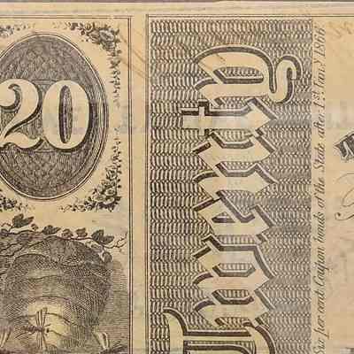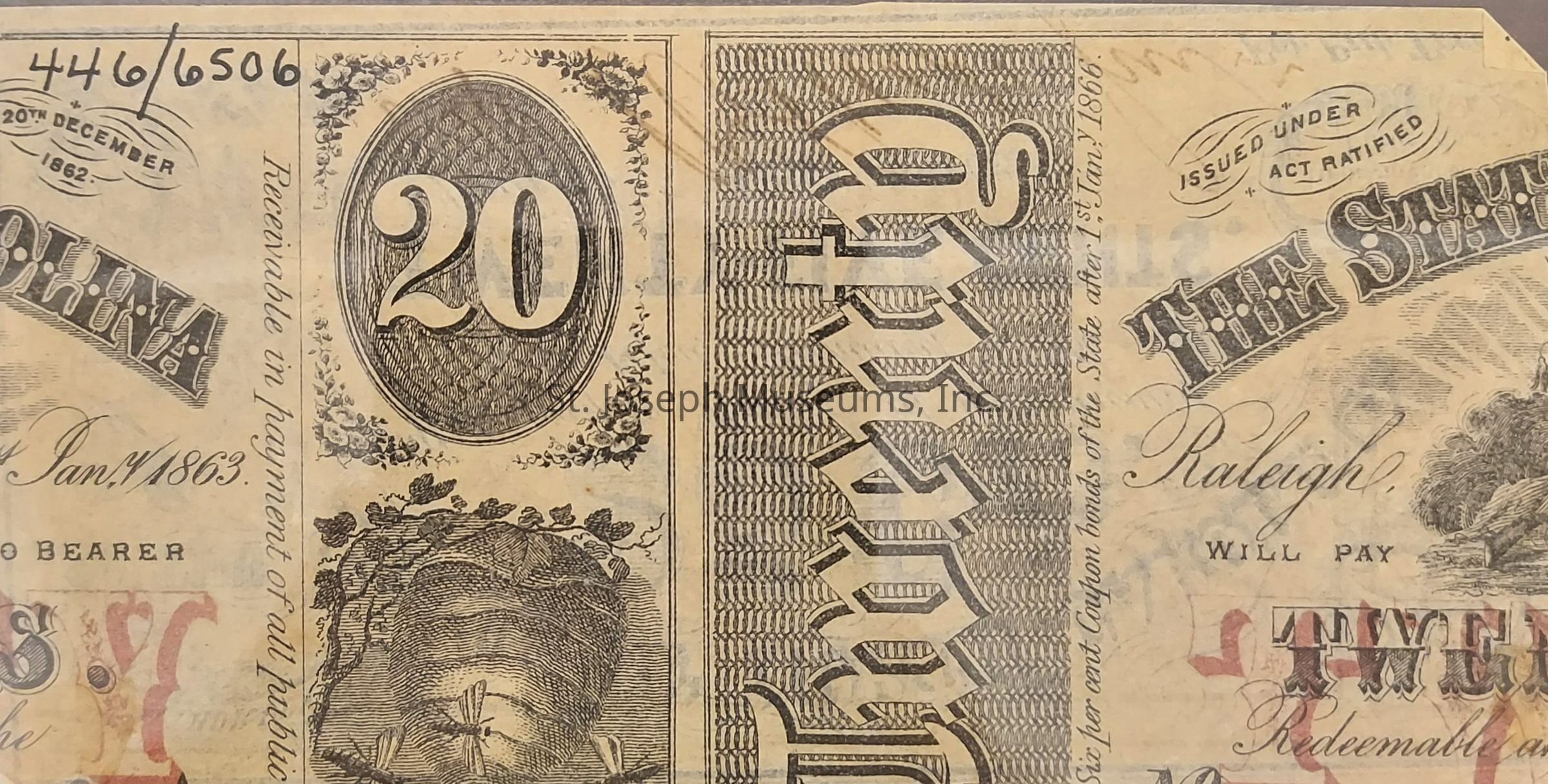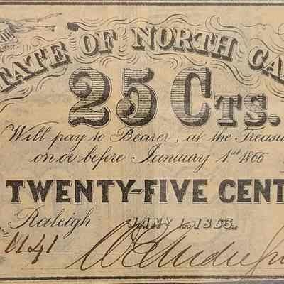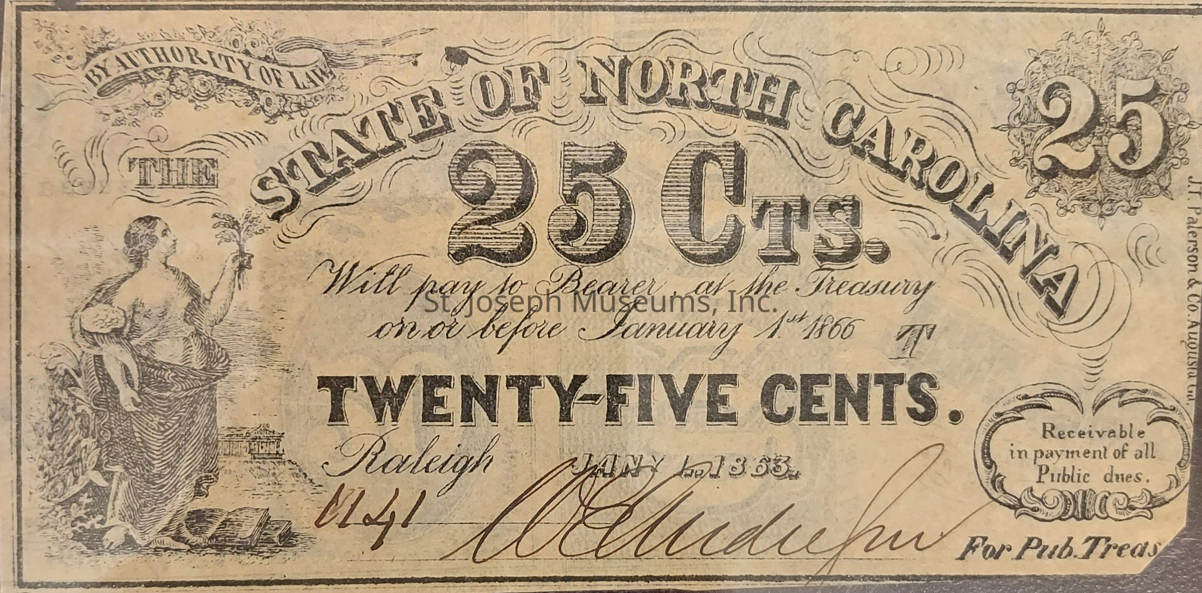 Confederate Currency Twenty-Five Cents State Of North Carolina Confederate. Will pay to bearer on or before January 1, 1866. No. 1141, Raleigh. Dated January 1, 1863.Lexicon
