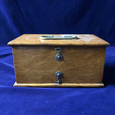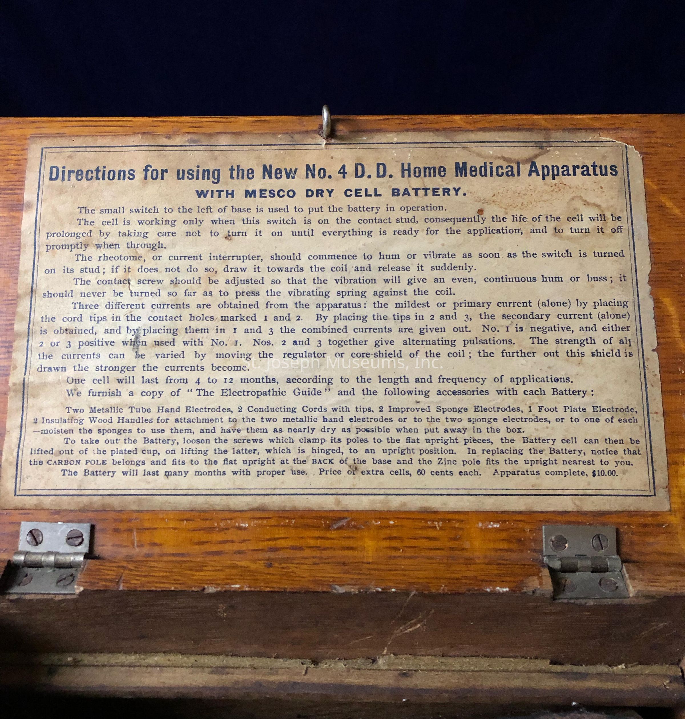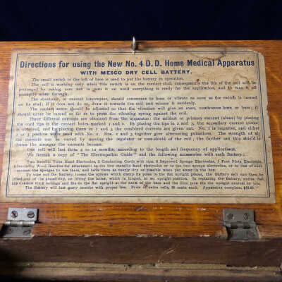 New No. 4 D. D. Home Medical Apparatus in wooden box, containing directions for operation of Medco dry cell battery.Use