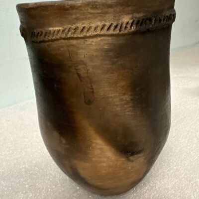 This piece of pottery was created around 1970 by a Navajo potter (artist previously known). This style of pottery is called a pitch pot. The distinct coating of piñon and pitch that creates this golden brown/dark brown coloring is unique to Navajo pottery. This covering originally sealed pots to be used for carrying water and food and was created by using a rag-covered stick covered in boiling pine pitch and "painting" the pitch all over the pot. This particular style of a smooth, undecorated body with a single decorative braid at the top is a common Navajo motif