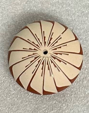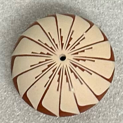 Property P21: Geraldine Sandia, Red on Red Seed Pot, Object: pottery, Artist/Maker: Sandia, Geraldine (b.1950, Jemez: NM), Title/Model: Red on Red Seed Pot, Date/Region: ca. 1980 / New Mexico, Medium/Technique: earthenware, polished and unpolished slip/coil, Edition/Series: unique, 1 of 1, Size: 2" H x 3.75" W x less than .5" opening, Condition: good, Signature/Inscriptions: yes, "G. Sandia", Exhibitions/Literature: n/a, Description/Notes: The shoulder has an even pattern of pointed feathers as decoration. Sandia uses local clay and her surfaces are sanded, hand painted and stone polished before traditional outdoor firing. Her method is called two-tone polychrome. Artist made imperfections on decorative unpolished slip from air bubbles. Scratched in pencil on bottom is "To". A white paper adhesive sticker on the bottom reals "273".Collection