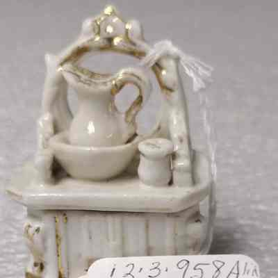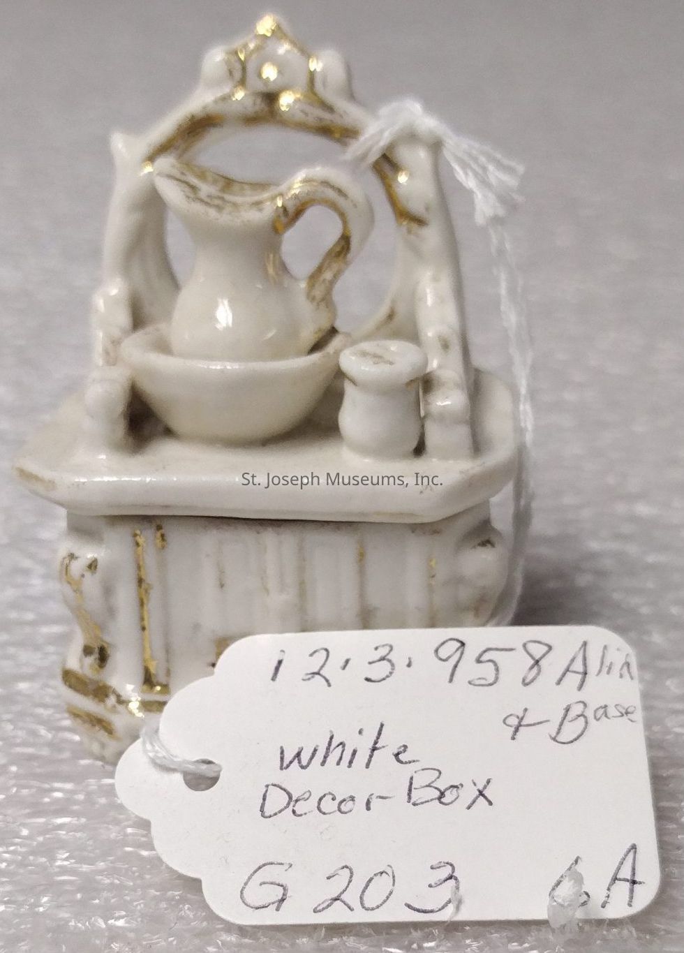 Ceramic mini what-not box with lid. White Lid - pitcher/bowl and jar attached. Base - square, footed.