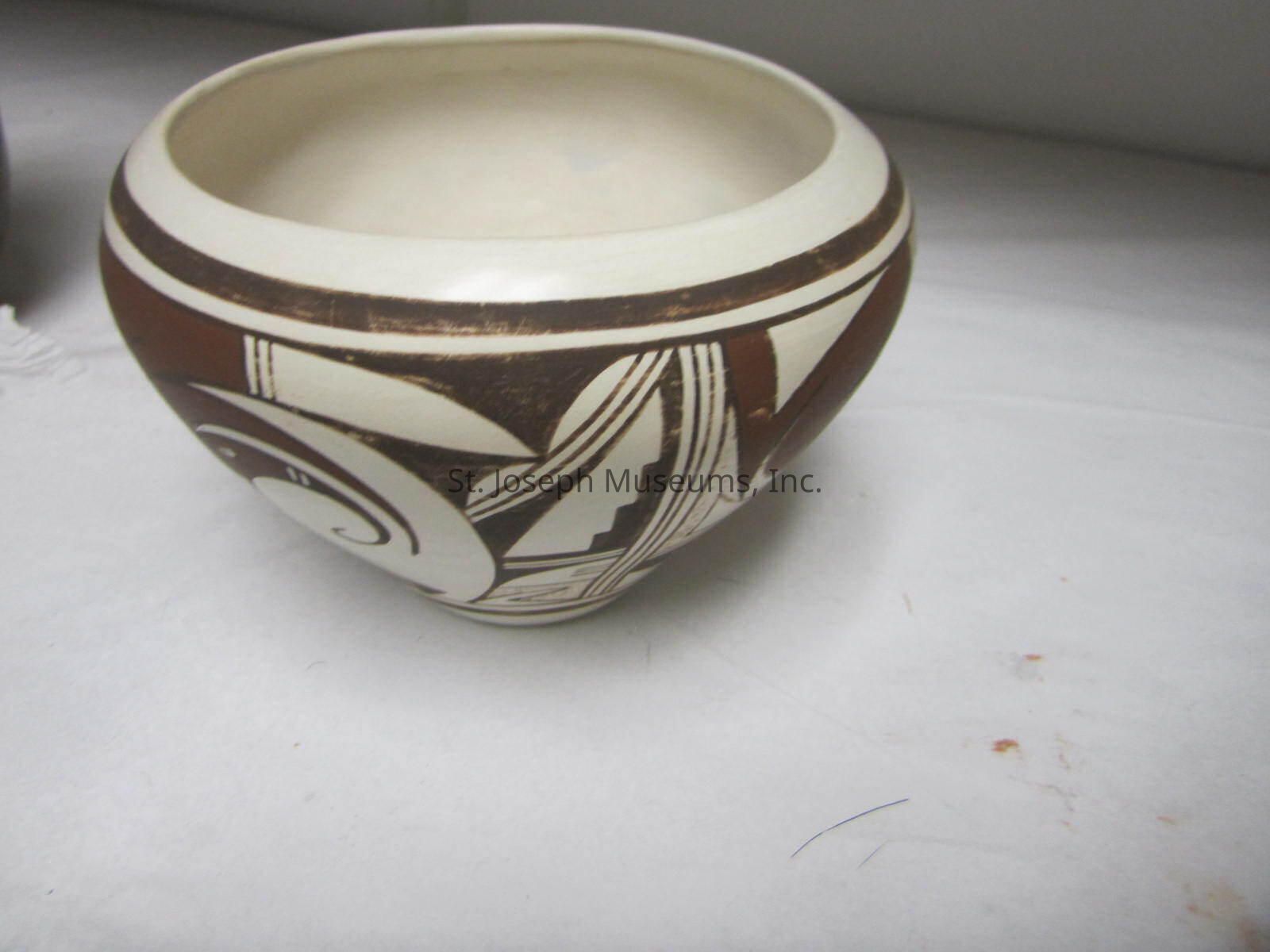 Property P26: Joy Navasie, Bowl, Object: pottery, Artist/Maker: Frogwoman, Joy Navasie, (1919 - 2012, Hopi: AZ), Title/Model: Bowl by Joy Navasie, Date/Region: ca. 1950 / Arizona, Medium/Technique: earthenware, polychrome / coil, Edition/Series: unique, 1 of 1, Size: 4.65" H x 6.25" W x 5" opening, Condition: good, Signature/Inscriptions: yes, web foot frog symbol, Exhibitions/Literature: n/a, Description/Notes: A feather and stylized parrot design is created with brown on cream, outlined in black. The usual wear resulting in rubbed off or minor paint loss is throughout and it is consistent with the age, however, the comparable Navasie pots did not appear to have as thin of an application of paint or loss of paint in some areas. The condition of the paint does create a detracting factor from the value.Lexicon