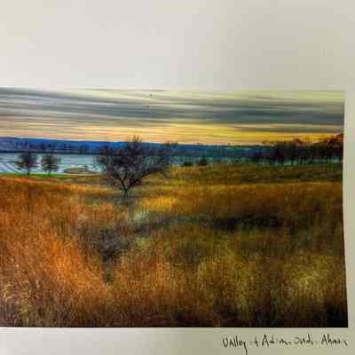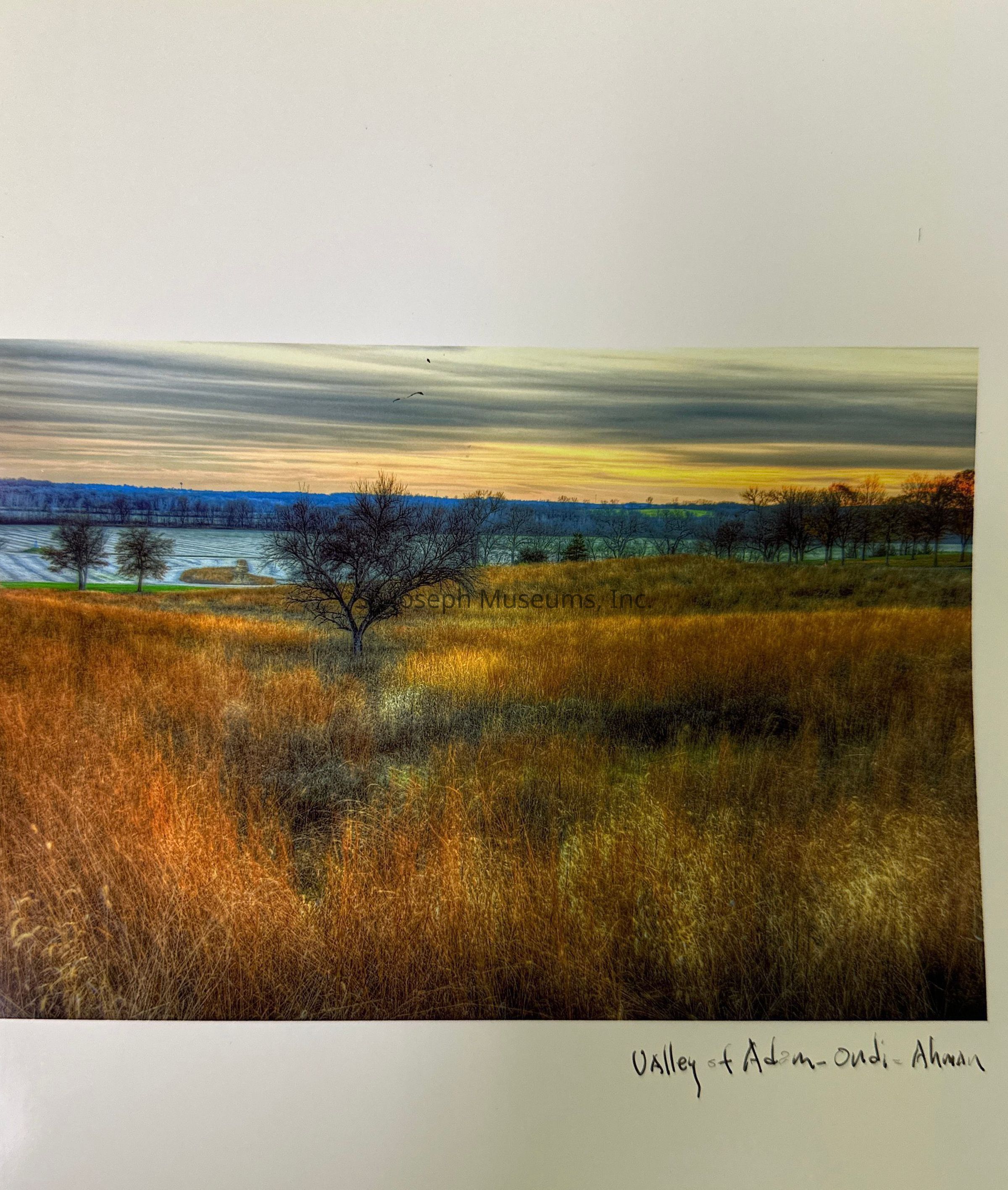 Colorized photo of open field at Adam Ondi Ahman with prairie grass, trees, and snowy fields