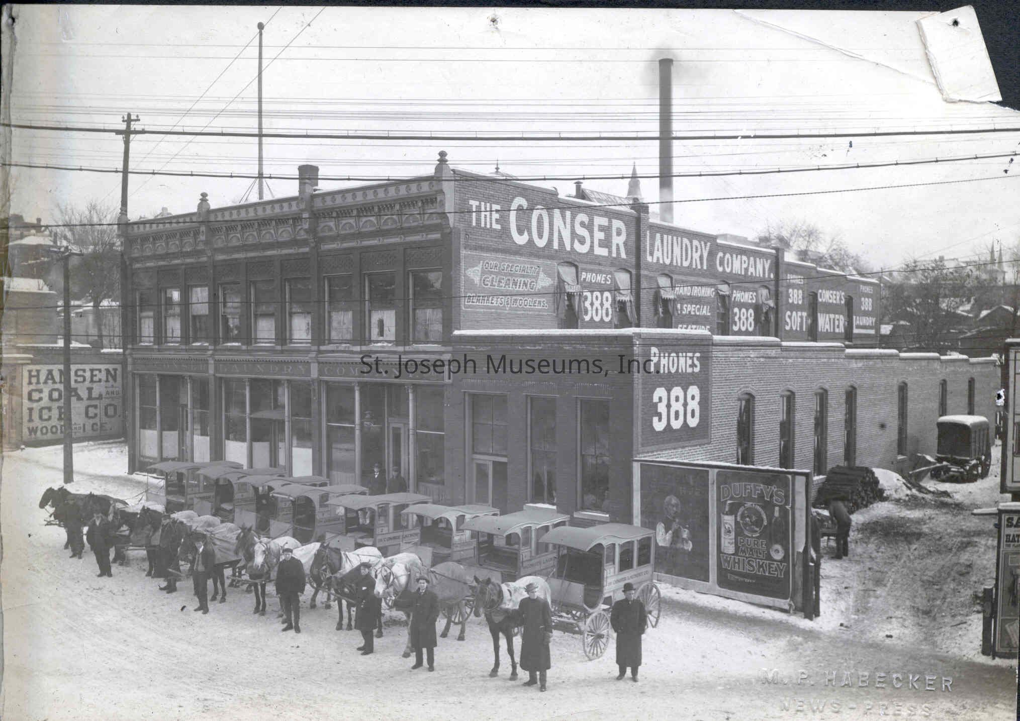 Conser Laundry Company Photo, c. 1920's. b/w. Photo of 2-story brick structure on corner. Nine delivery wagons with their horses & drivers are lined up in front of the building. Signs on the building include: "The Conser Laundry Company"; "Phone 388"; "Our Specialty Cleaning Blankets & Woolens"; "Hand Ironing Special Feature"; "Soft Water". Hansen Coal. Co. across the street