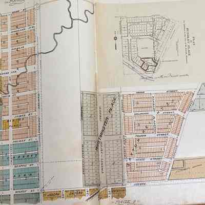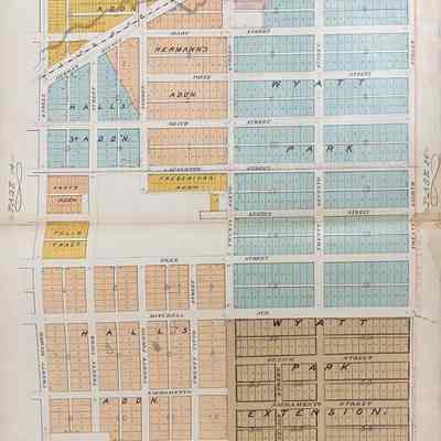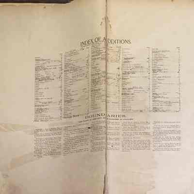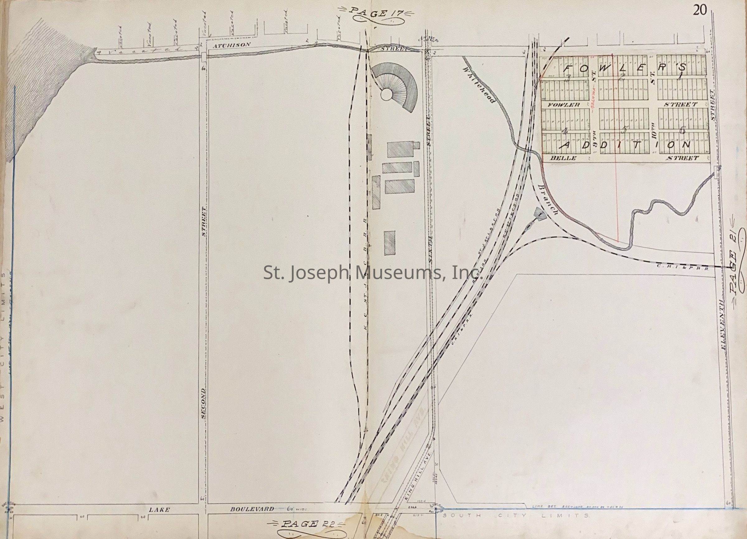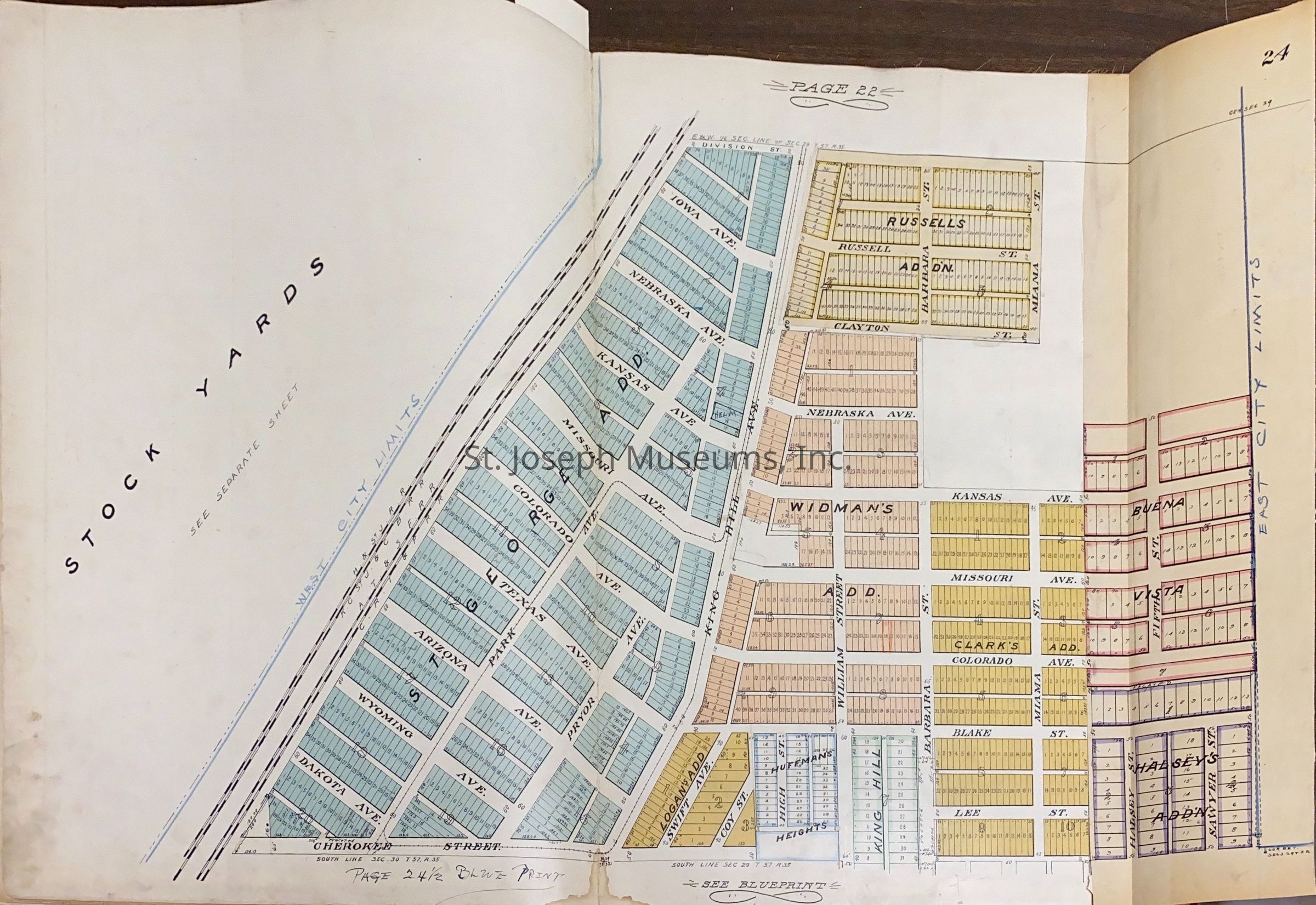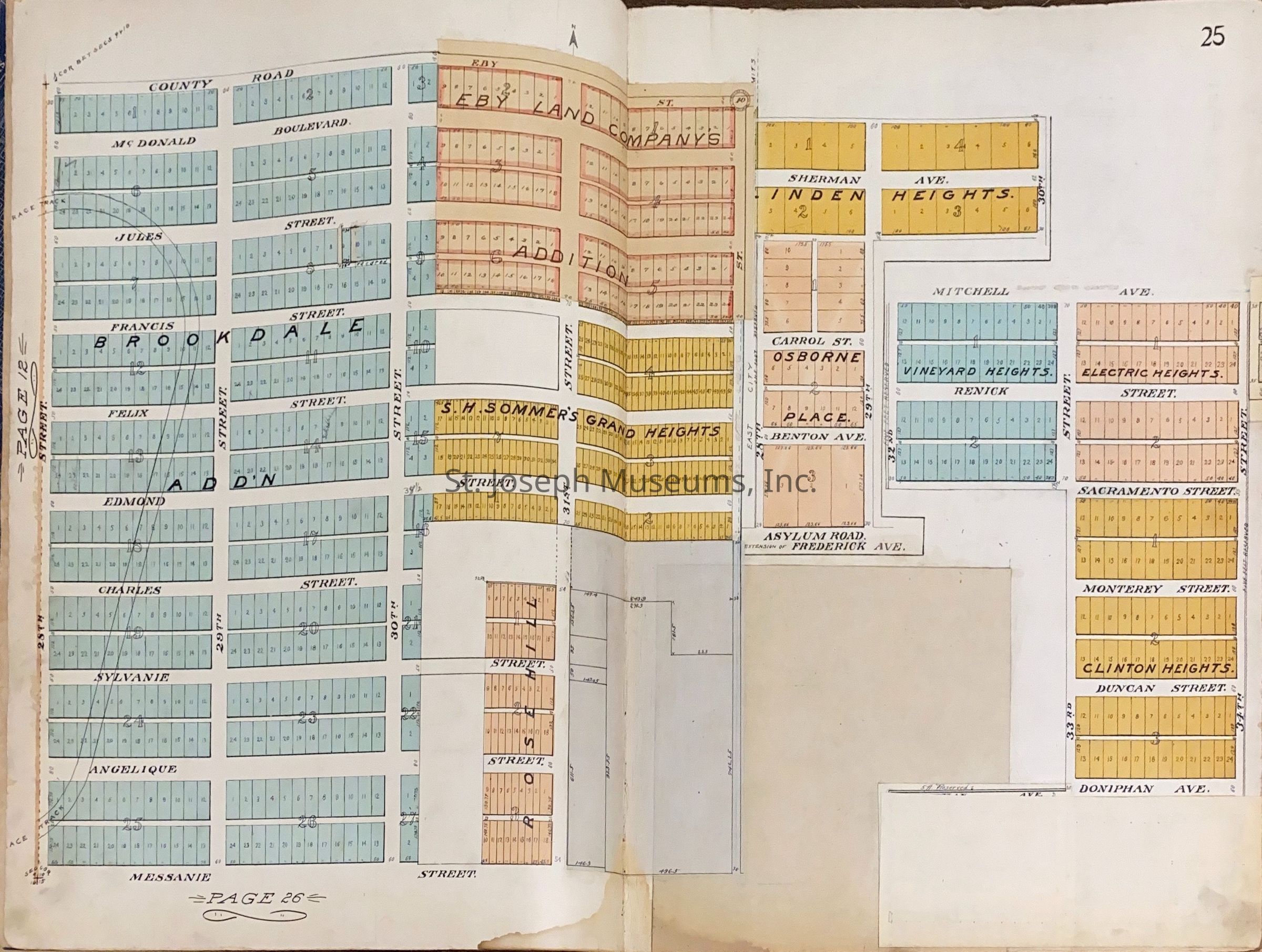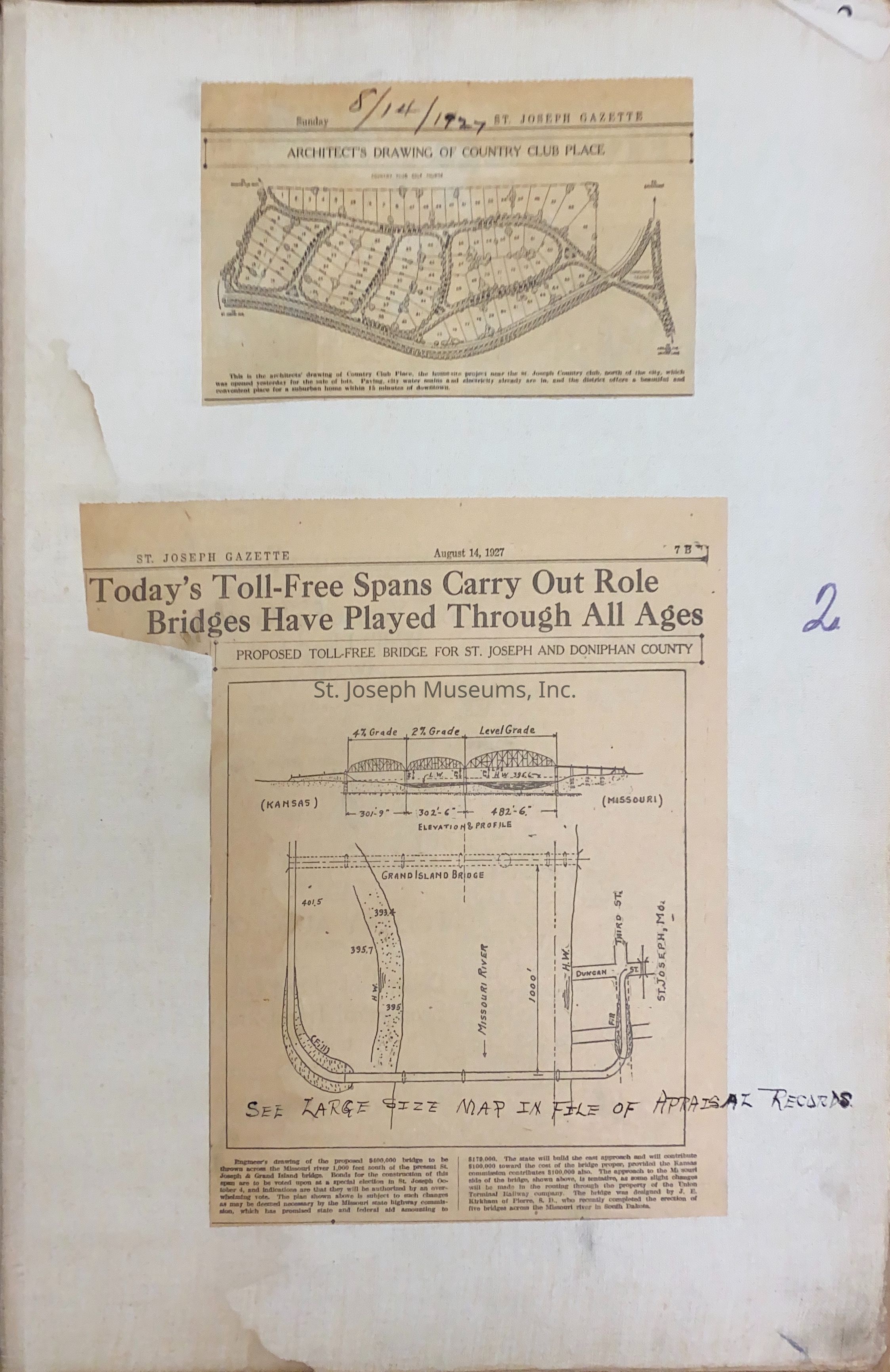 Atlas of the Cityof St. Joseph has index of additions and boundaries - Plat #1 thru Plat #30. Also in pages is a copy of Sept. 9, 1936 St. Joseph News-Press which shows voting precinct maps and a copy August 14, 1927St. Joseph Gazette of architects drawing of Country Club Place. Book has pages on additions to the city up to approximately 1920.