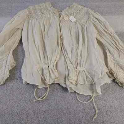white/BUTTONS DOWN FRONT/NO COLLAR/LACE INSETS OVER SHOULDERS & AROUND NECK/MUTTON TYPE 3/4 LENGTH SLEEVES/TIES AT WAIST