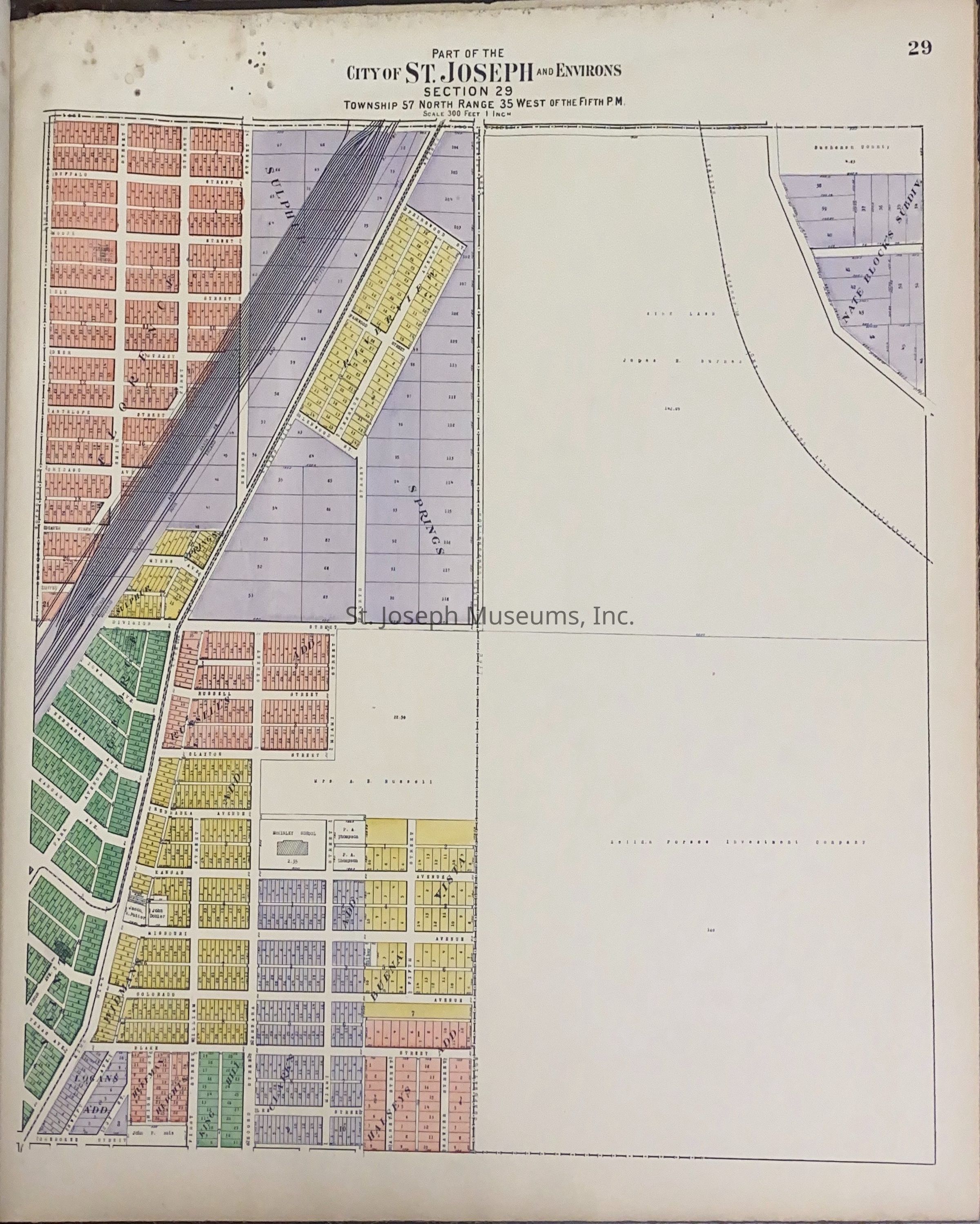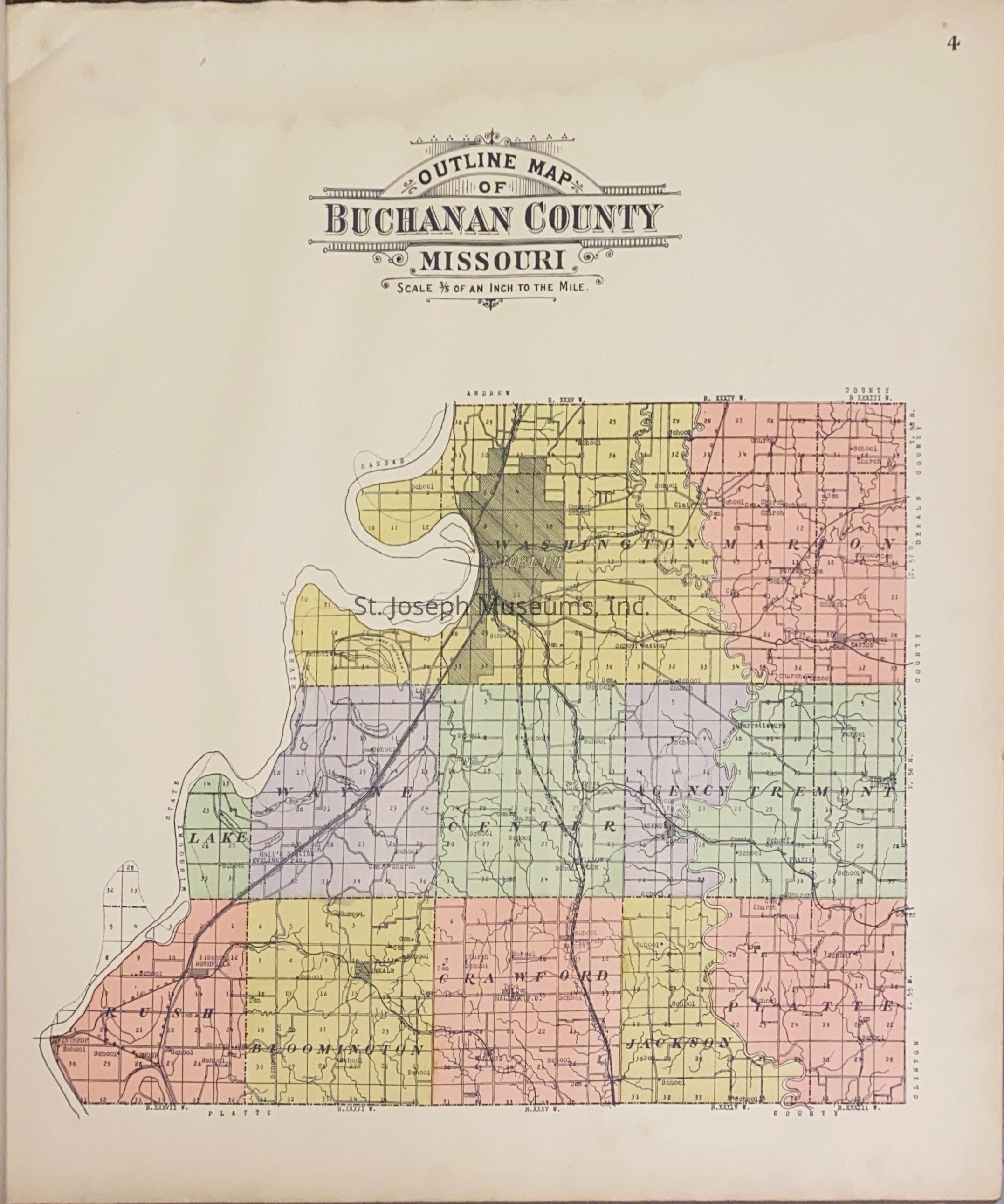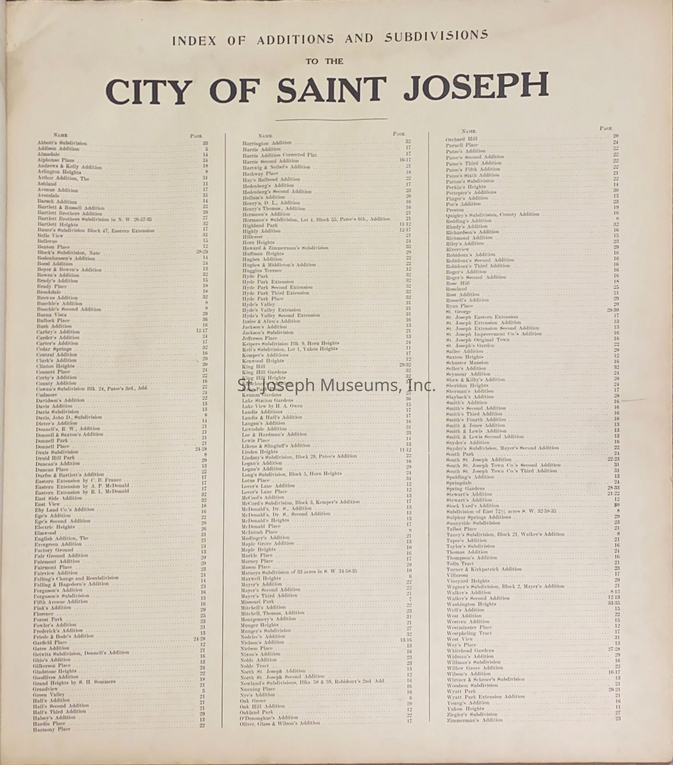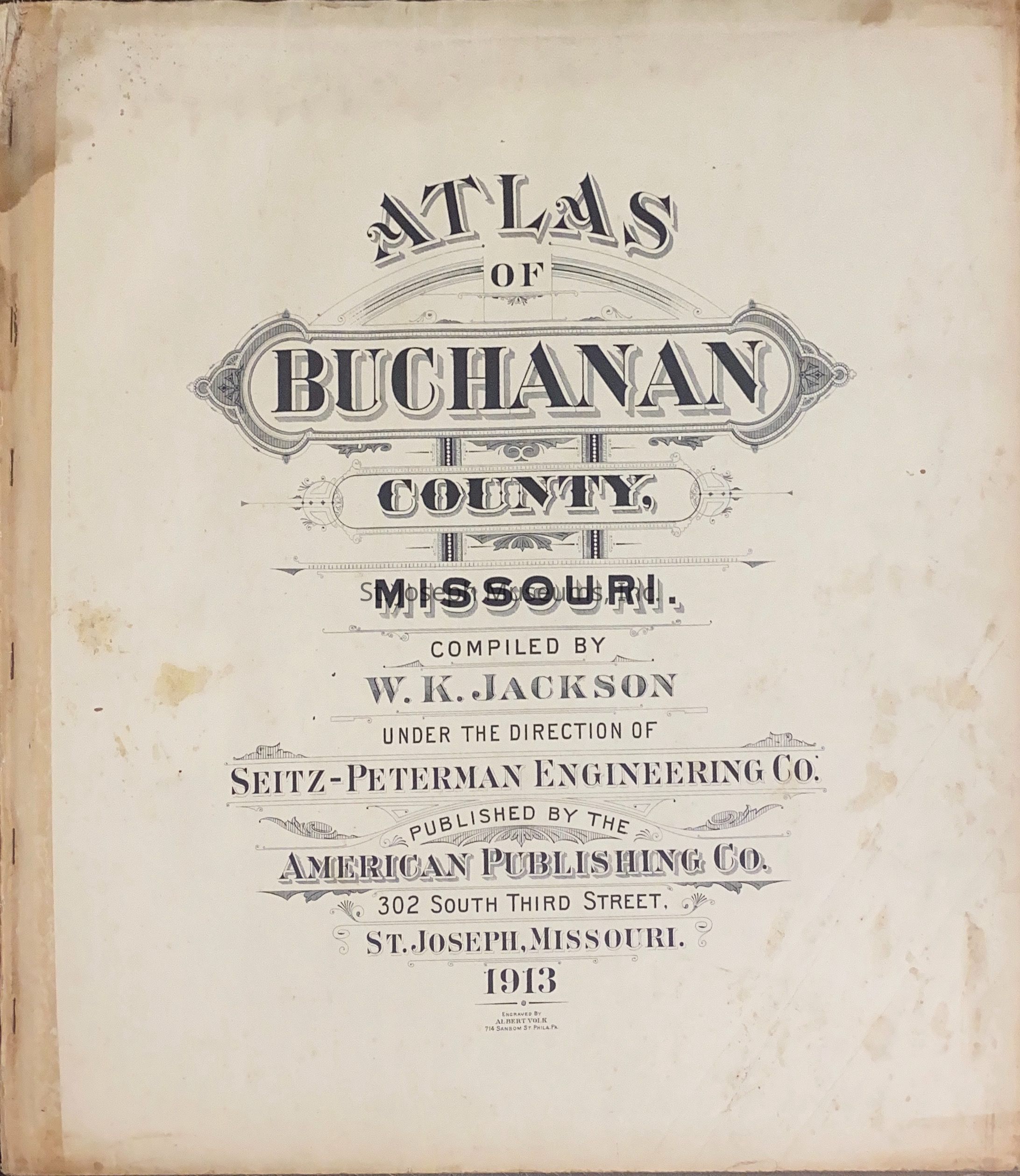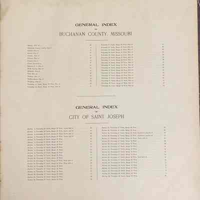 Atlas of Buchanan County, Missouri is an index of Buchanan County by township, section and range. Index of St. Joseph, Missouri by section, township and range and and index for additions and subdivisions of St. Joseph under the direction of Seitz-Peterman Engineering company.