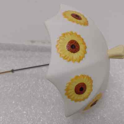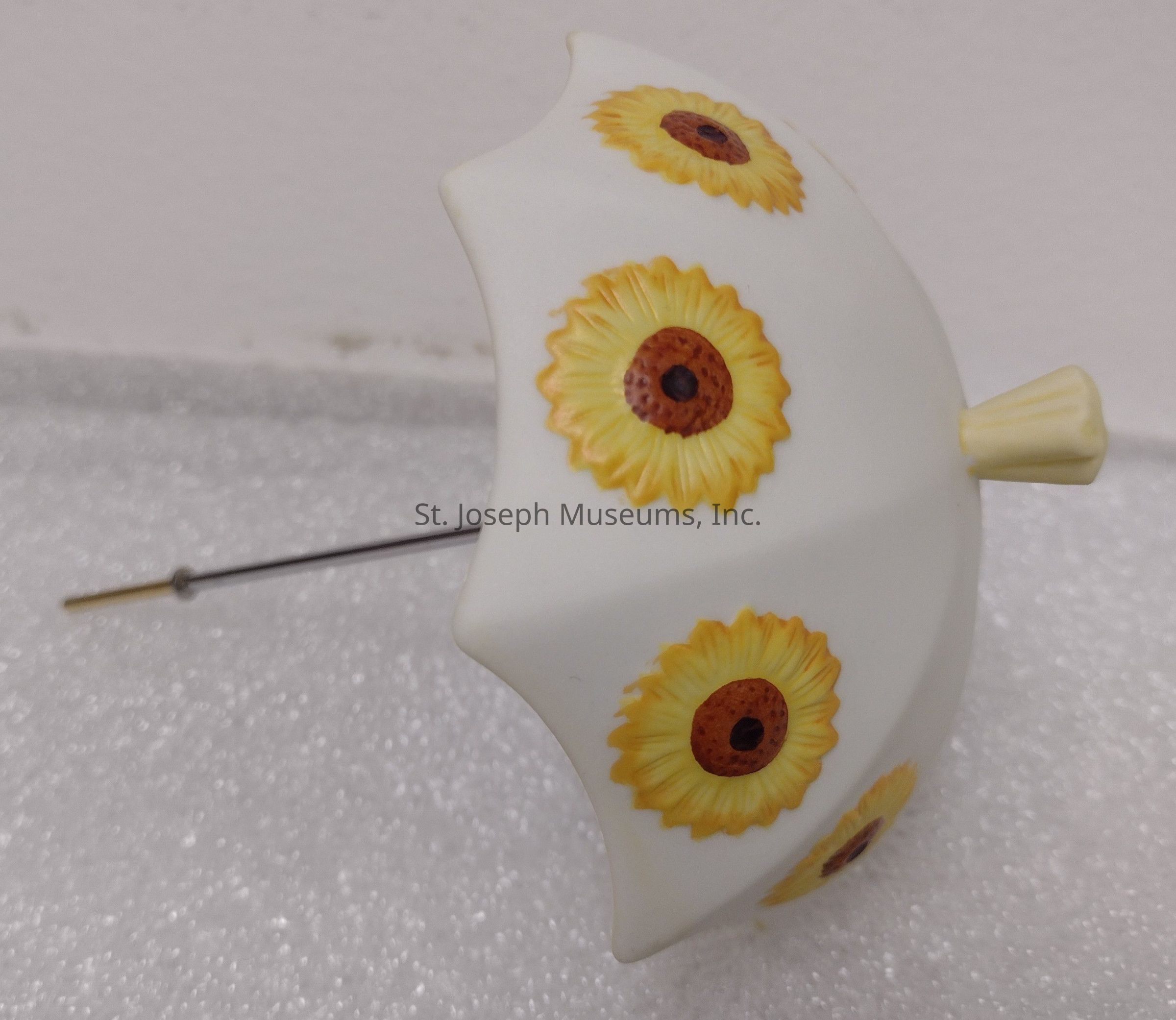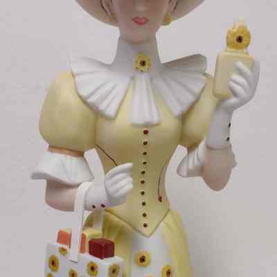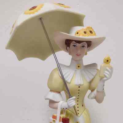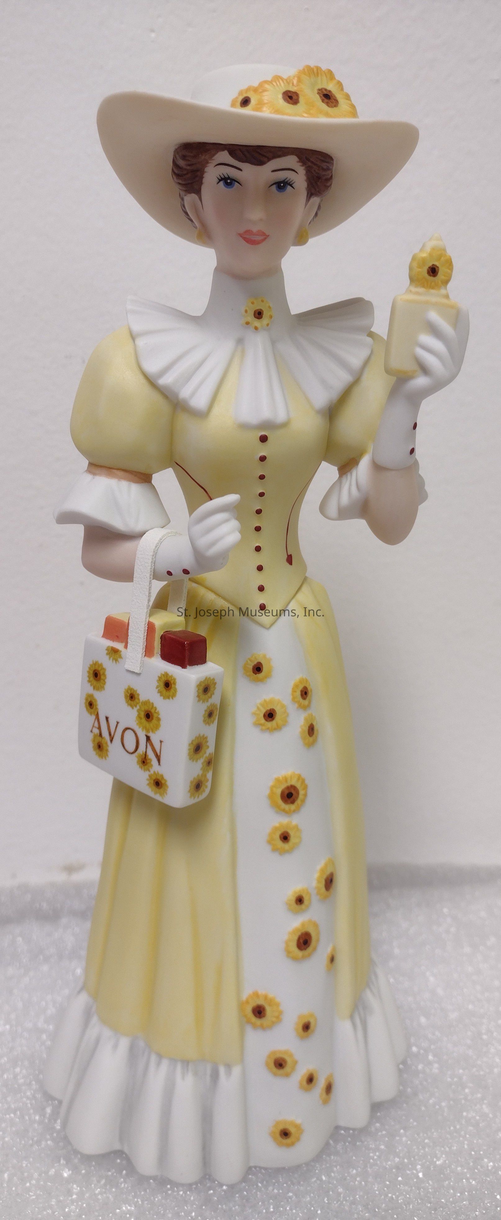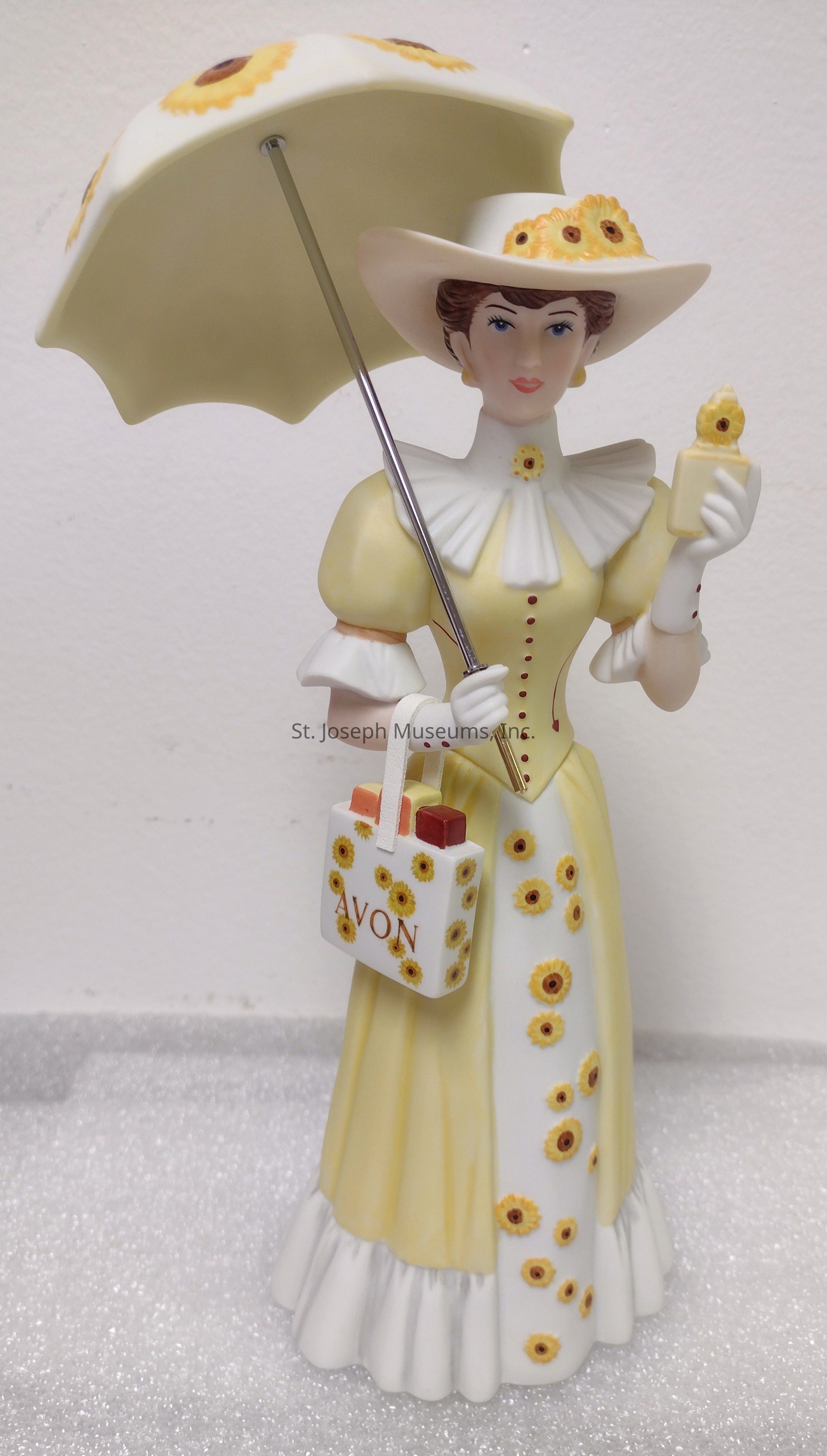 This figurine of Mrs. Albee is adorned in a bright yellow dress with sunflower decoration. The figurine is holding a bottle of perfume in hand and carrying a white sunflower Avon purse on her arm. Pairing with the figurine is a separate porcelain umbrella decorated in sunflowers.Inscription/Signature/Marks