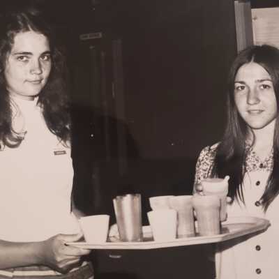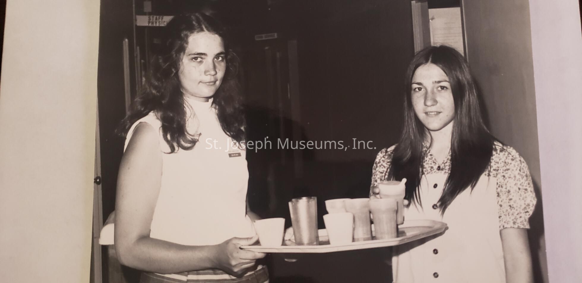 State Hospital Staff Photo of Volunteers, c. 1980. Volunteers with a tray of cups.