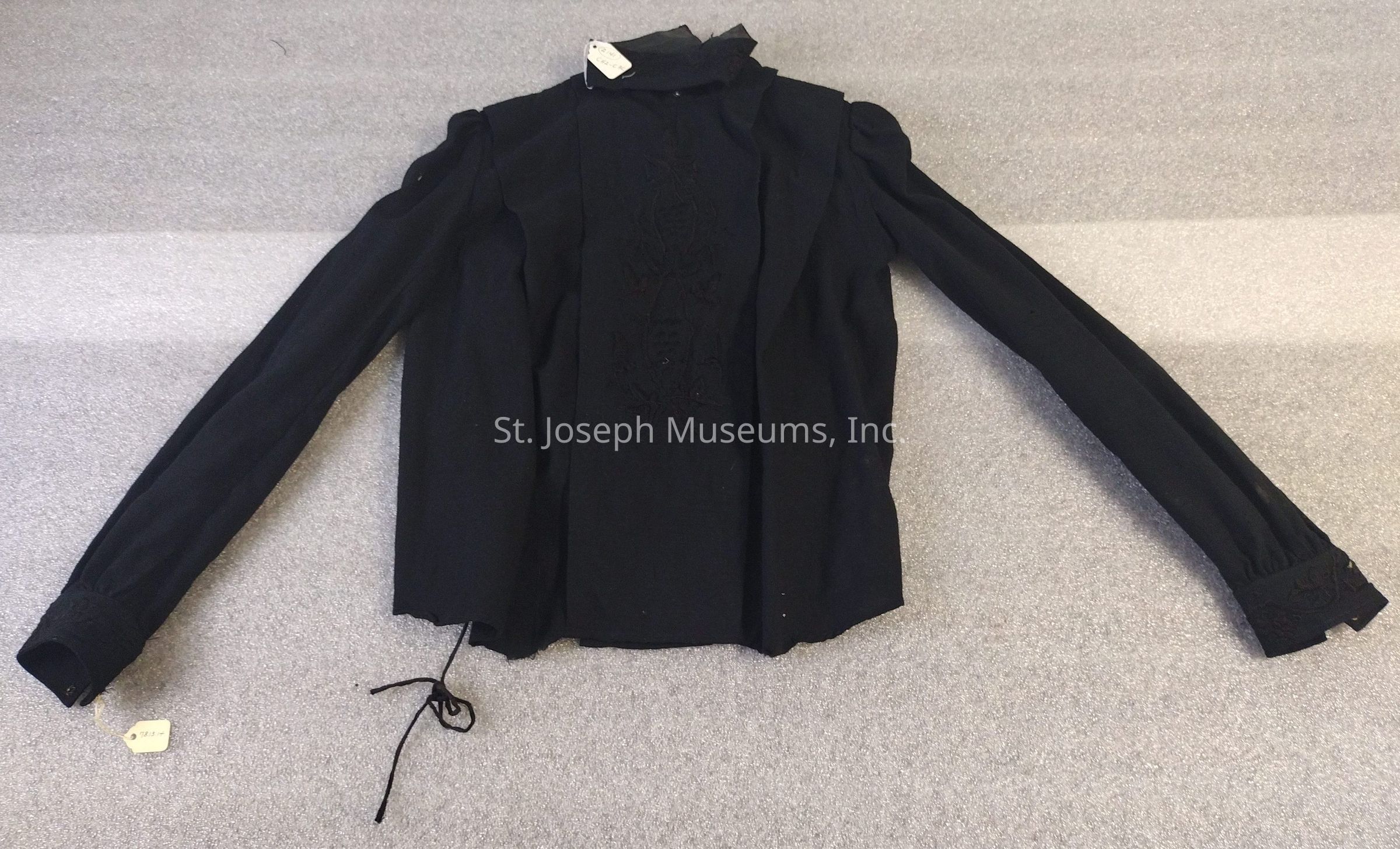 BLACK/LONG SLEEVES/EMB. ON COLLAR-CUFFS-PANEL DOWN FRONT/MADRIN COLLAR/TIES AT WAIST. No label