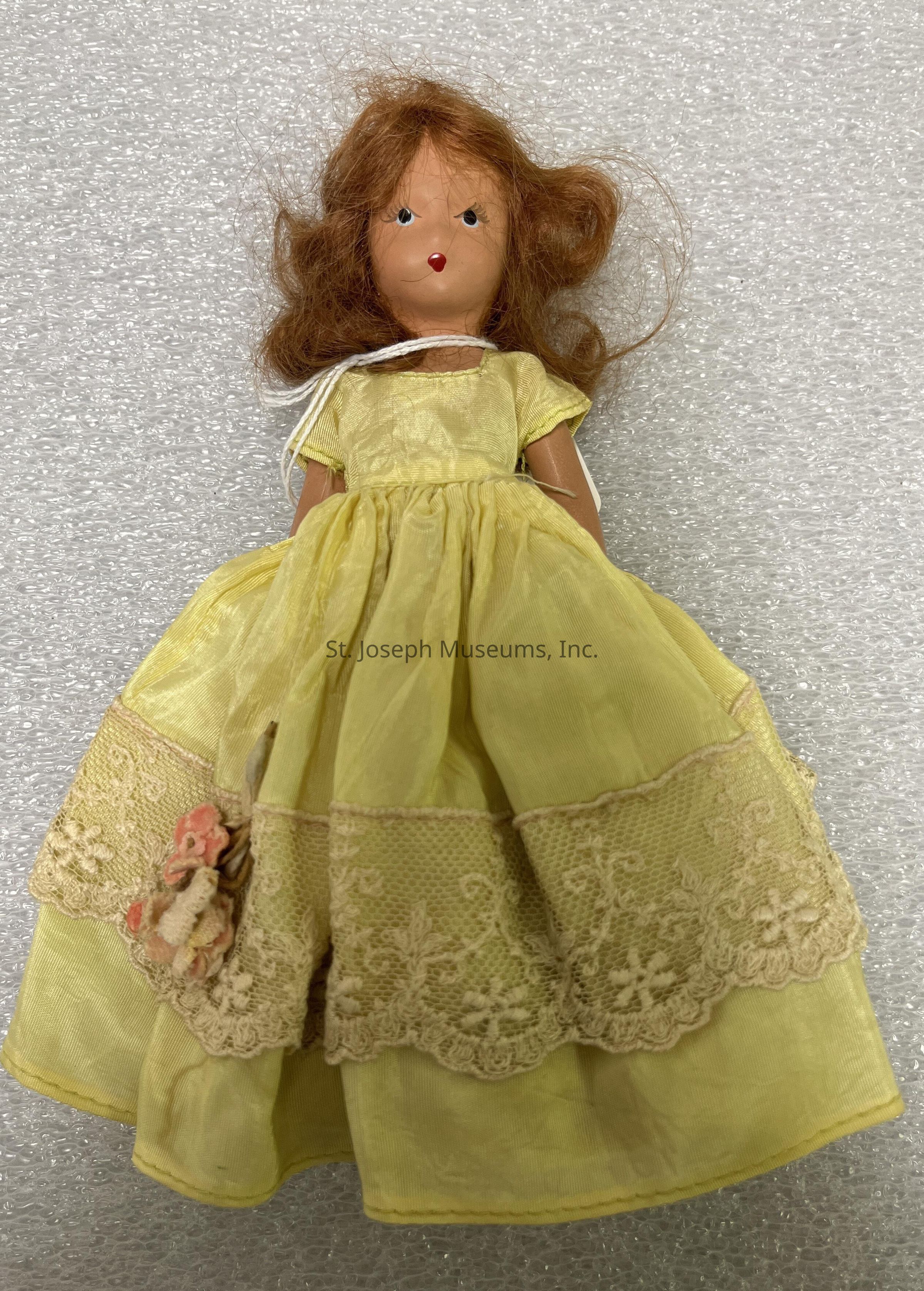 Nancy Ann Storybook Doll. Has red hair and is wearing a yellow reds with ivory lace trim and pink flower accents.