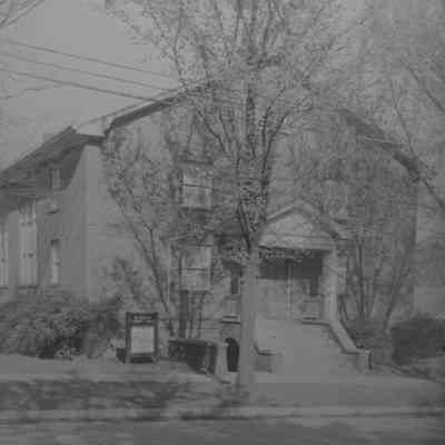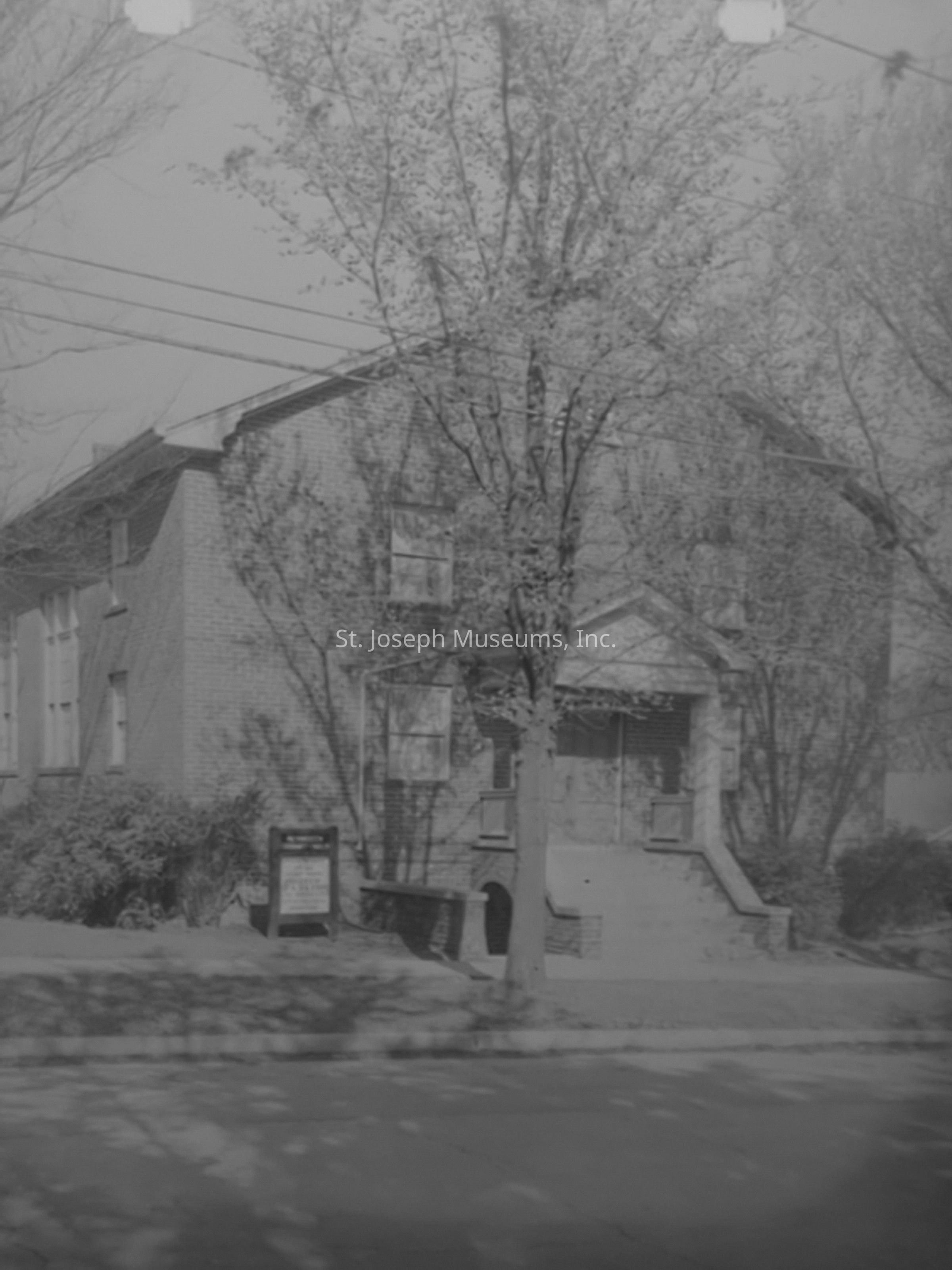 A Black-and-white image depicting Plymouth Community Church located at 1108 S. 33rd in St. Joseph, Missouri, with a brick building surrounded by leafless trees, a small sign, and steps leading to the entrance.