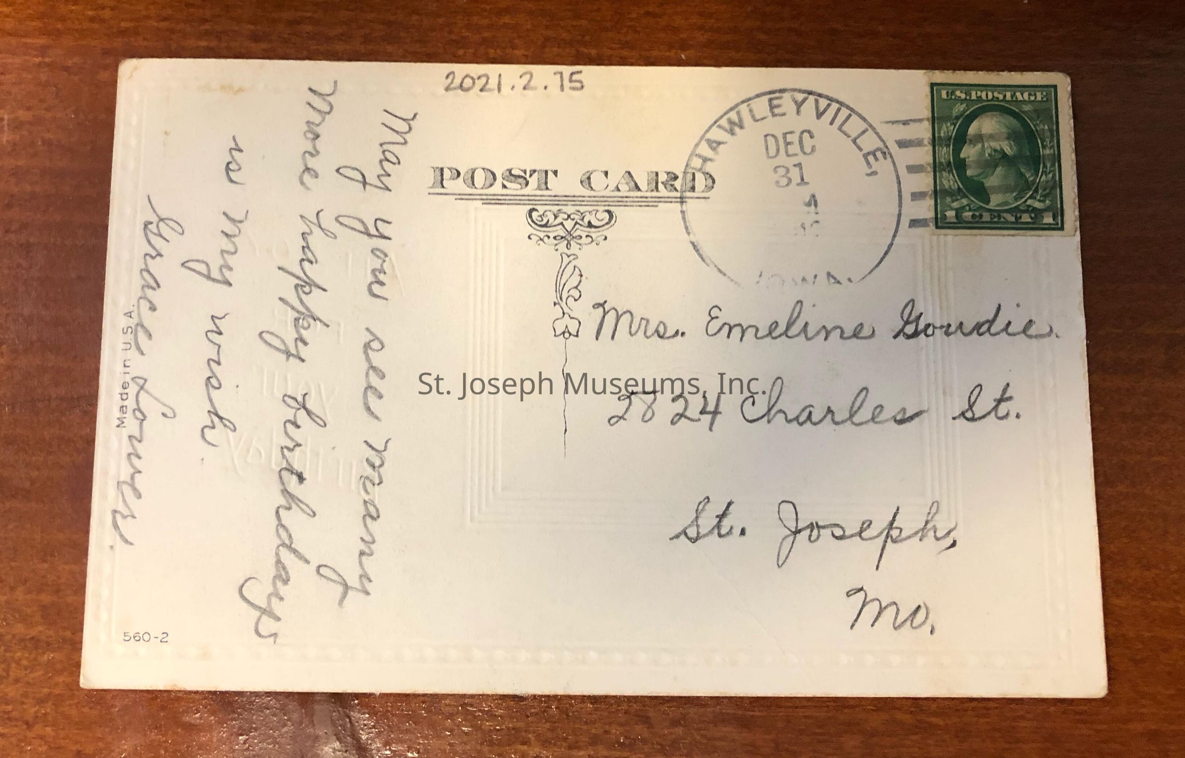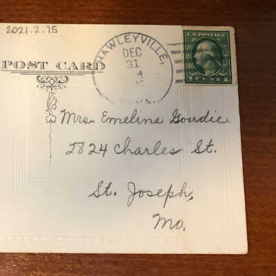 Mrs Emaline Goudie Postcard dated Dec 31, 1912.