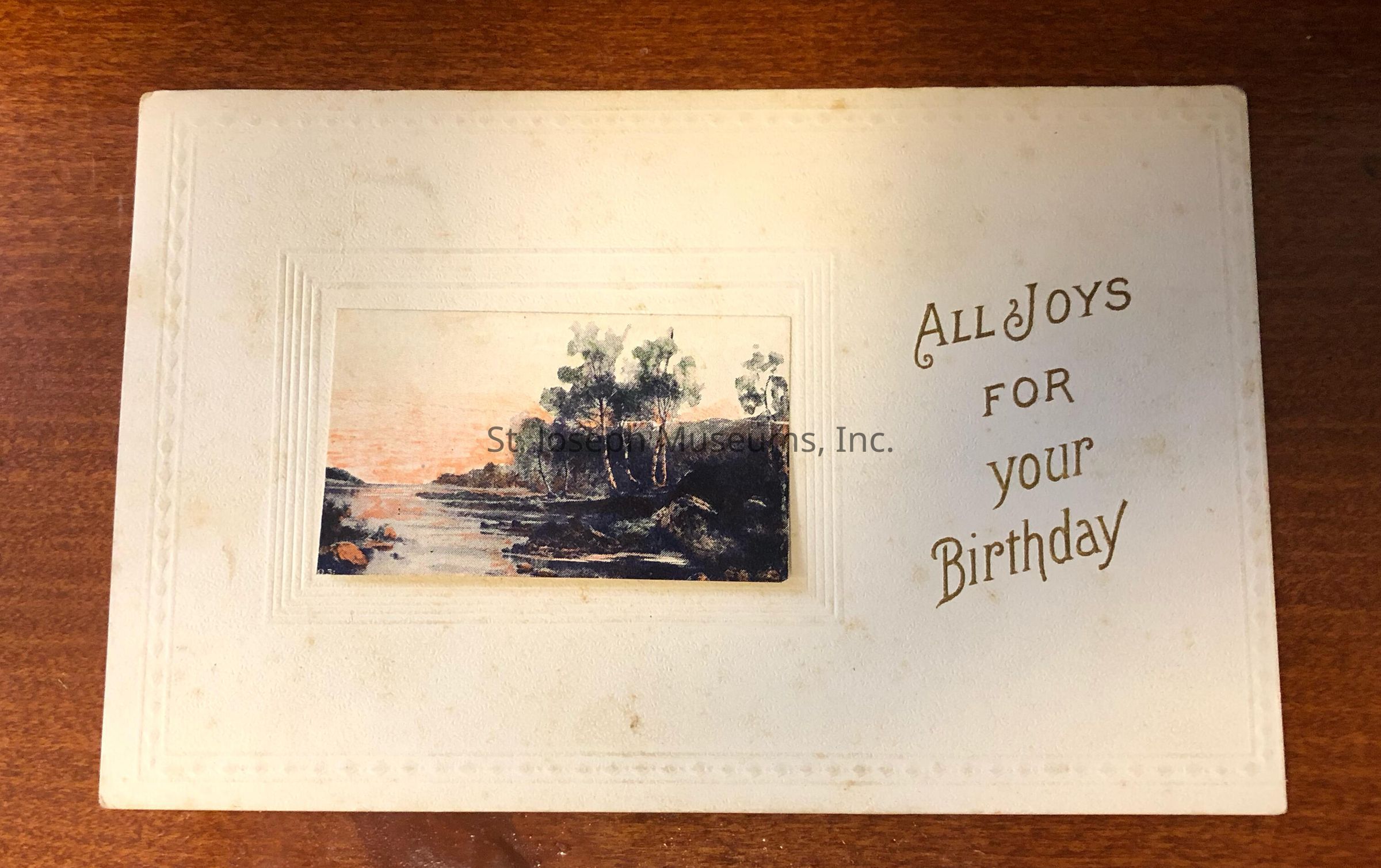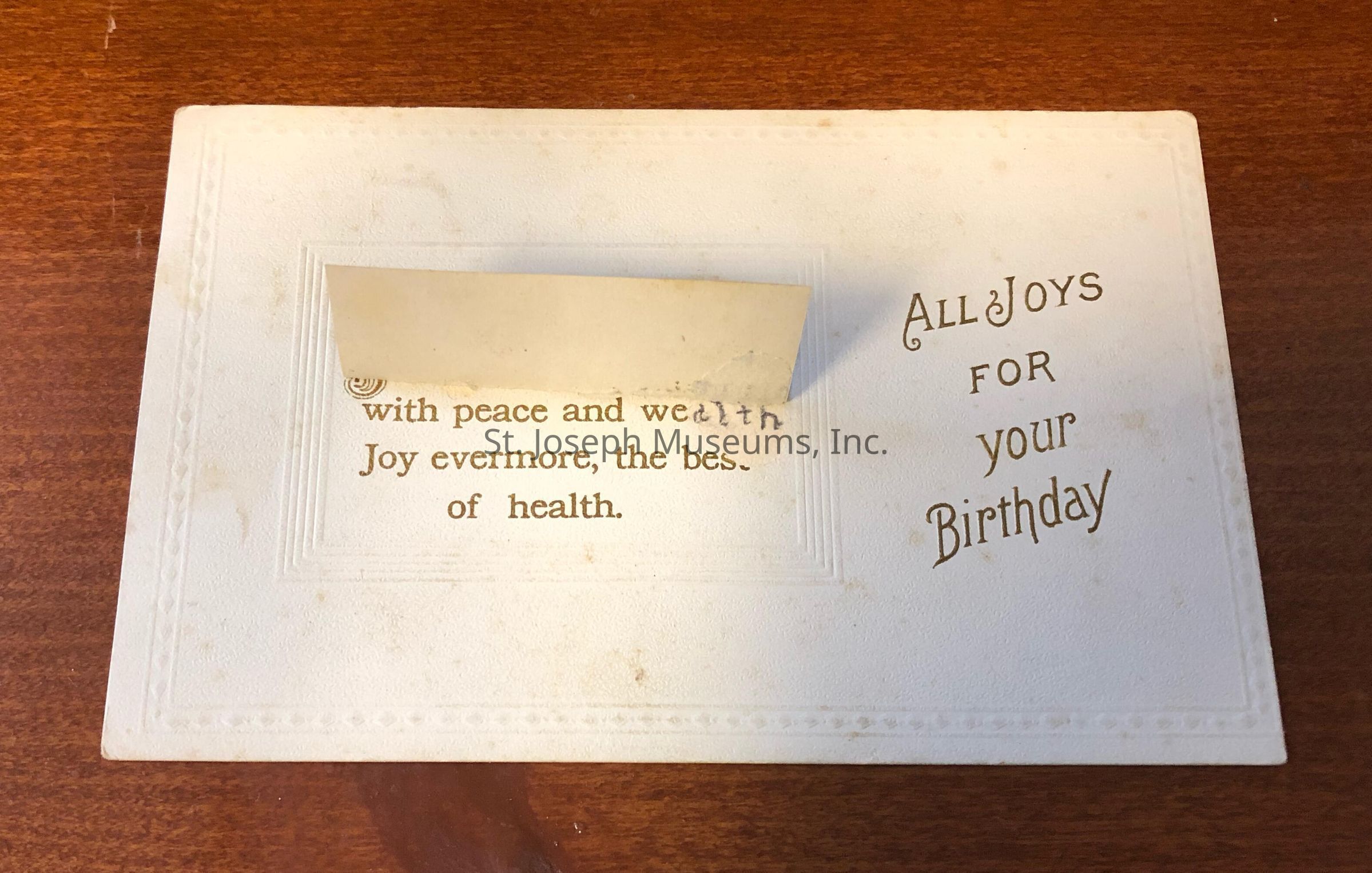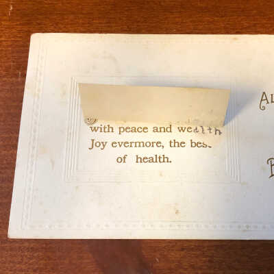 On the back of the postcard is a color image of a forest on a white background with the message "All joys for your birthday." The Image can be lifted up to reveal a second message, "With peace and wealth, joy evermore, the best of health.Context