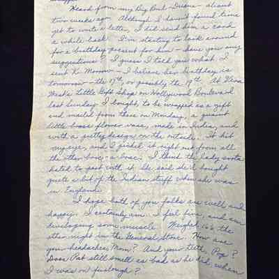Heard from my Big Bud-Duane- about two weeks ago. Although I haven't found time yet to write a letter, I did send him a card a while back. I'm starting to look around for a birthday present for him - have you any suggestions? I guess I told you what I sent K. Morrow - I believe her birthday is tomorrow - the 17th, or possibly the 19th. At Vera West's Little Gift Shop on Hollywood Boulevard last Sunday I bought, to be wrapped as a gift and mailed from there on Monday, a quaint little brass flower vase, made in India, and with a pretty design on the outside. It hit my eye, and I picked it right out from all the other bric-a-brac. I think the lady sorta hated to part with it. She said she'd bought quite a bit of the Indian stuff when she was in England.