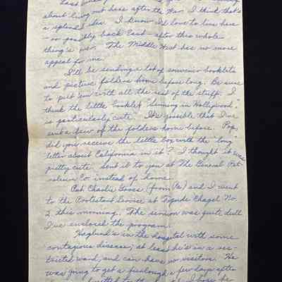 I'll be sending a lot of souvenir booklets and picture folders home before long. Be sure to put 'em with all the rest of the stuff. I think the little booklet "Sinning in Hollywood," is particularly "cute." It's possible that I've sent a few of the folders home before. Pop, did you receive the little box with the "long" letter about California in it? I thought it was pretty cute. Sent it to you at The General Petroleum Co. instead of home.